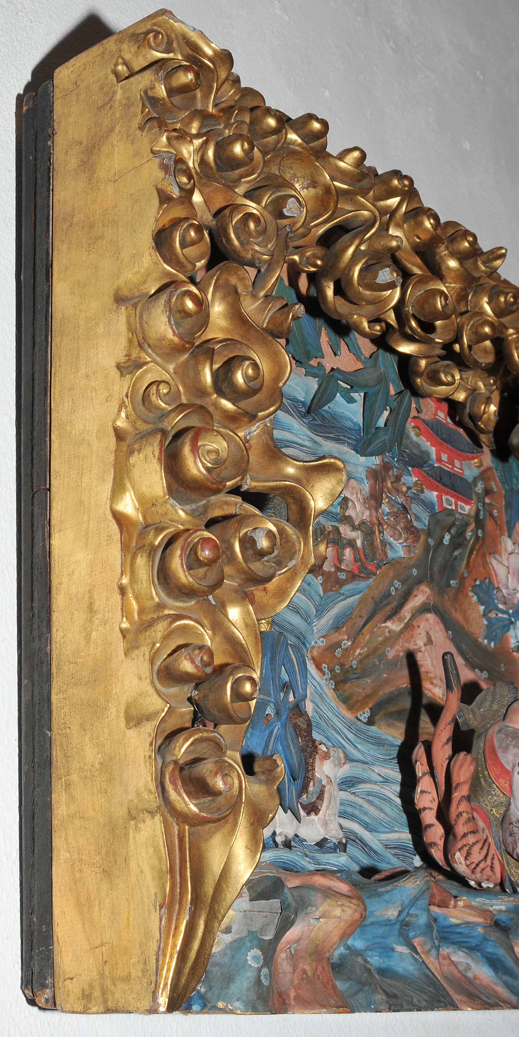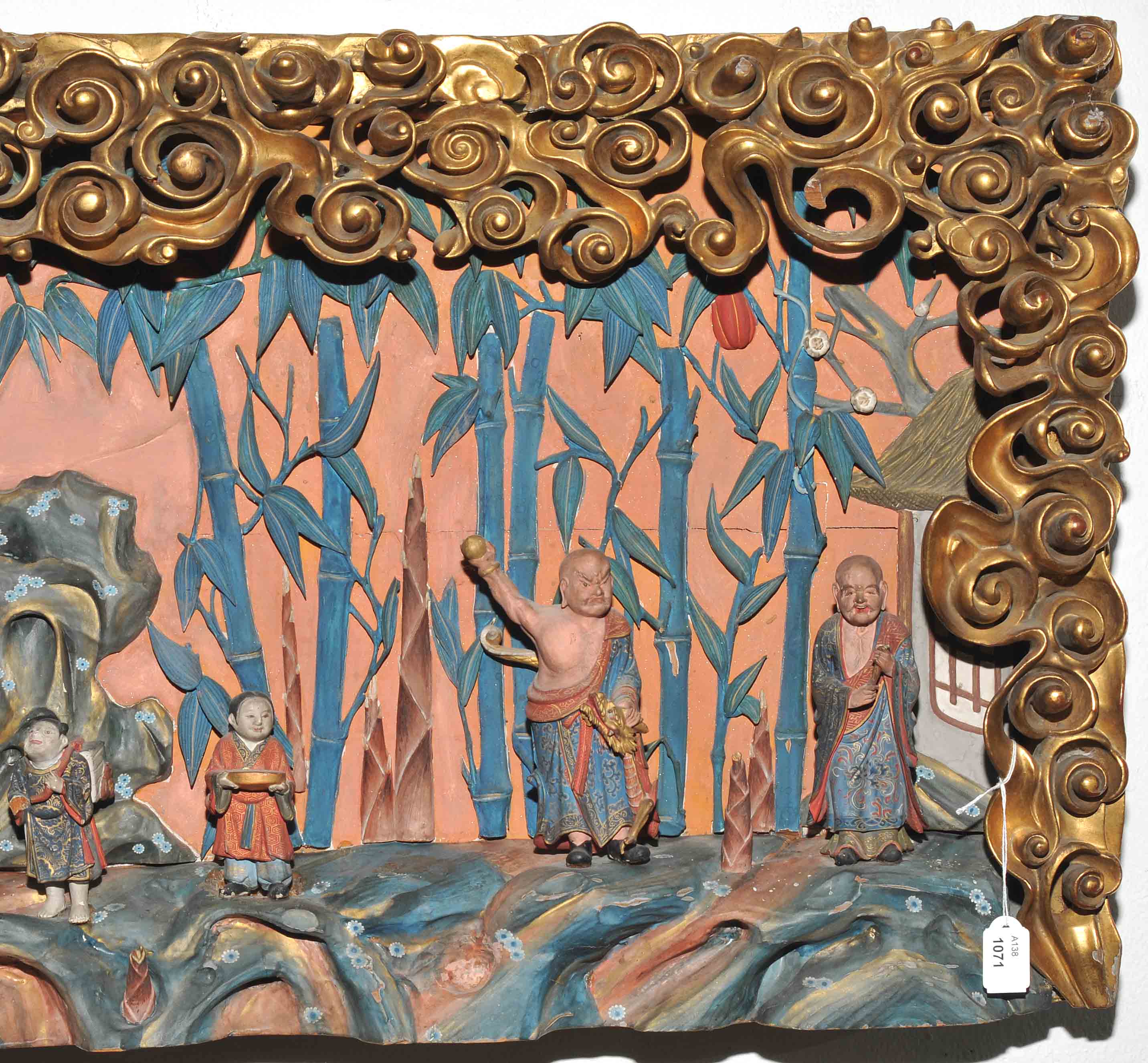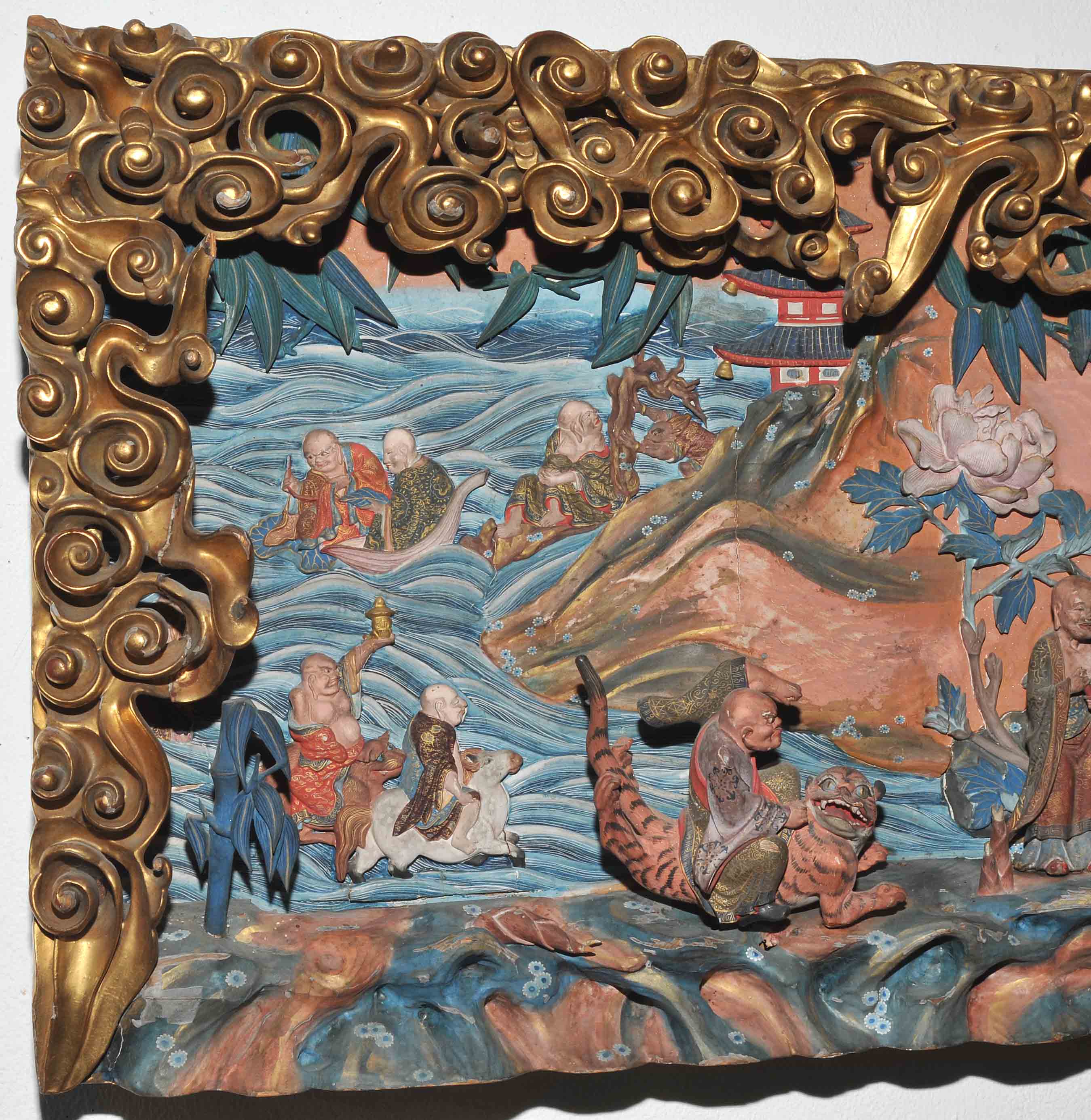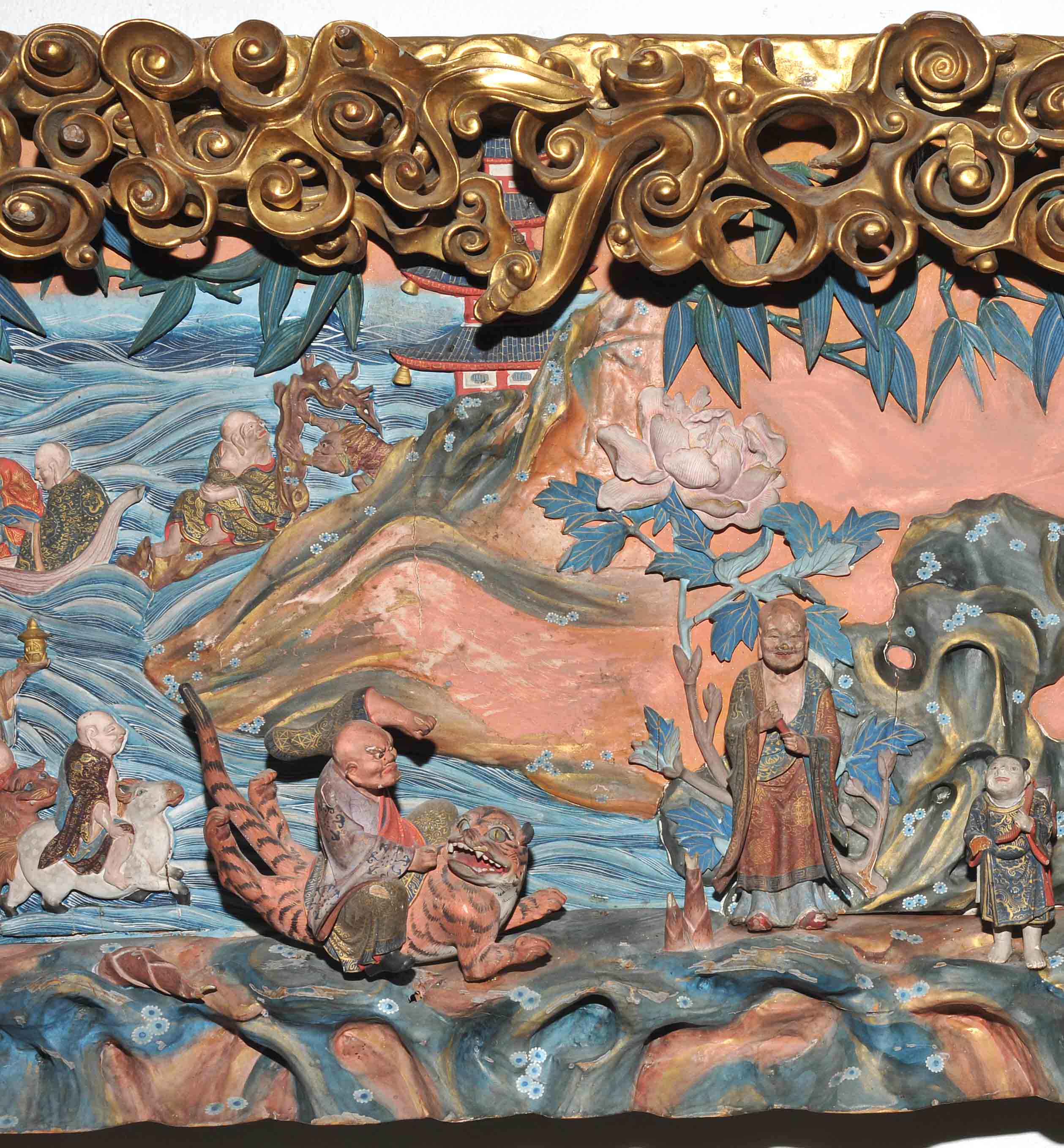 China, 19.Jh. Holz, geschnitzt, polychrom bemalt und vergoldet. Lange Rechteckform. Darstellung von Arhats und Gefolge in einer Szenerie mit Bambushain, Felsen mit Päonien sowie Seelandschaft als Hintergrund. Umrahmt von goldenen, stilisierten Wolken. Fehl- und Schadstellen. 39x92 cm.