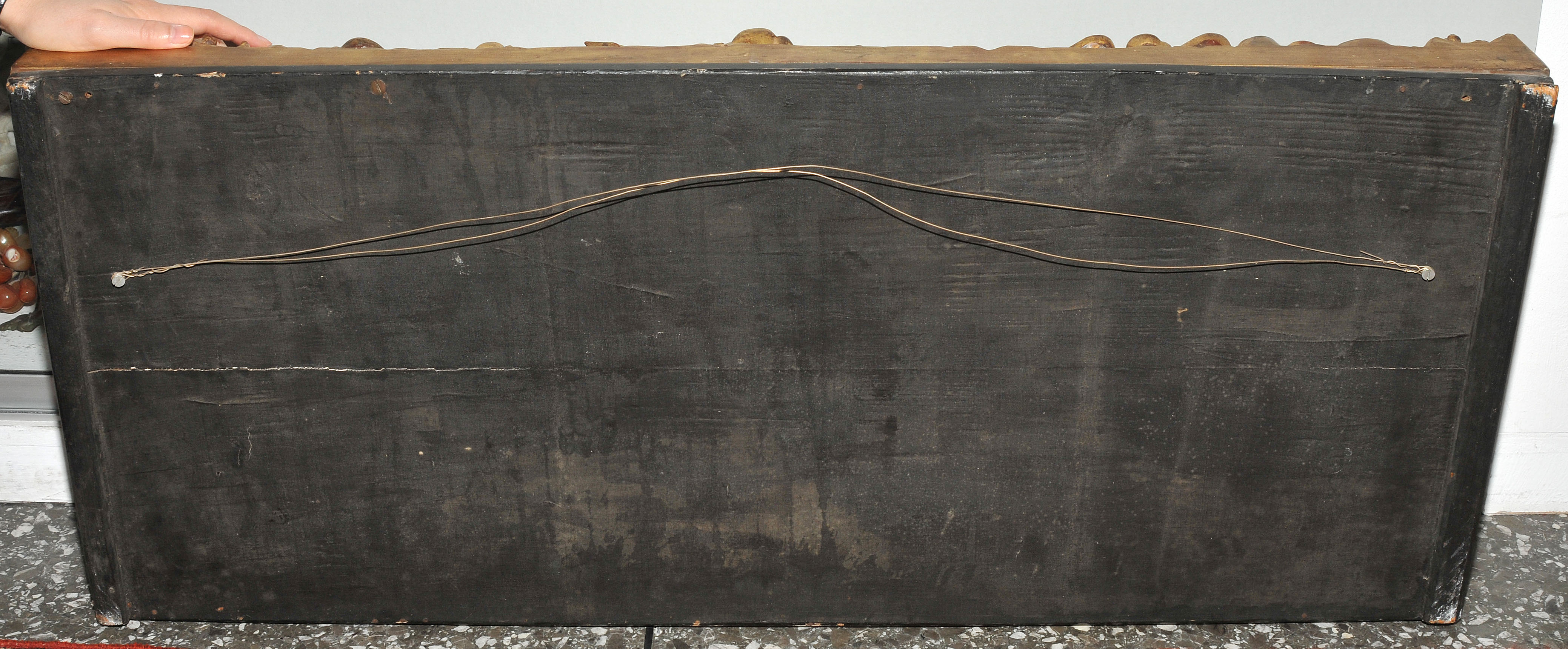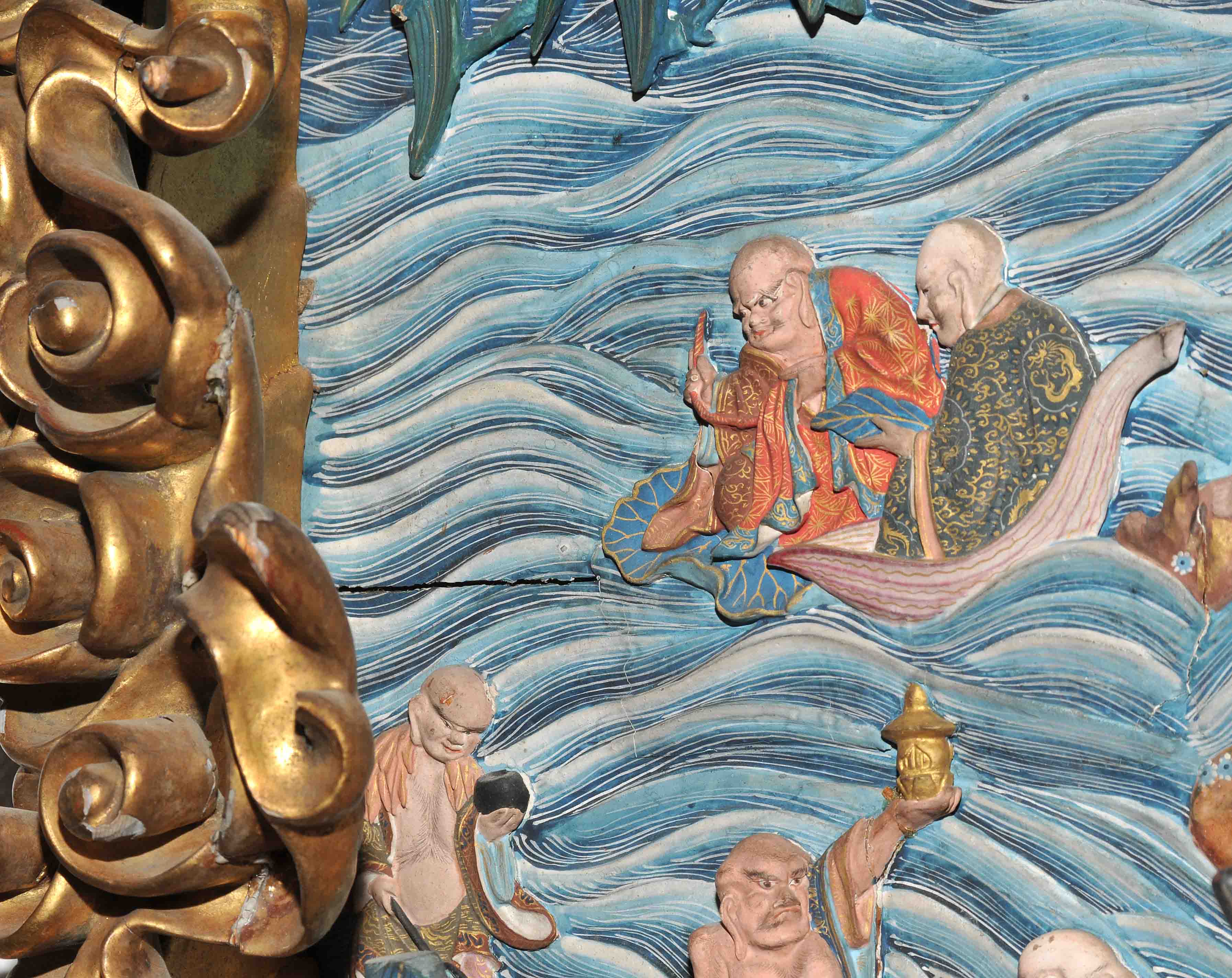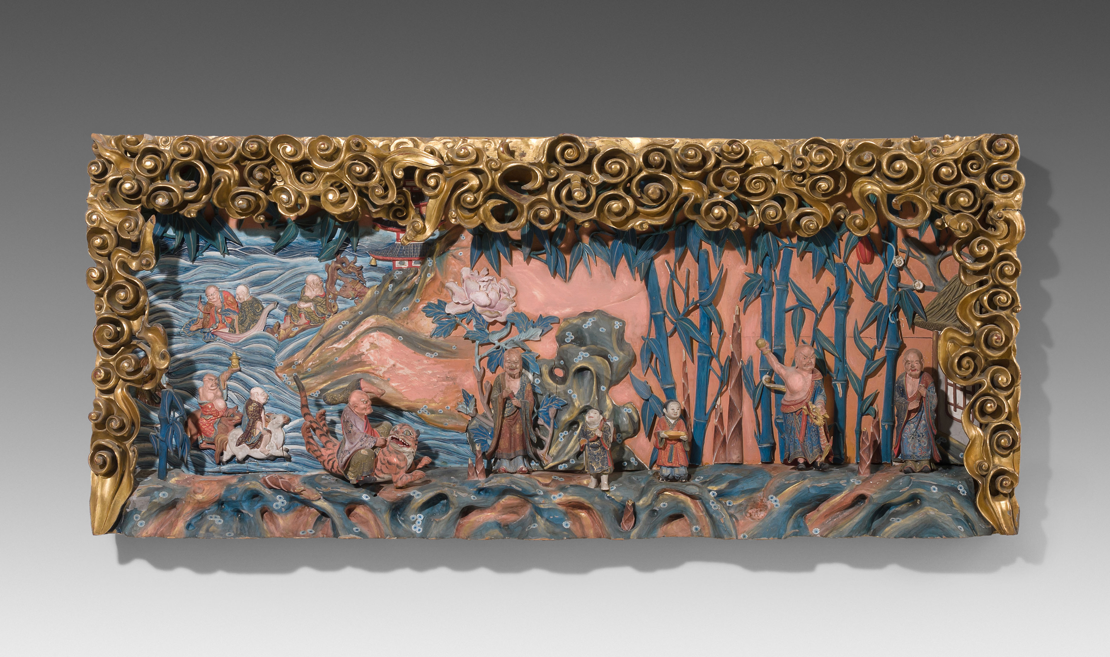 China, 19.Jh. Holz, geschnitzt, polychrom bemalt und vergoldet. Lange Rechteckform. Darstellung von Arhats und Gefolge in einer Szenerie mit Bambushain, Felsen mit Päonien sowie Seelandschaft als Hintergrund. Umrahmt von goldenen, stilisierten Wolken. Fehl- und Schadstellen. 39x92 cm.