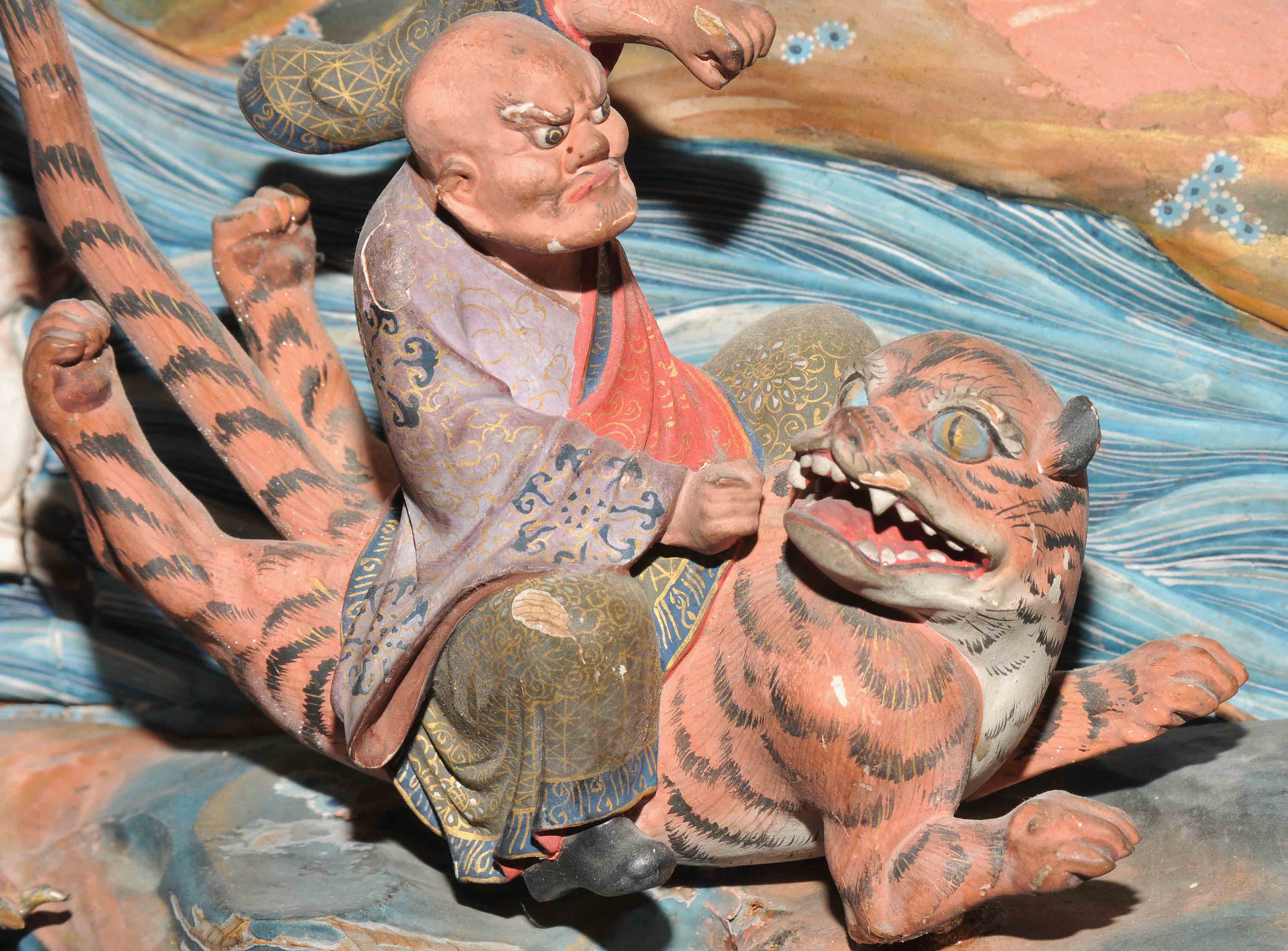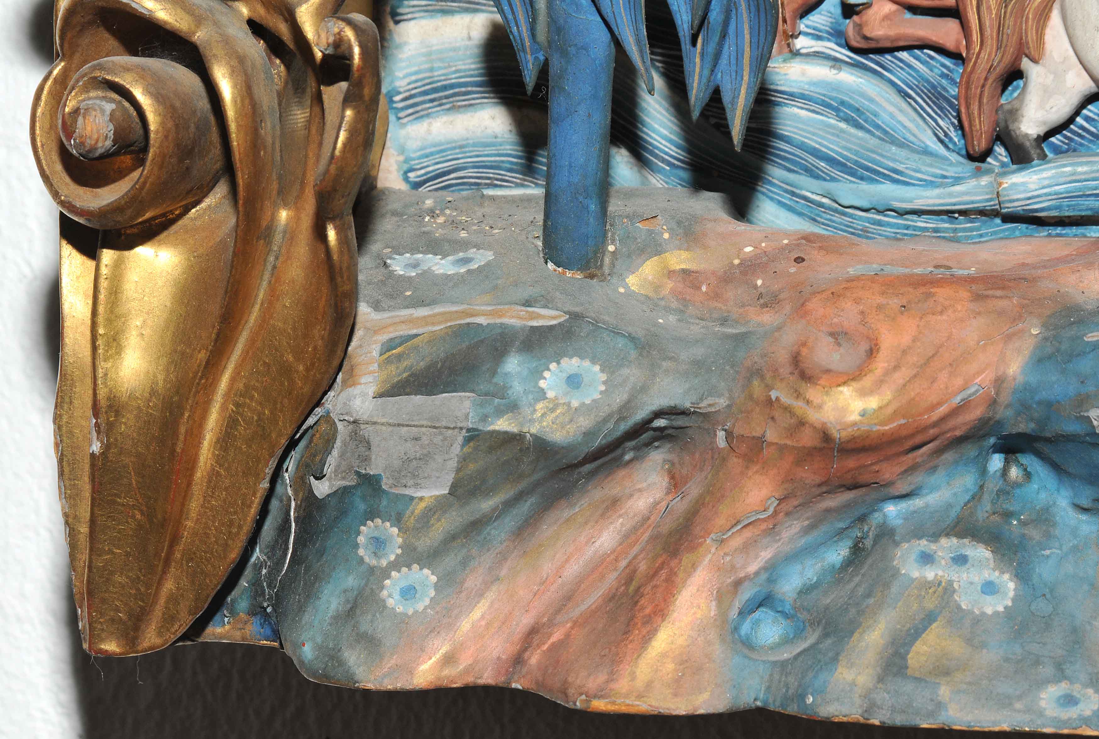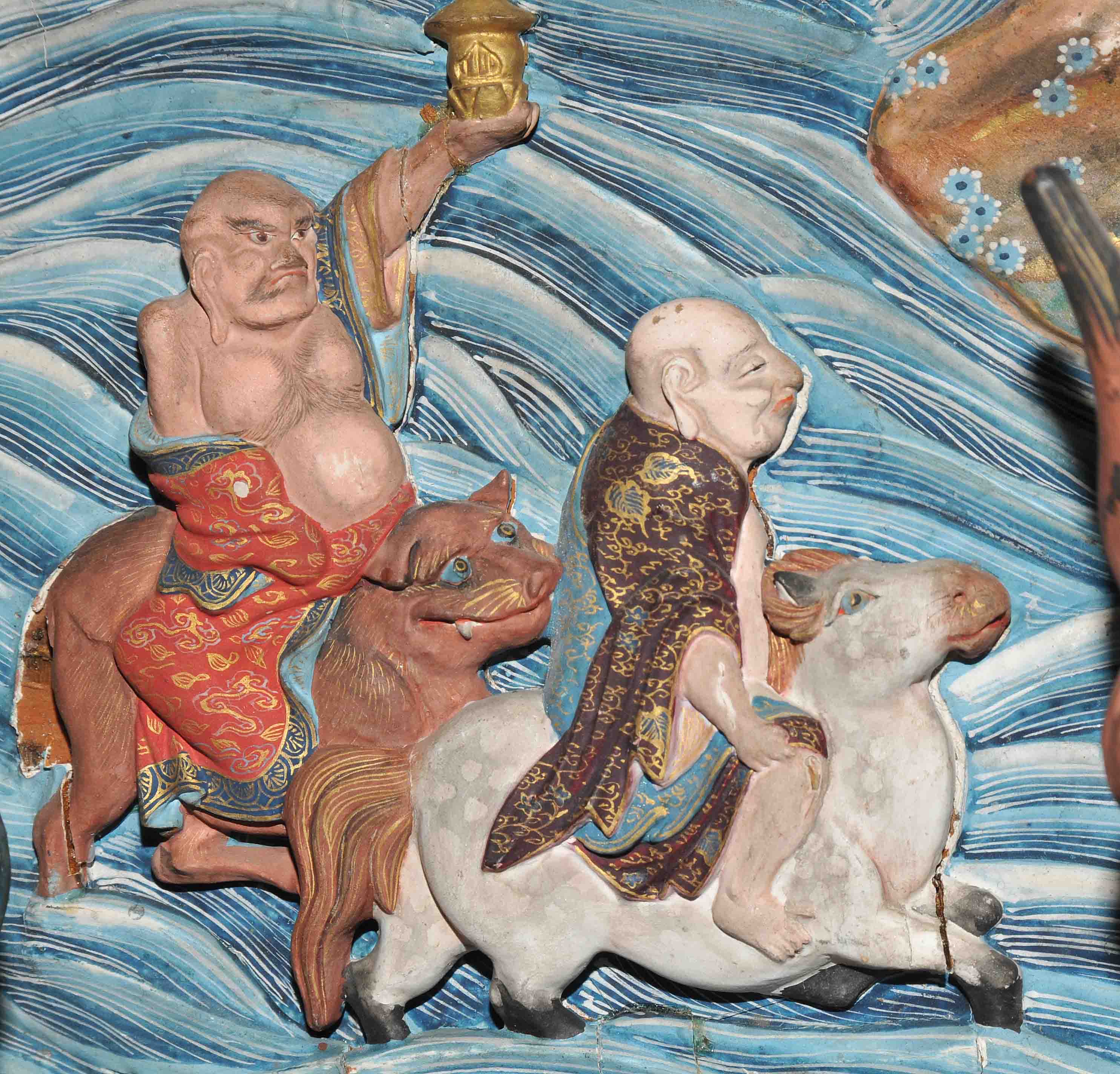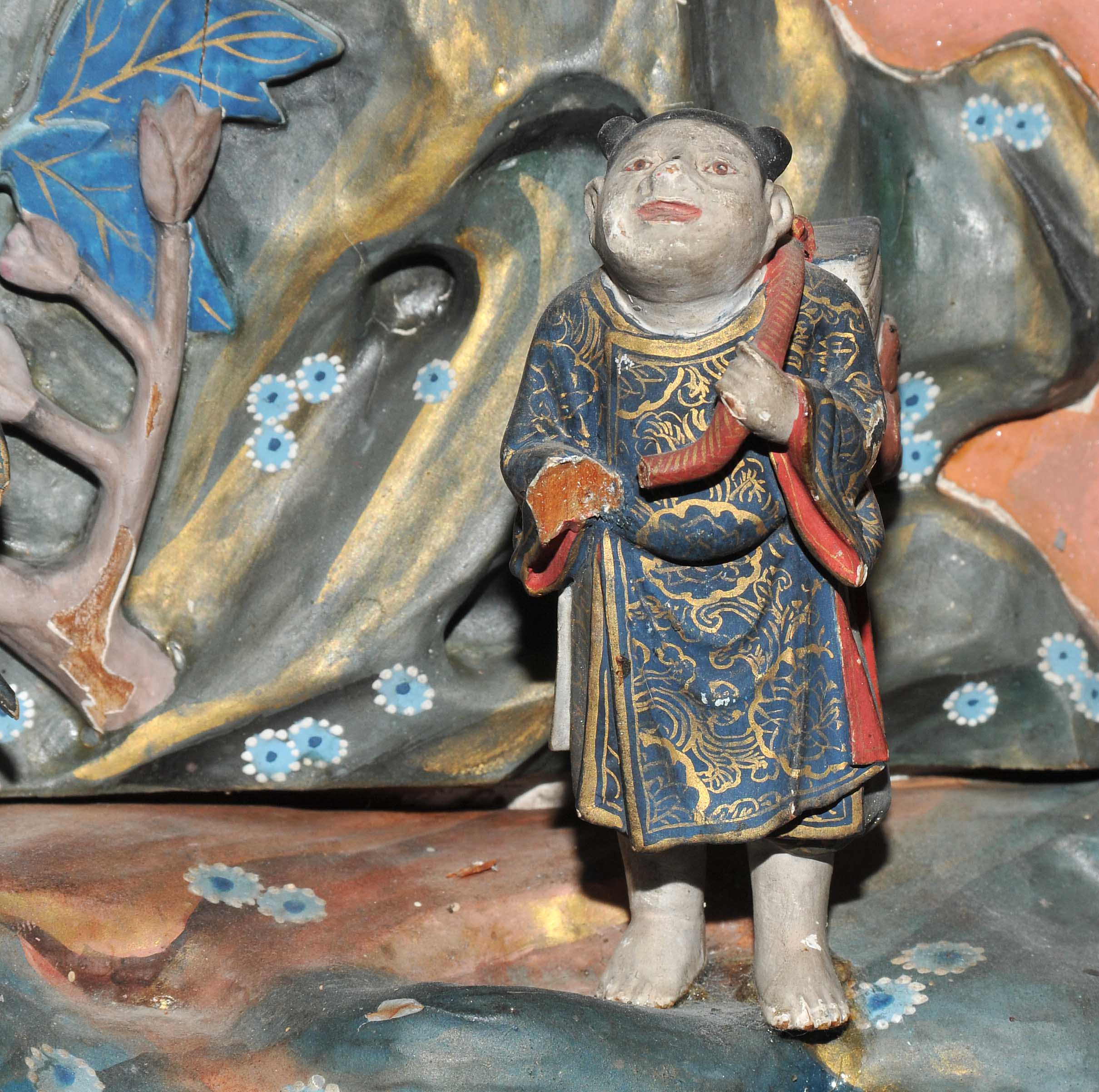 China, 19.Jh. Holz, geschnitzt, polychrom bemalt und vergoldet. Lange Rechteckform. Darstellung von Arhats und Gefolge in einer Szenerie mit Bambushain, Felsen mit Päonien sowie Seelandschaft als Hintergrund. Umrahmt von goldenen, stilisierten Wolken. Fehl- und Schadstellen. 39x92 cm.