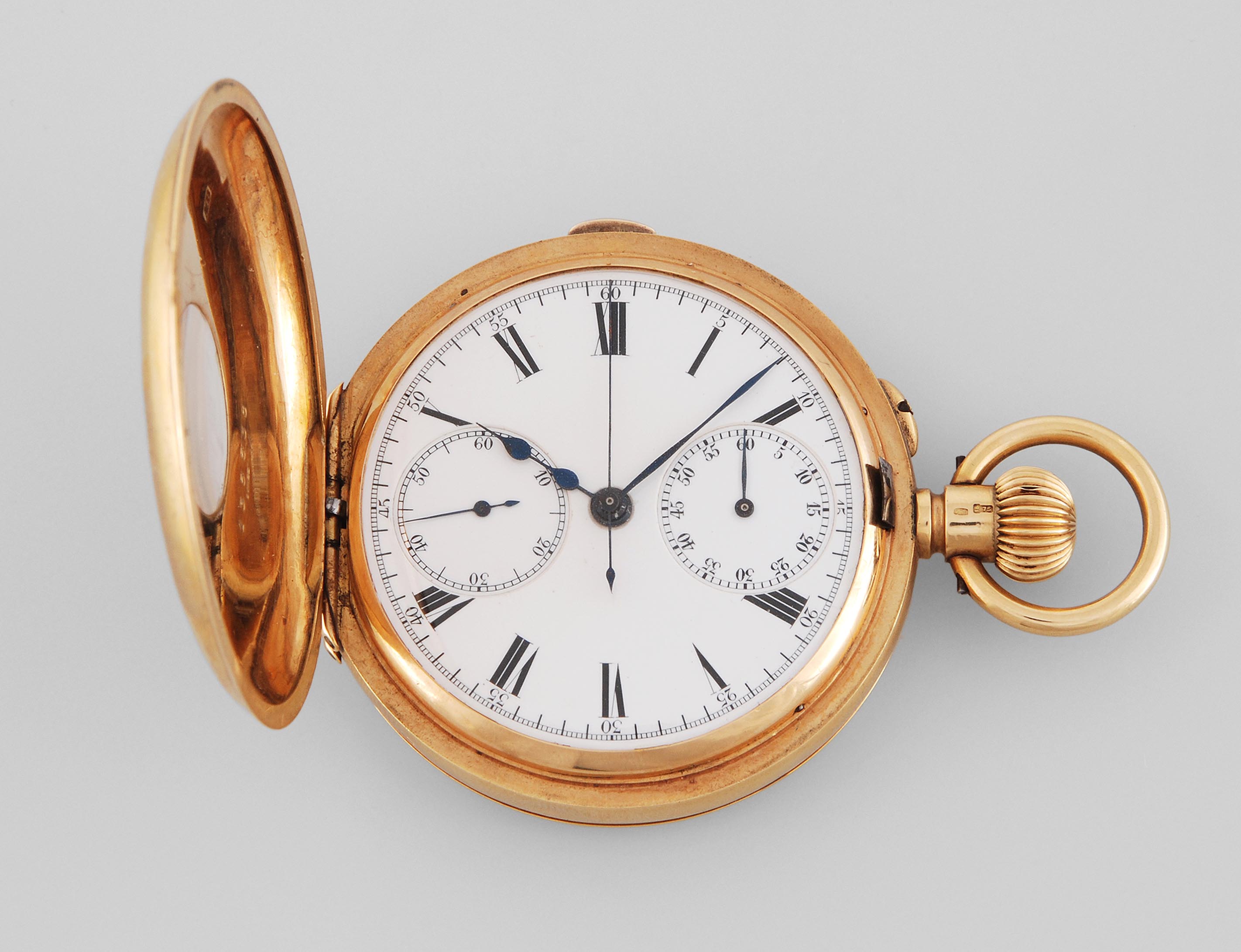 Runde, mechanische Herrensavonnette mit Schaltradchronograph in 750 Gelbgoldgehäuse ca 60 g. Referenznummer 135538, D 51 mm. Rückendeckel mit Ligaturinitialen JH, Frontdeckel mit Sichtglas auf das Werk und gravierte, schwarze, römische Stundenzahlen. Weisses Emailzifferblatt mit schwarzen, römischen Stundenzahlen, Minuten-, Sekundenzahlen und -indizes im äusseren Zifferring. Gebläute Fantasie-Zeiger, zentraler Chronographenzeiger, kleine Sekundenanzeige bei 9 Uhr, kleine 60 Minutenanzeige bei 3 Uhr. Krone, Drücker für den Frontdeckel, Bügel bei 3 Uhr, Drücker für den Chronographen bei 12 Uhr, Drücker für die Zeiteinstellung bei 2 Uhr. Gebrauchsspuren.