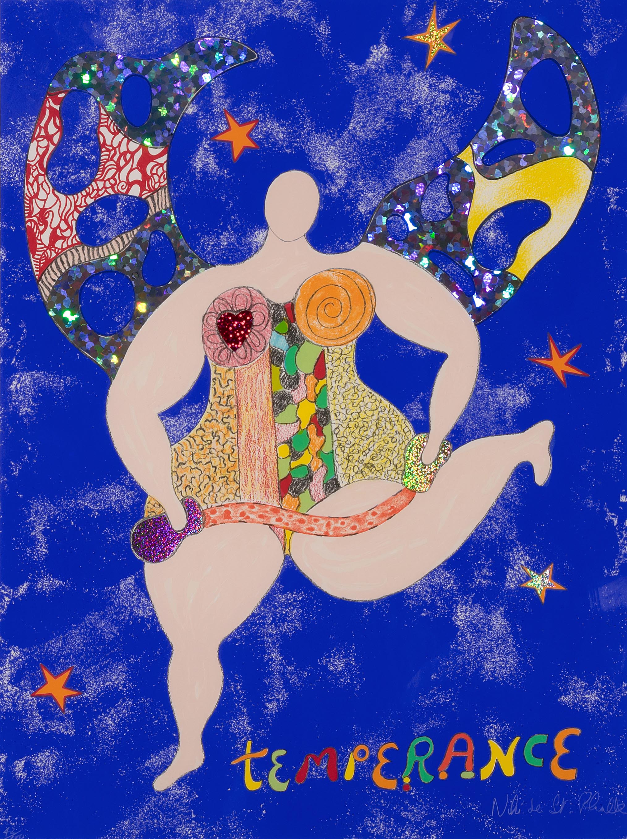 Temperance. Farblithographie mit Silberfolie-Applikationen. 42/100. Unten rechts mit weissem Buntstift signiert. Lichtmass 73x55 cm. Gerahmt. -Blatt wurde zwischen Passepartout und Rückwand montiert.