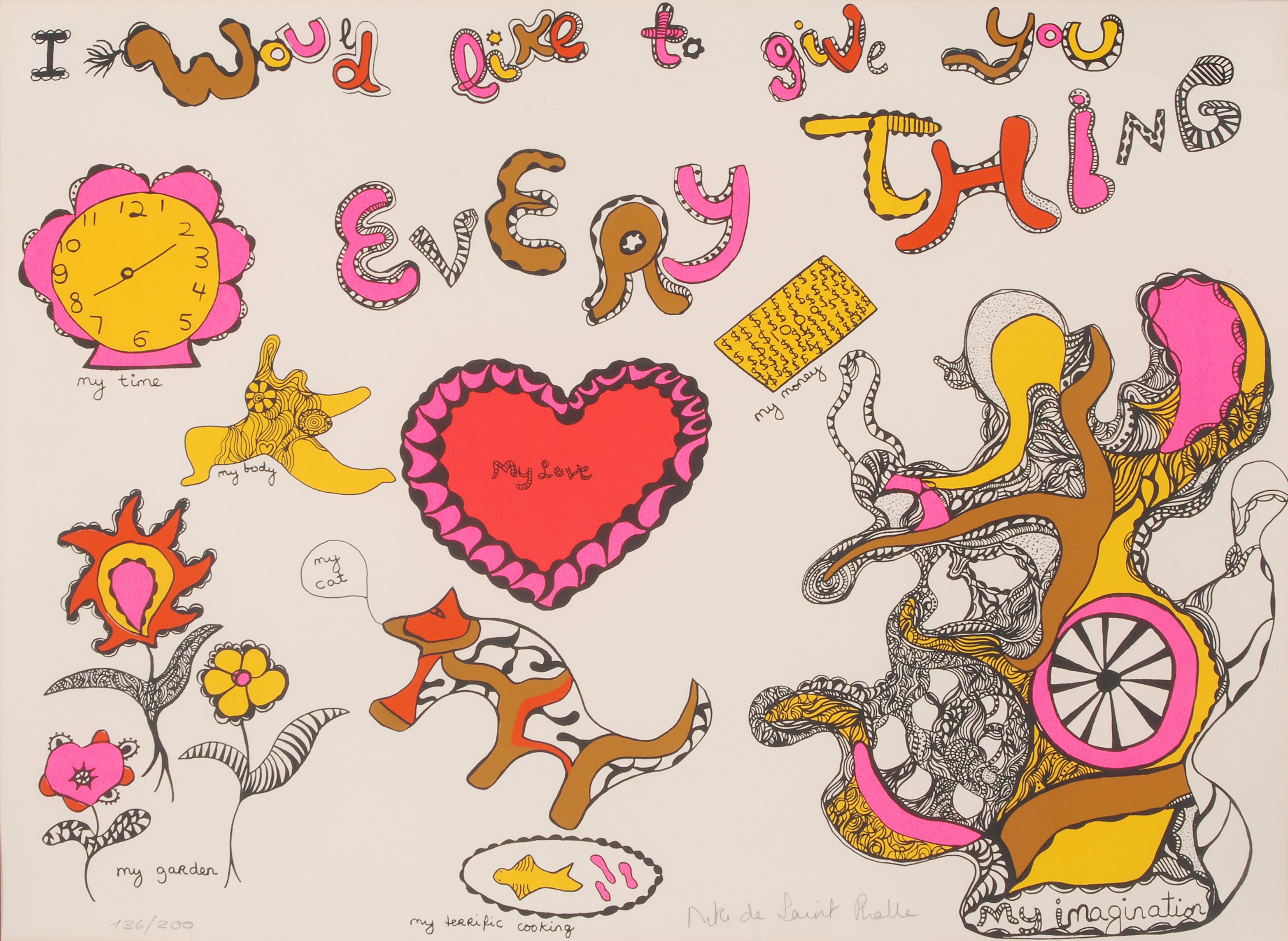 "I would like to give you everything". Farbserigraphie. 136/200. Unten rechts in Bleistift signiert. Blattgrösse 50,5x 65 cm. Gerahmt. -Blatt minimst gebräunt. Wenige, kleine Knitter. Verso am oberen Rand zwei Klebspurreste.