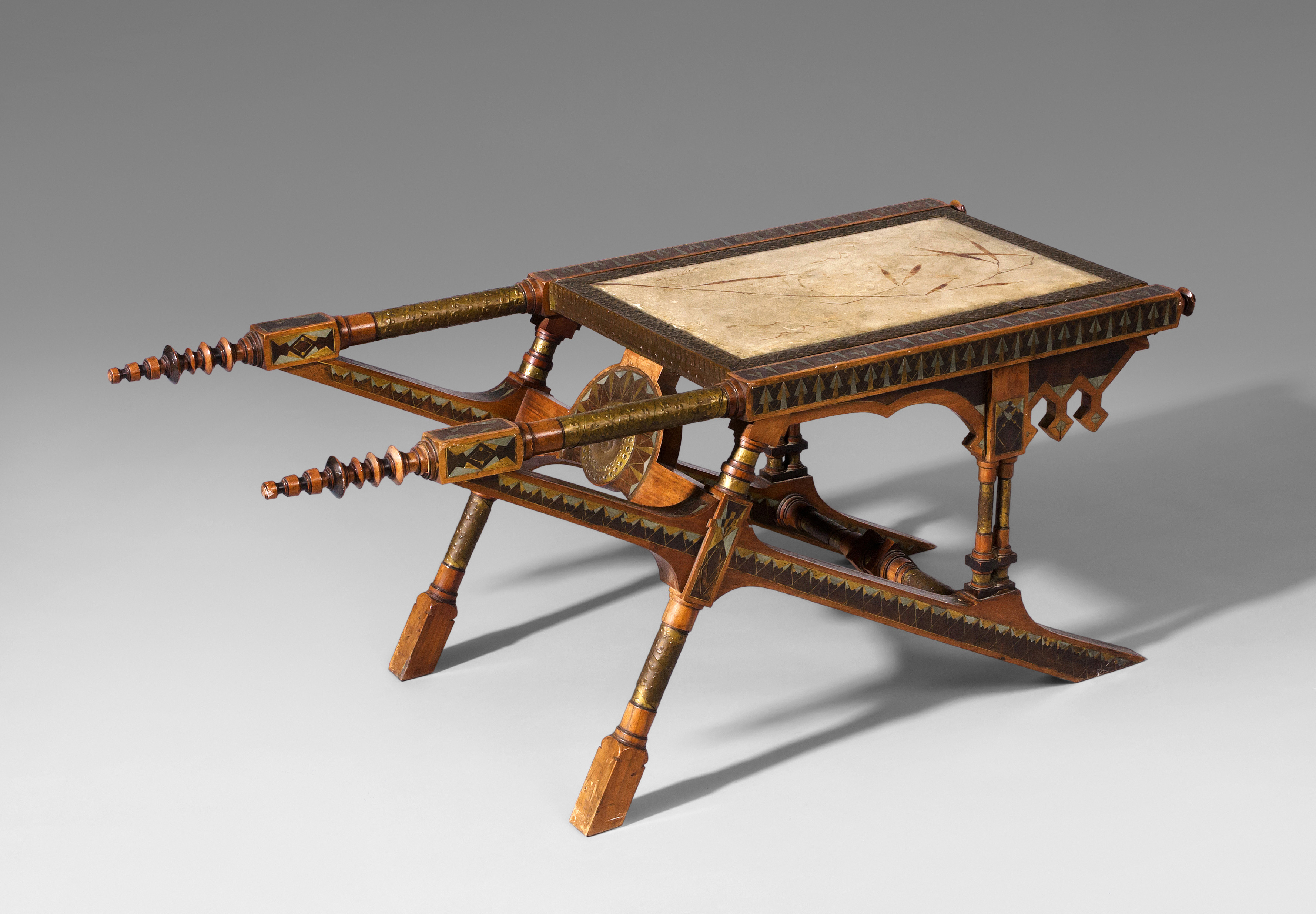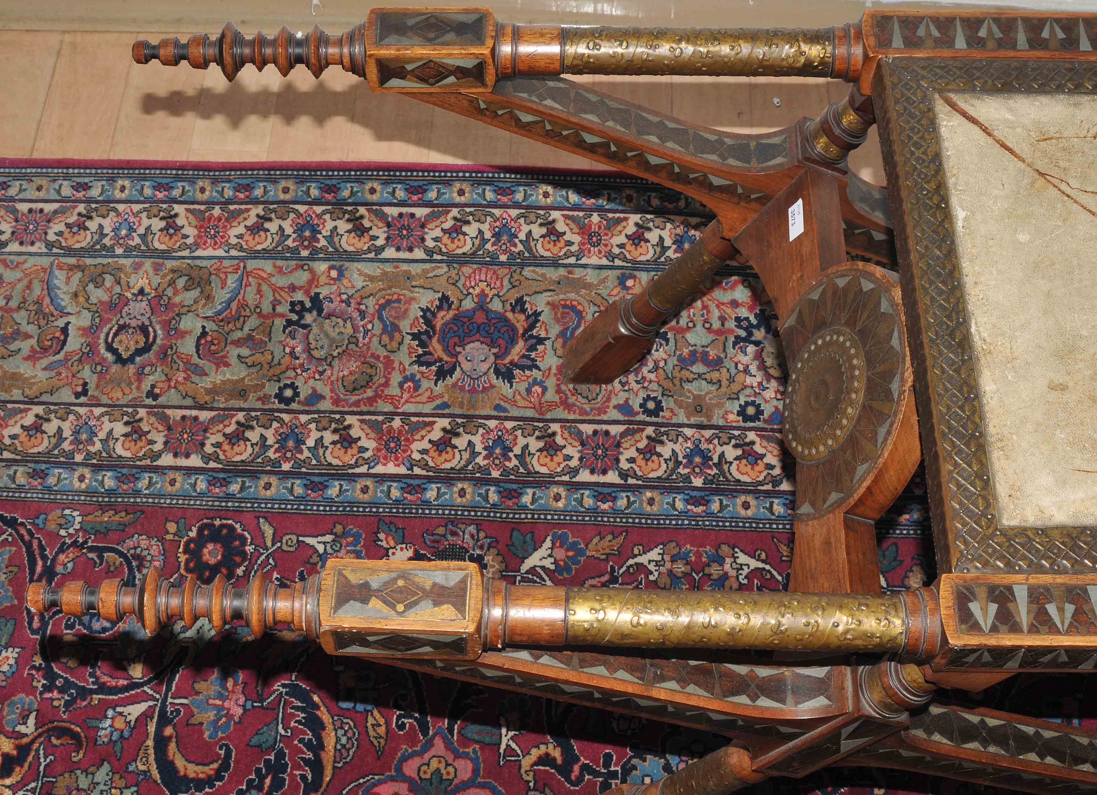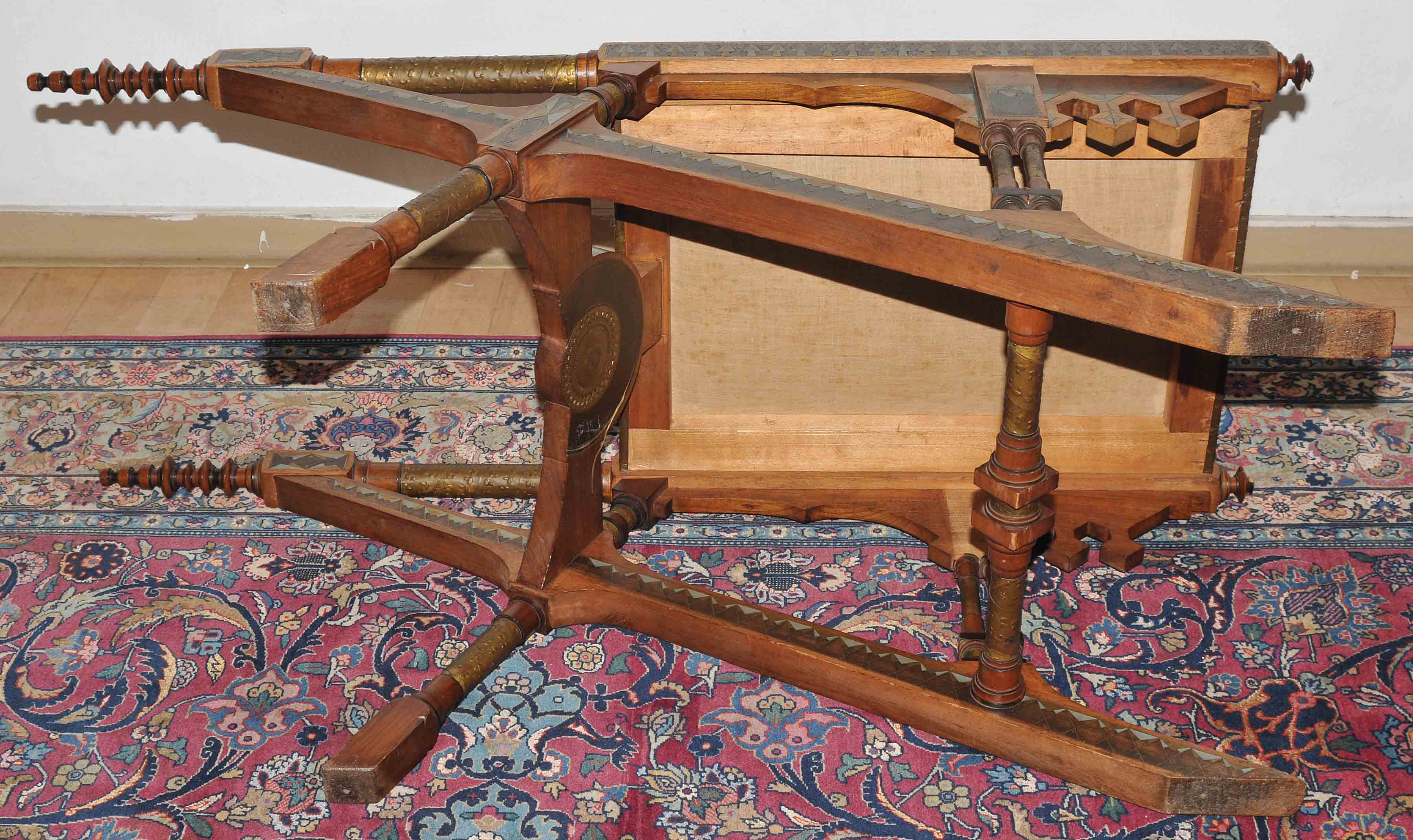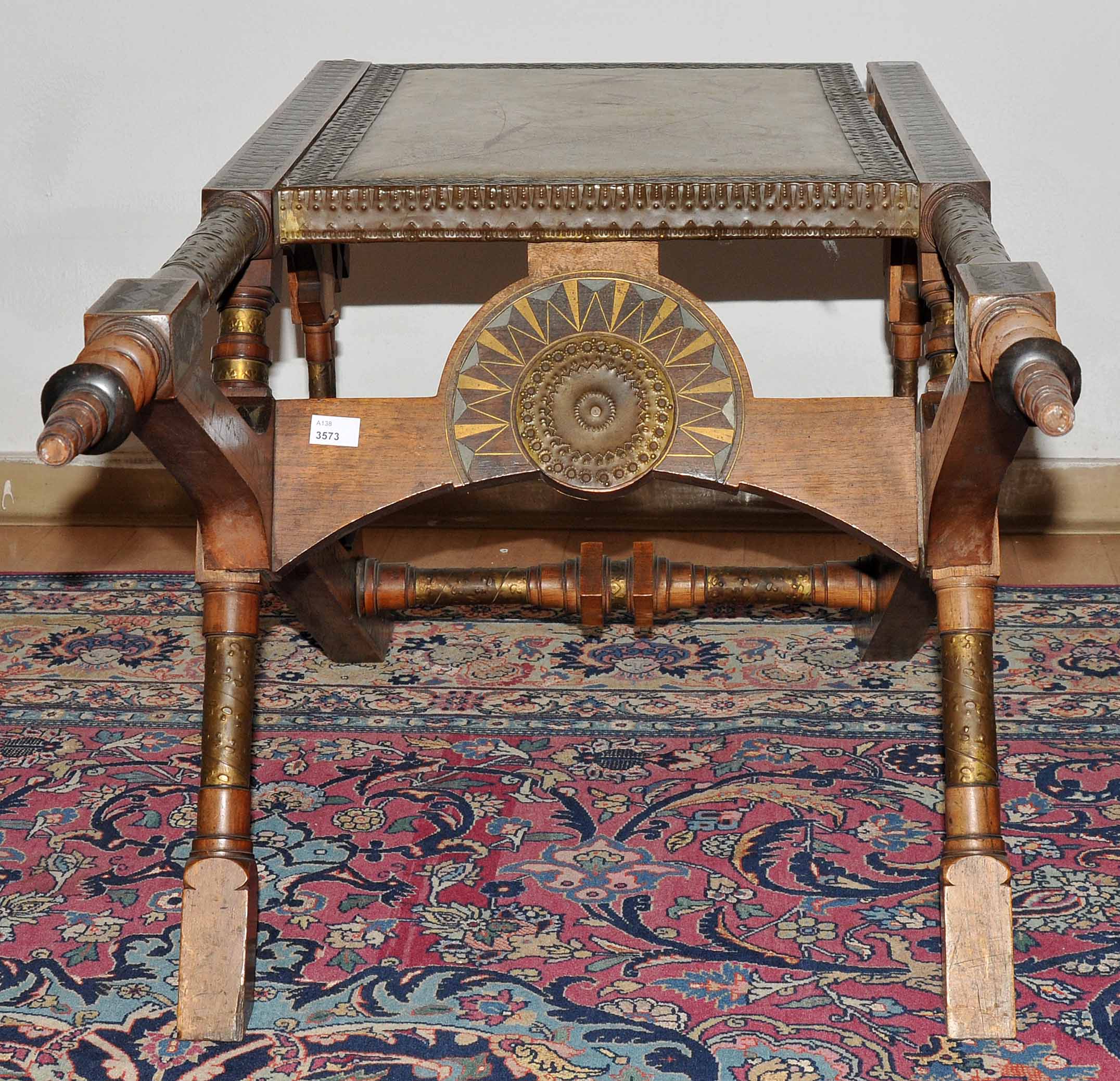 Carlo Bugatti um 1900, (16. Februar 1856 in Mailand; † 31. März 1940 in Molsheim). Hartholz dunkel gebeizt mit feinen Kupfer-, resp. Zinneinlagen und gehämmertem Kupferblech. Rechteckige Sitzfläche mit beigem Lederbezug. Reste von vegetabiler Bemalung und Signatur. Zu restaurieren. Gebrauchsspuren. 99x41x41 cm.