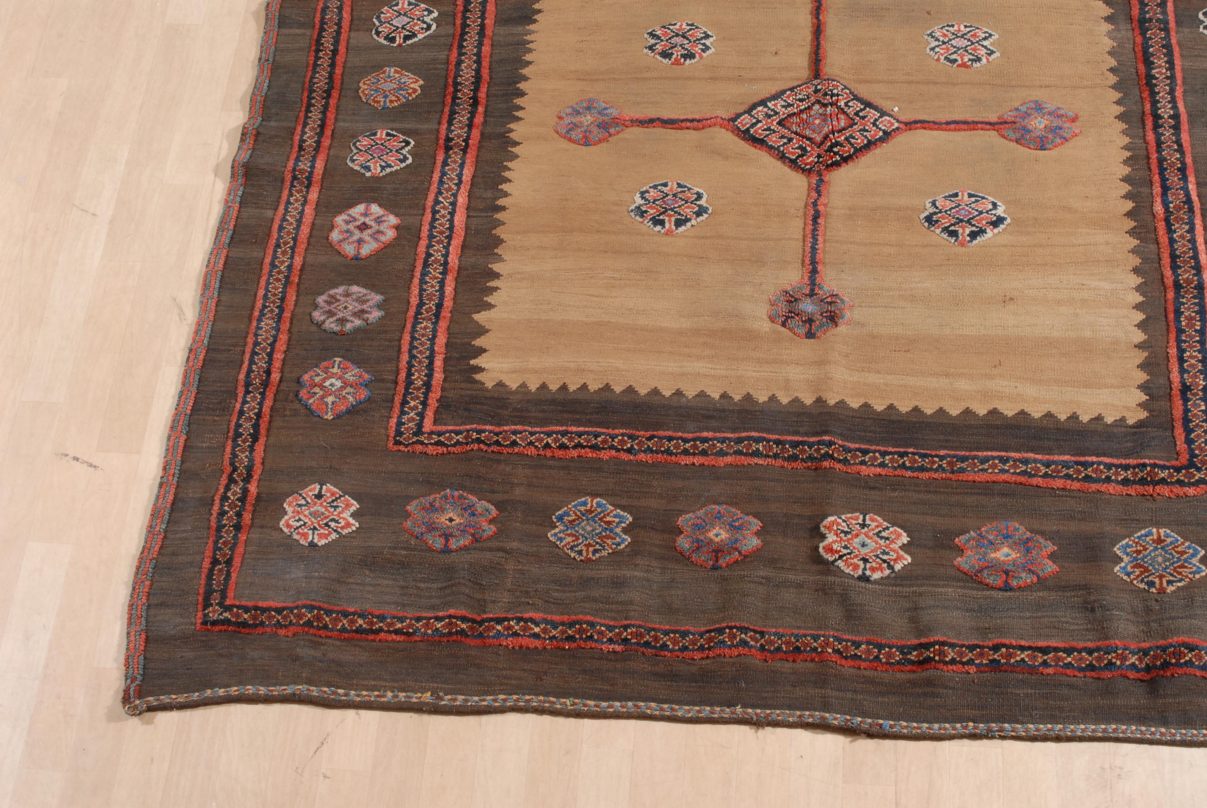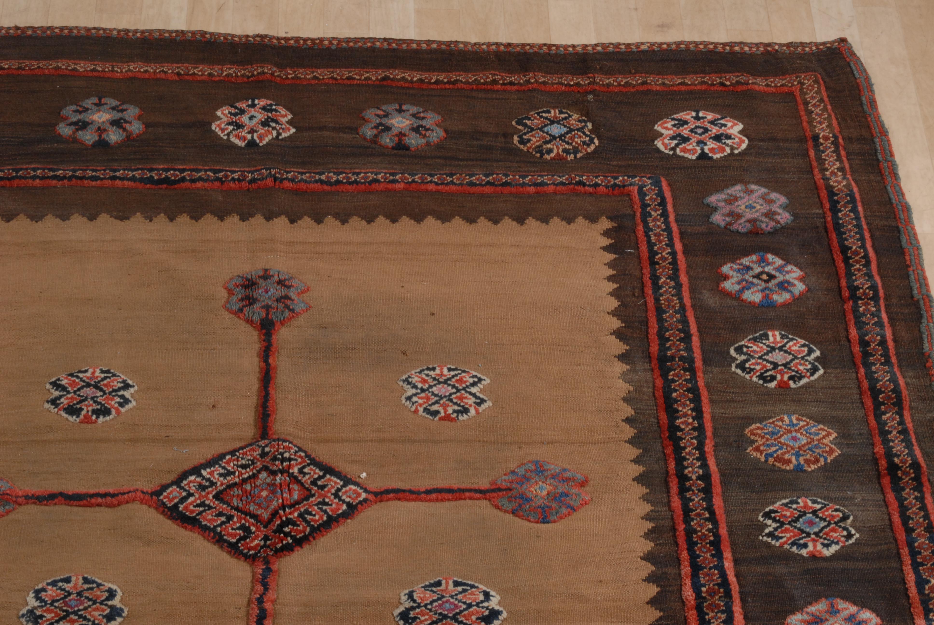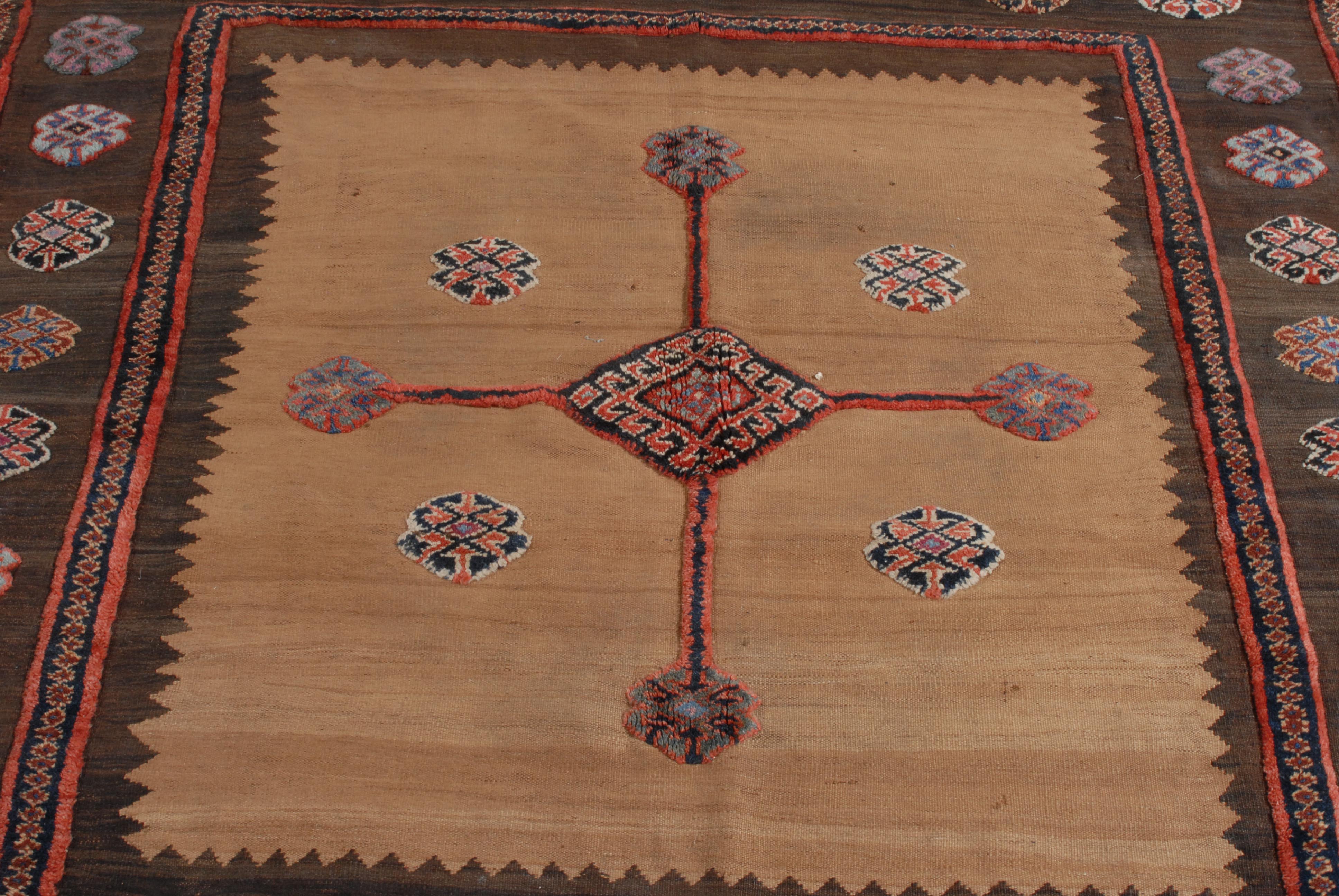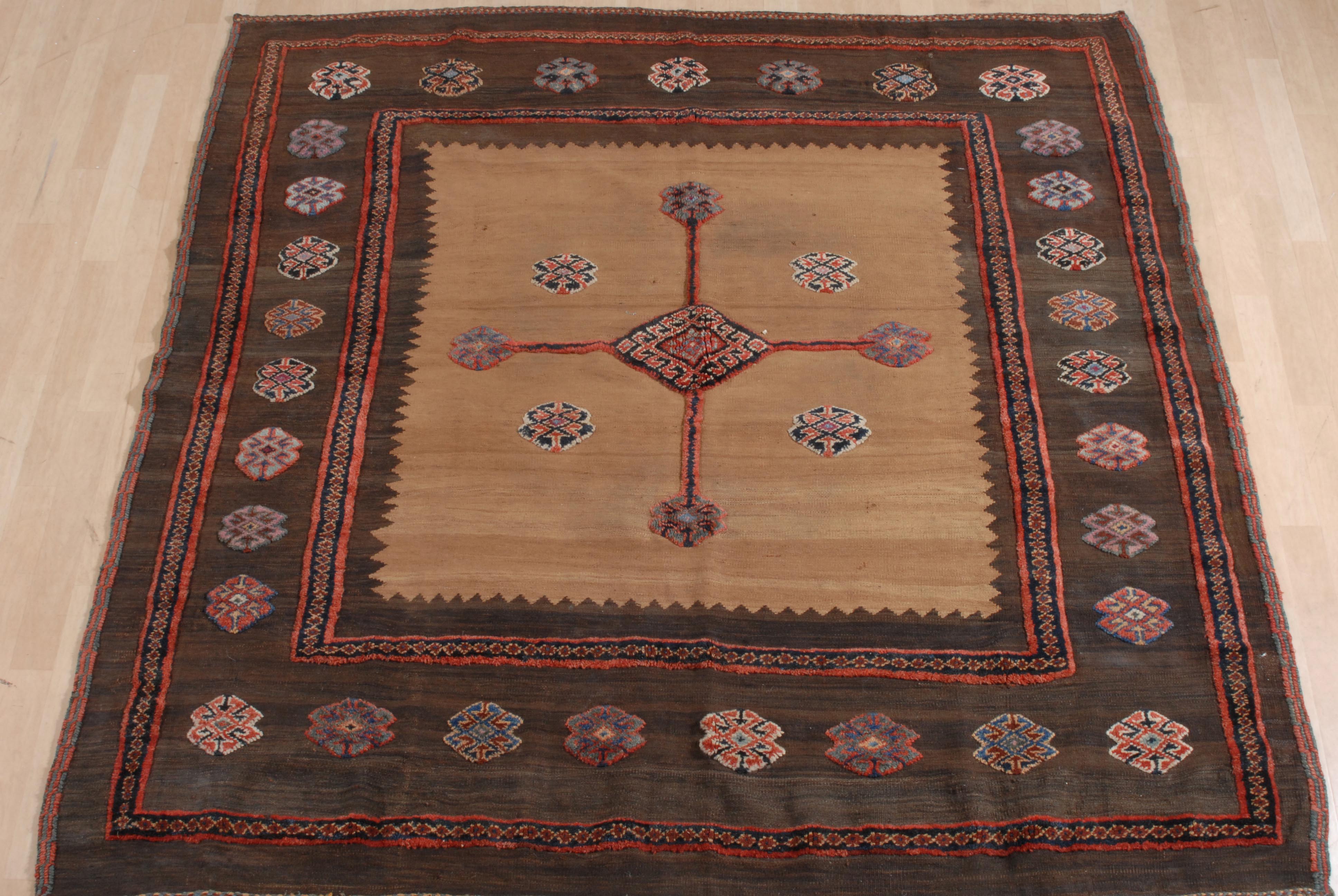 Z-Iran, um 1920. Sehr elegantes, und trotz des Alters, modernes Flachgewebe. Im kamelhaarfarbenen Mittelfeld kreuzförmiges Rautenmedaillon mit 4 langen, hakenbesetzten Ausläufern. Eine schwarze Zickzack-Borte trennt das Innenfeld von der Hauptbordüre, die mit vielfarbigen alternierenden Hakenrauten in unendlichem Rapport belegt ist. Gebrauchsspuren. 190x190 cm (ft. 6.3x6.3).