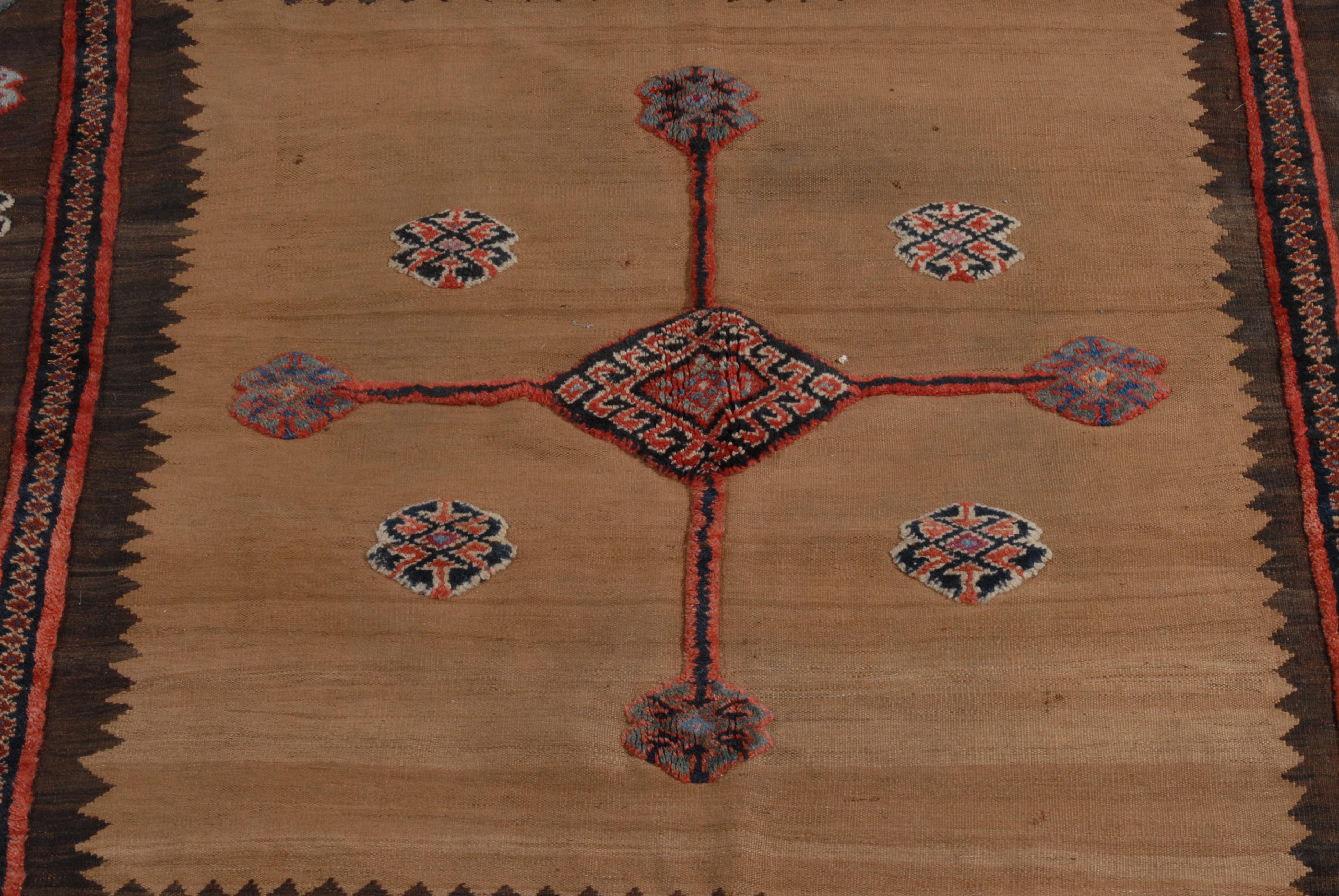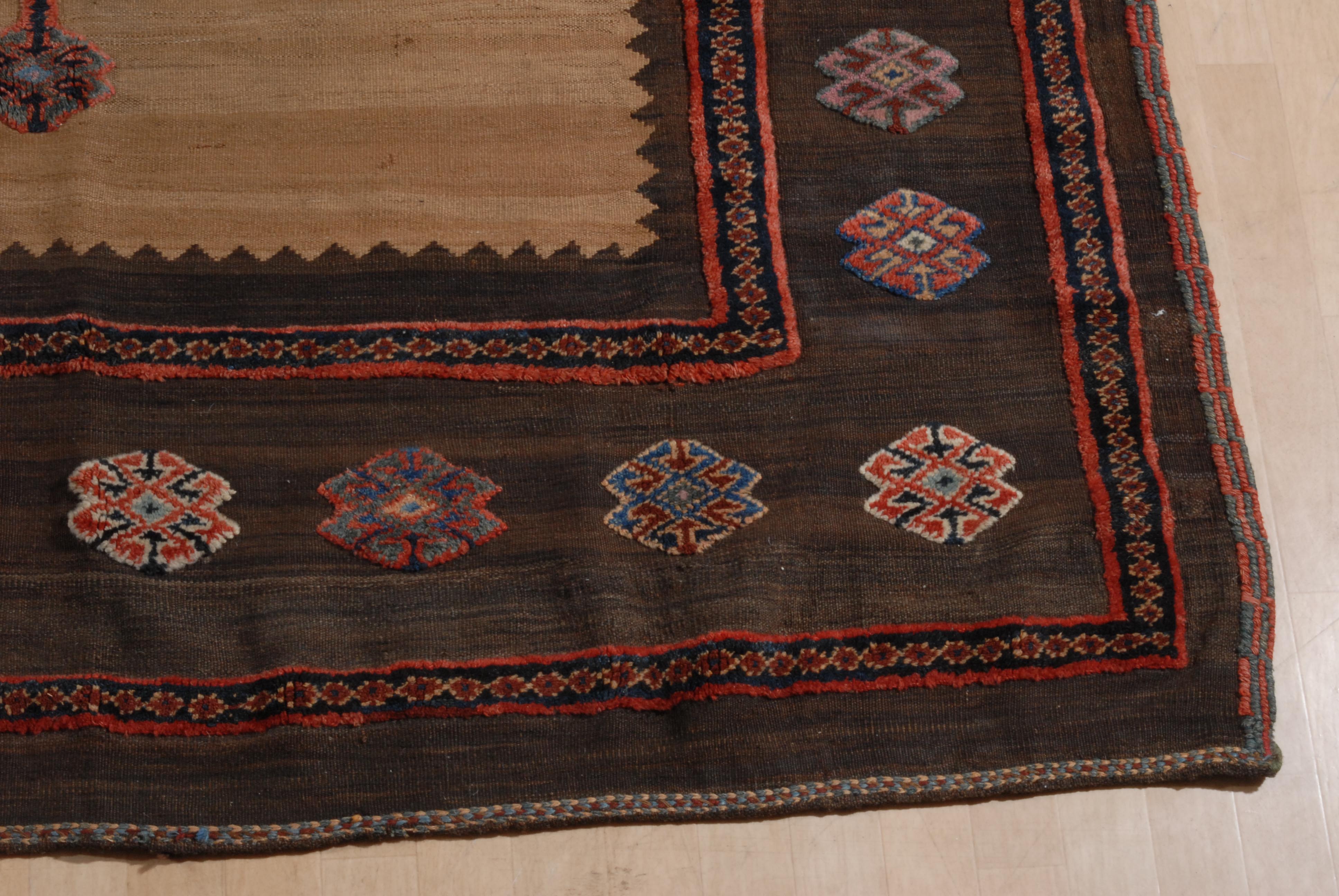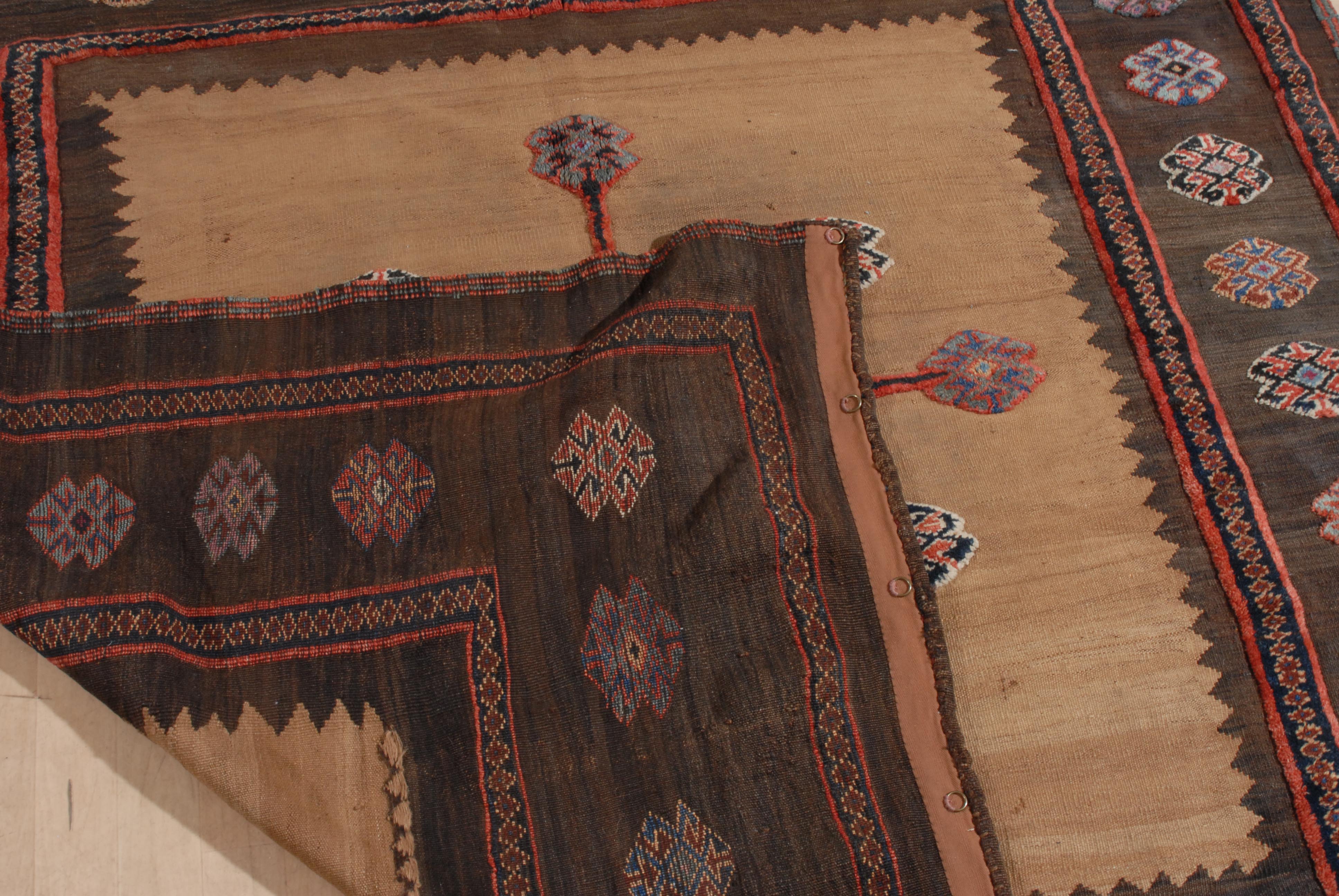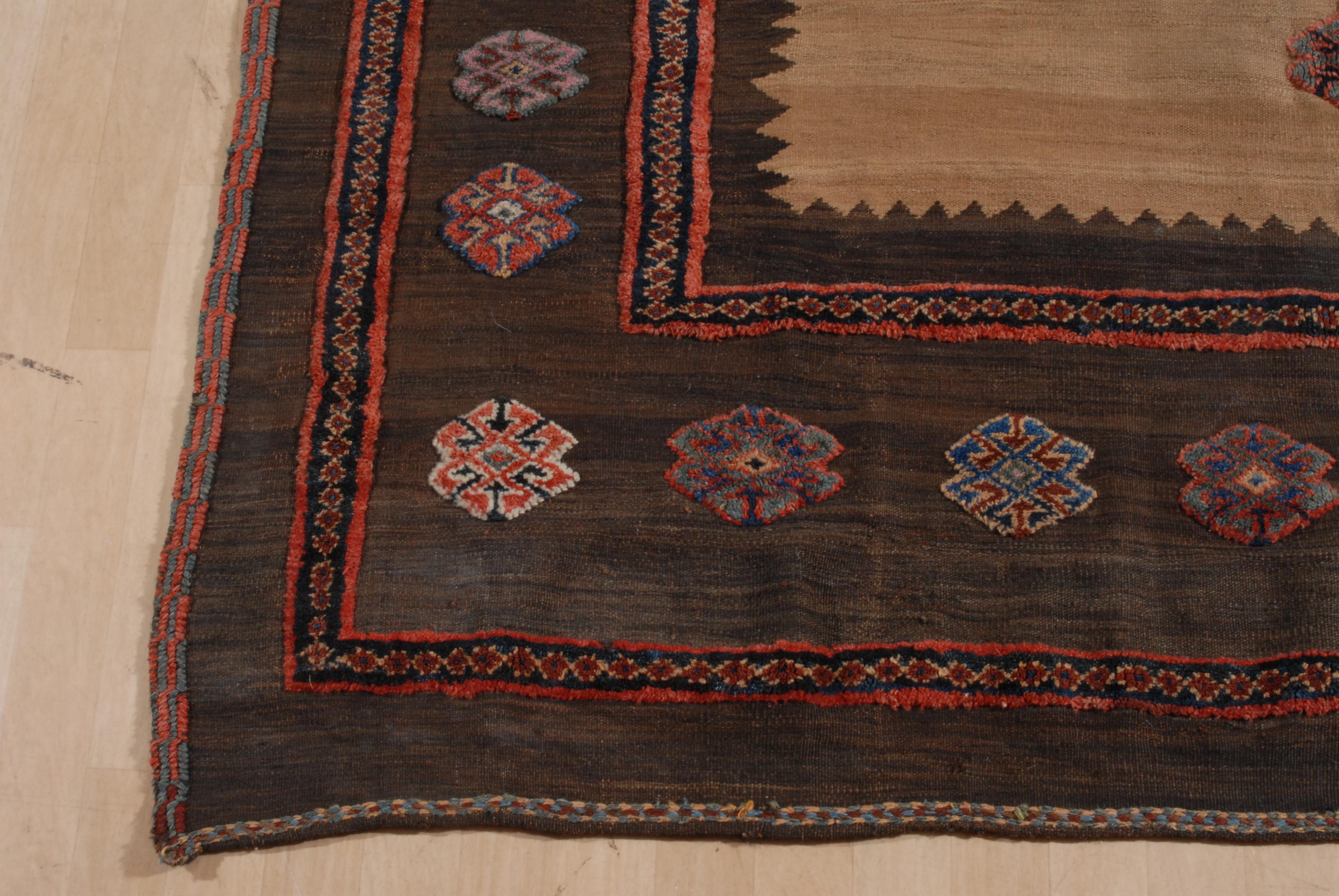 Z-Iran, um 1920. Sehr elegantes, und trotz des Alters, modernes Flachgewebe. Im kamelhaarfarbenen Mittelfeld kreuzförmiges Rautenmedaillon mit 4 langen, hakenbesetzten Ausläufern. Eine schwarze Zickzack-Borte trennt das Innenfeld von der Hauptbordüre, die mit vielfarbigen alternierenden Hakenrauten in unendlichem Rapport belegt ist. Gebrauchsspuren. 190x190 cm (ft. 6.3x6.3).
