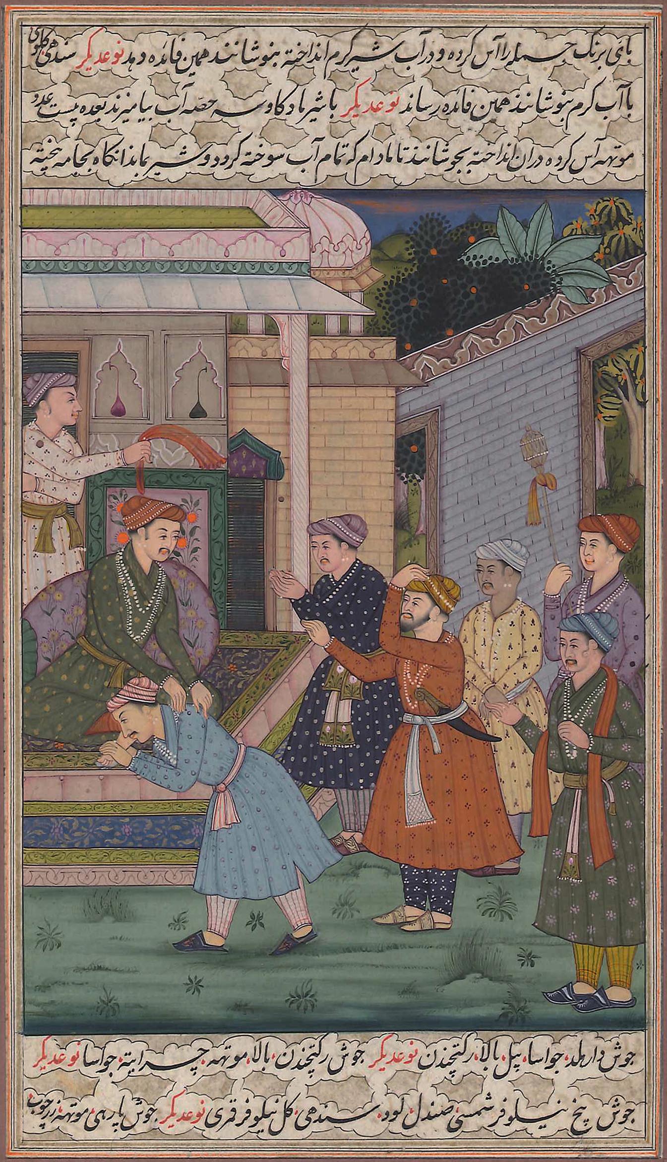 Indien. Gouache auf Papier. Sitzender Herrscher im Pavillon wird von Edelmännern begrüsst. Verso: Manuskript. Stockfleckig, Wurmgänge, Risse. Mit Klebeband montiert. 29x16,5 cm.