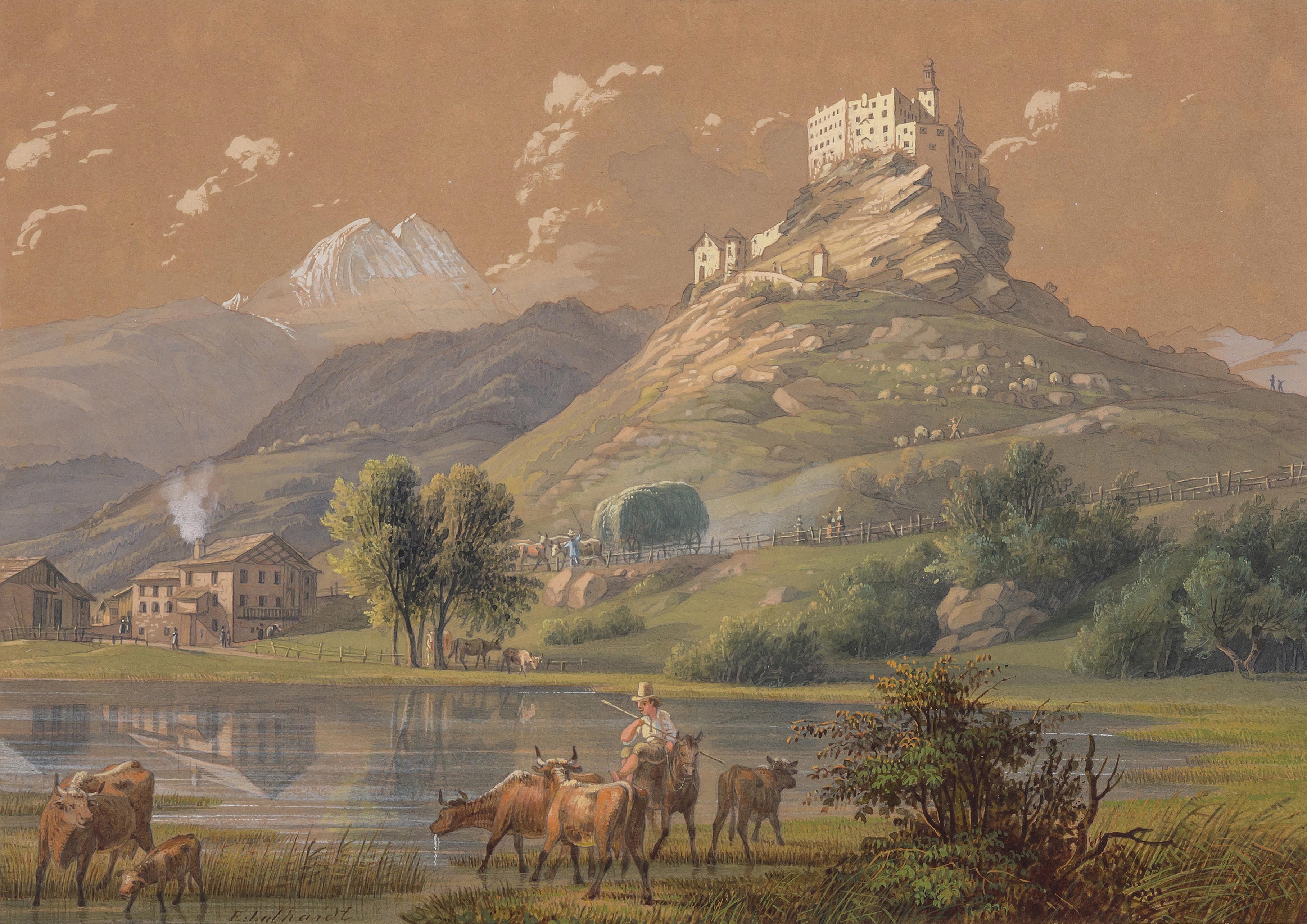 Blick auf das Schloss Tarasp, mit dem Taraspsee im Vordergrund. Aquarell. Unten links signiert. 16,6x23,5 cm. -Aufgezogen und etwas gebräunt.