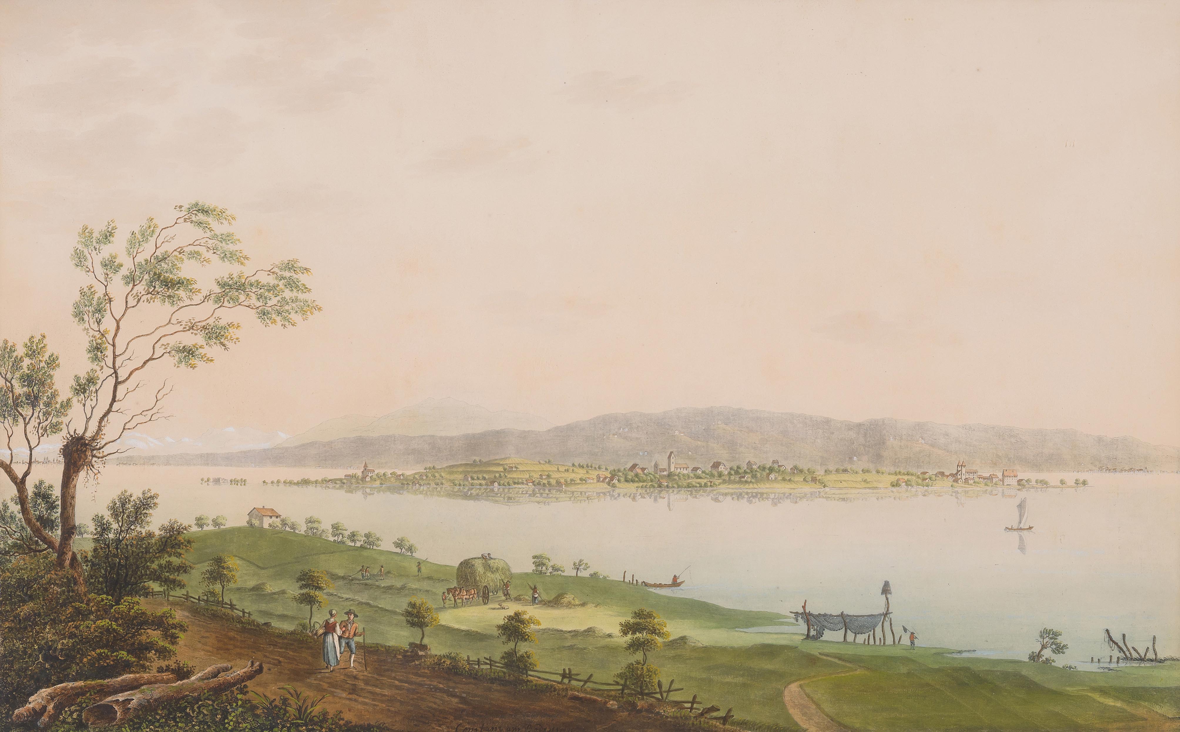 Insel Reichenau vom Nordwesten. Kolorierte Umrissradierung von Johann Ludwig Bleuler, um 1830. Unten Mitte hs. bezeichnet "Constanz am Bodensee". 32x52 cm. Gerahmt. - Allseitig auf den Bildrand beschnitten, aufgezogen und mit breitem, grau gouachiertem Rand versehen. Gut erhalten.