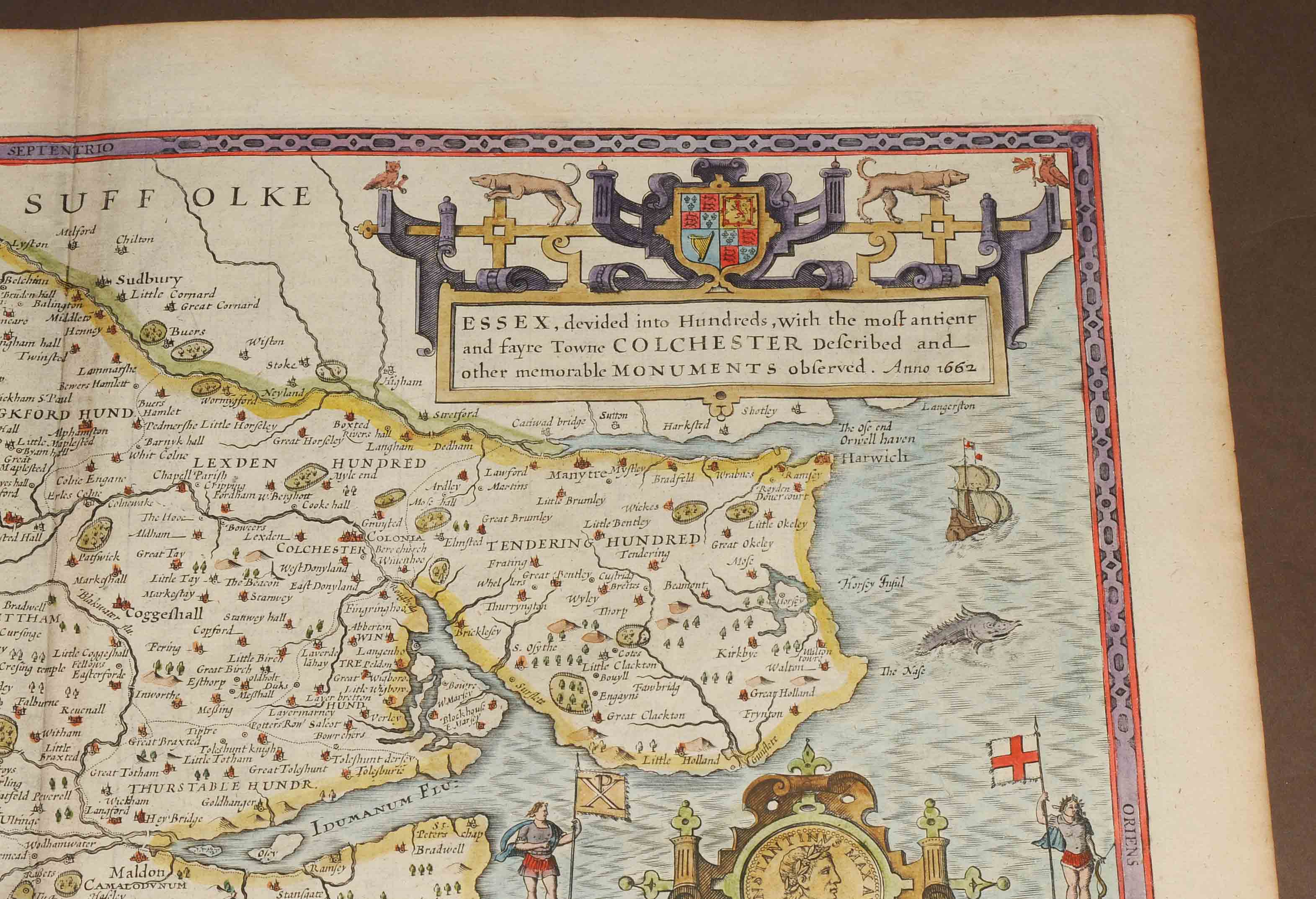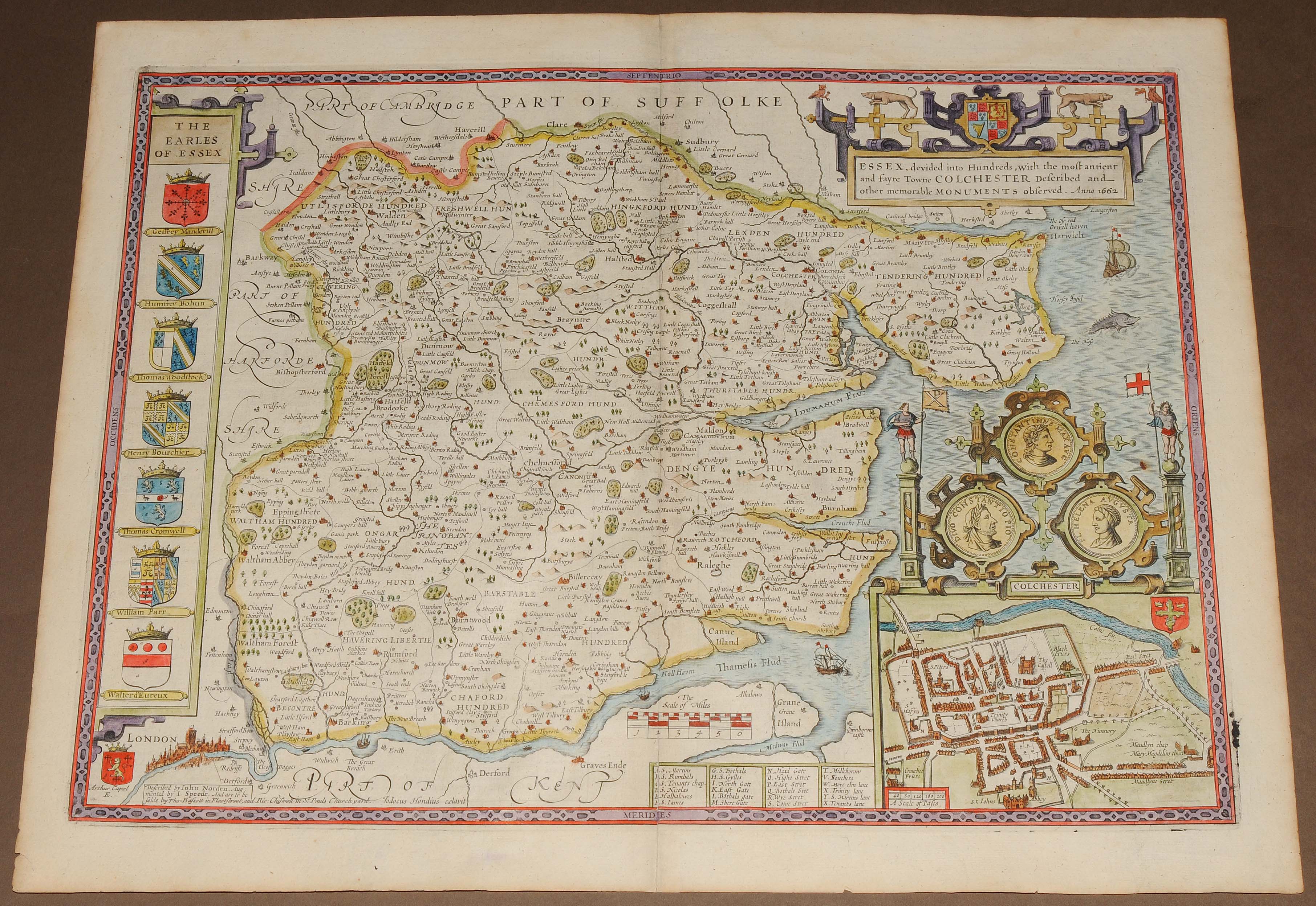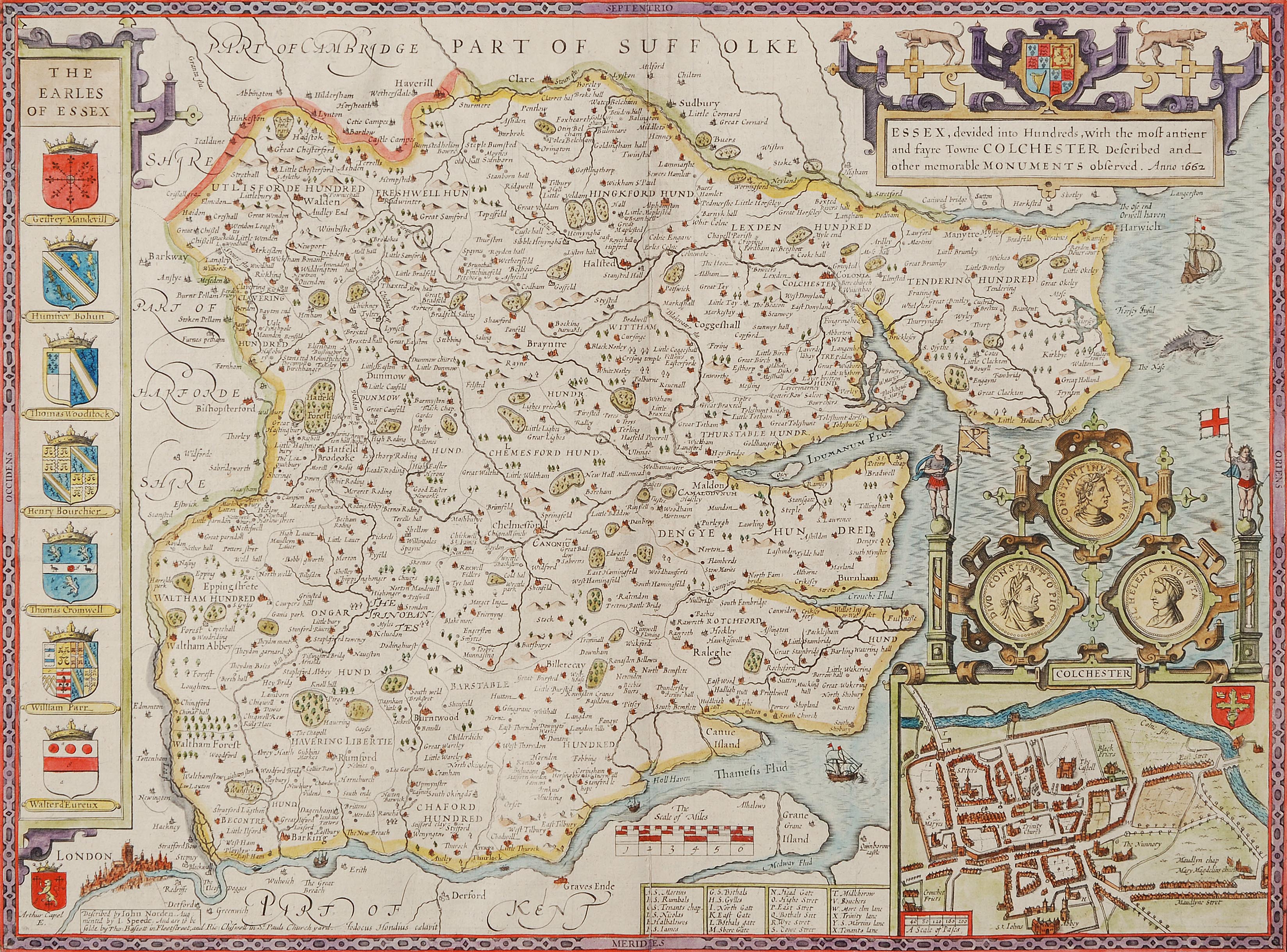 "ESSEX, divided into Hundreds, with the most antient and fayre Towne COLCHESTER...". Kolorierte Kupferstichkarte von Jodocus Hondius (1563-1613), mit 3 dekorativen Rollwerkkartuschen (Stadtplan von Colchester überhöht mit einem Aufsatz mit römischen Portraitmünzen und zwei Wappen- bzw. Schriftkartuschen). Aus Speeds Theatre of Great Britaine, Ausgabe von Bassett und Chiswell, London 1676 (EA 1611/12). 38,5x51,5 cm. - Mit der üblichen Mittelfalte, doch sehr gut erhalten.