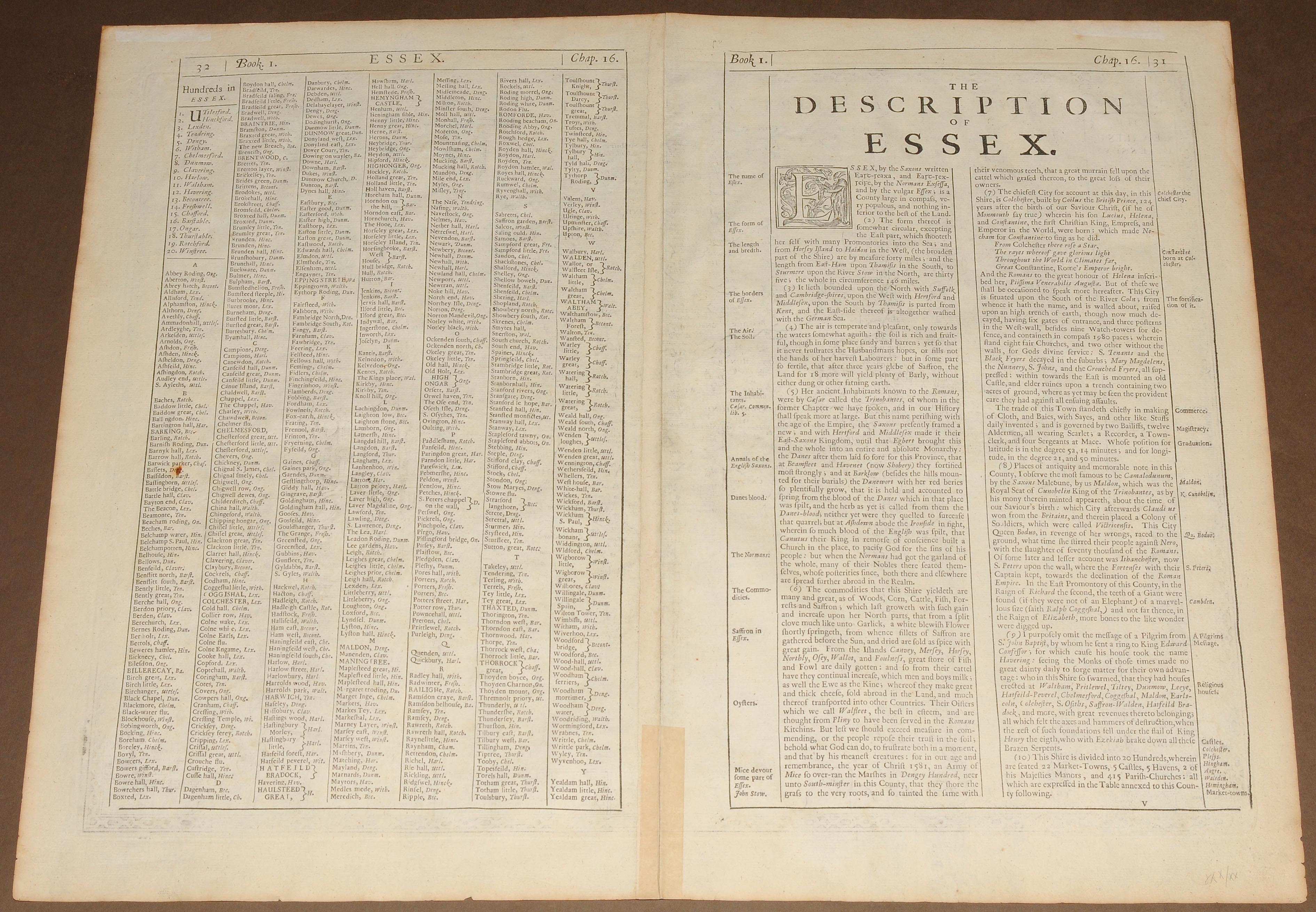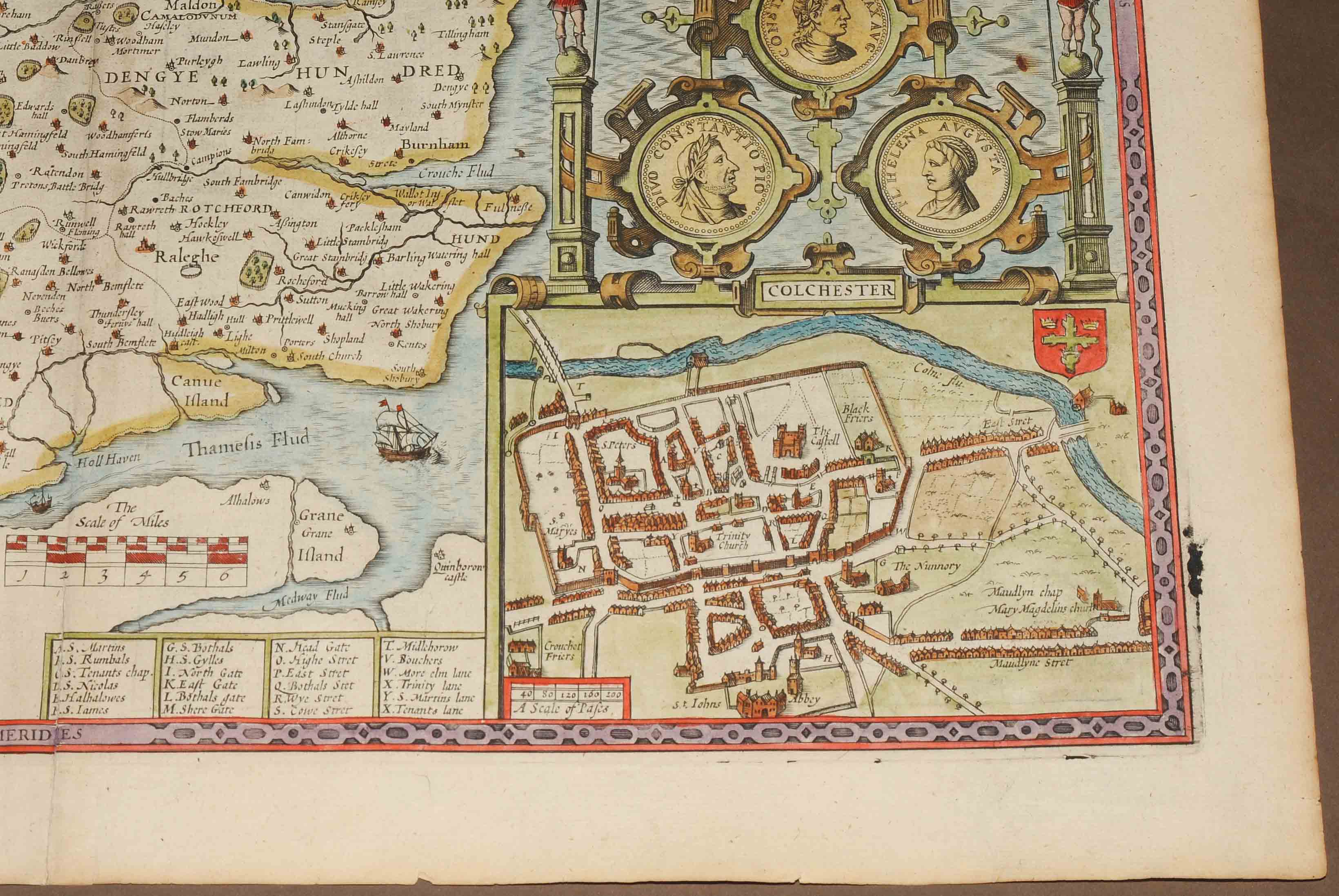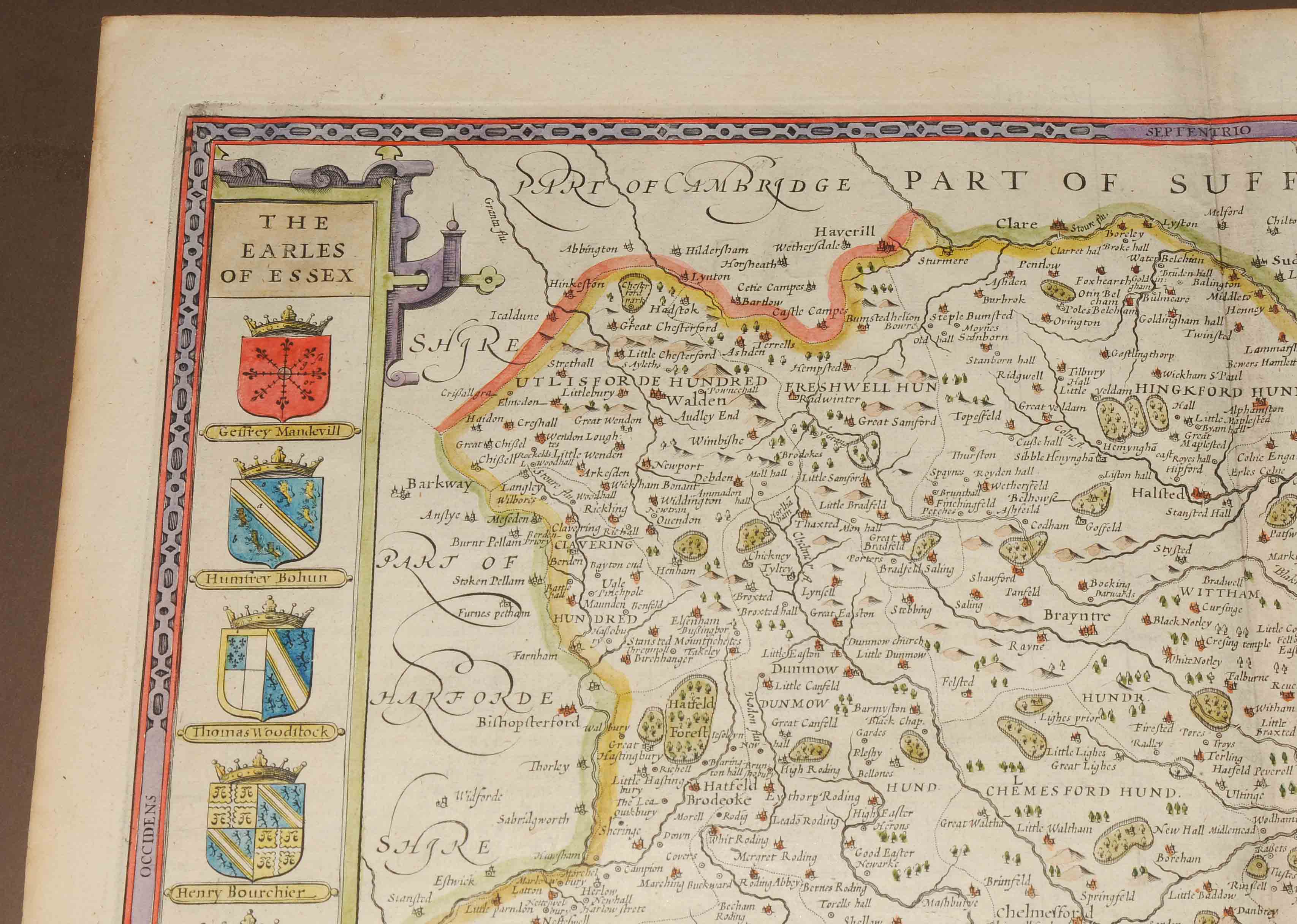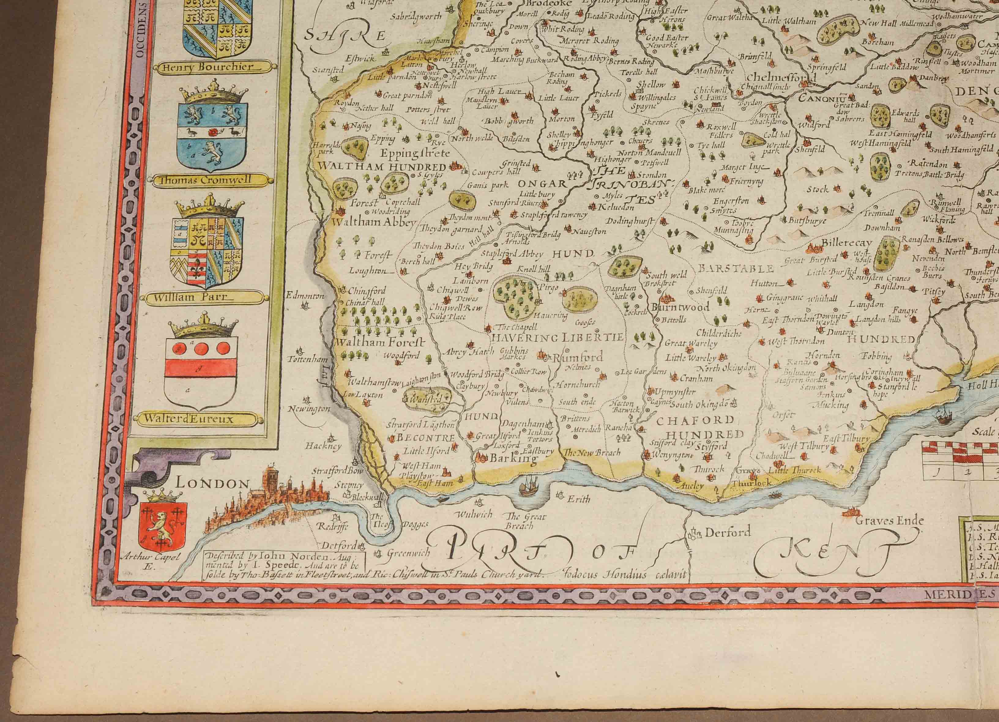 "ESSEX, divided into Hundreds, with the most antient and fayre Towne COLCHESTER...". Kolorierte Kupferstichkarte von Jodocus Hondius (1563-1613), mit 3 dekorativen Rollwerkkartuschen (Stadtplan von Colchester überhöht mit einem Aufsatz mit römischen Portraitmünzen und zwei Wappen- bzw. Schriftkartuschen). Aus Speeds Theatre of Great Britaine, Ausgabe von Bassett und Chiswell, London 1676 (EA 1611/12). 38,5x51,5 cm. - Mit der üblichen Mittelfalte, doch sehr gut erhalten.