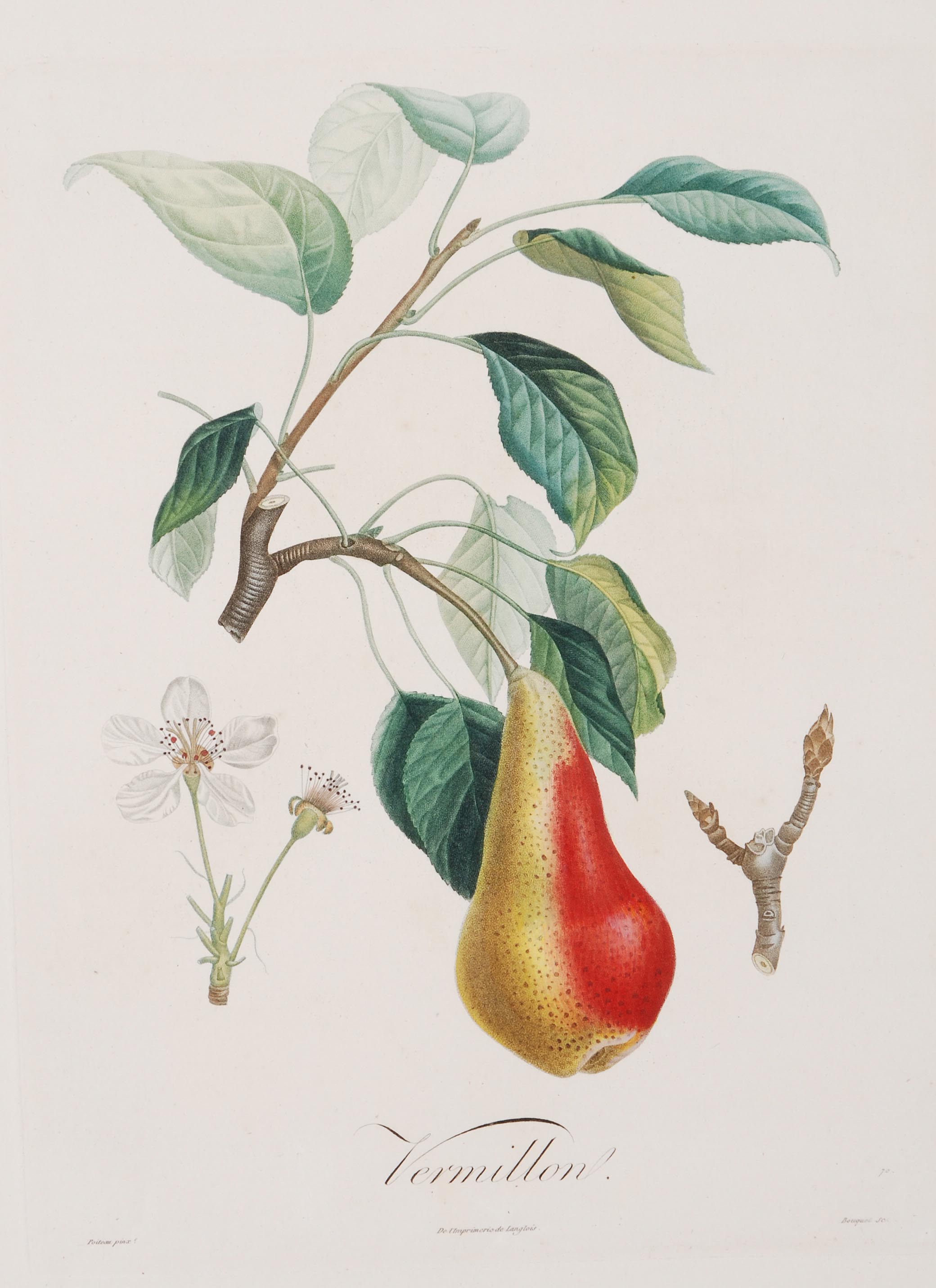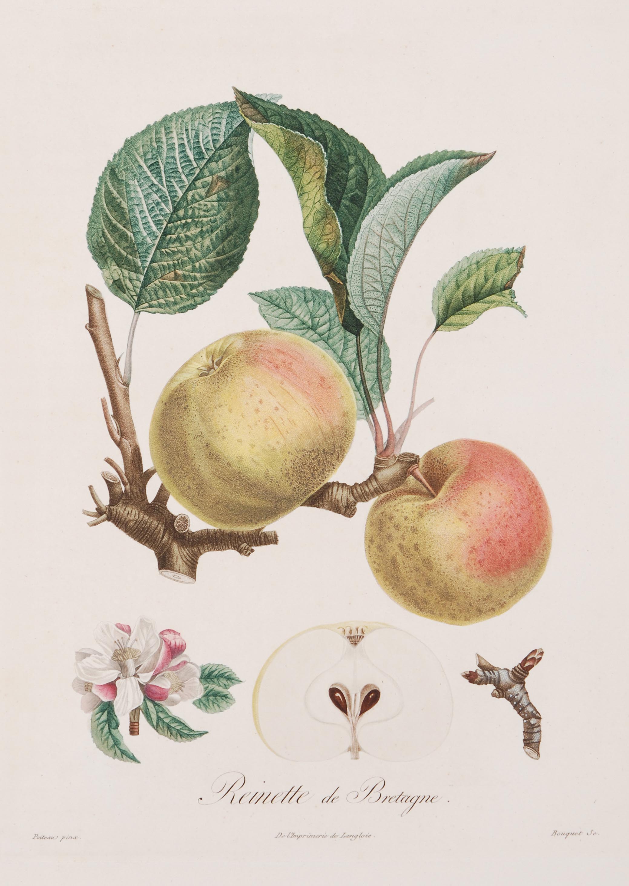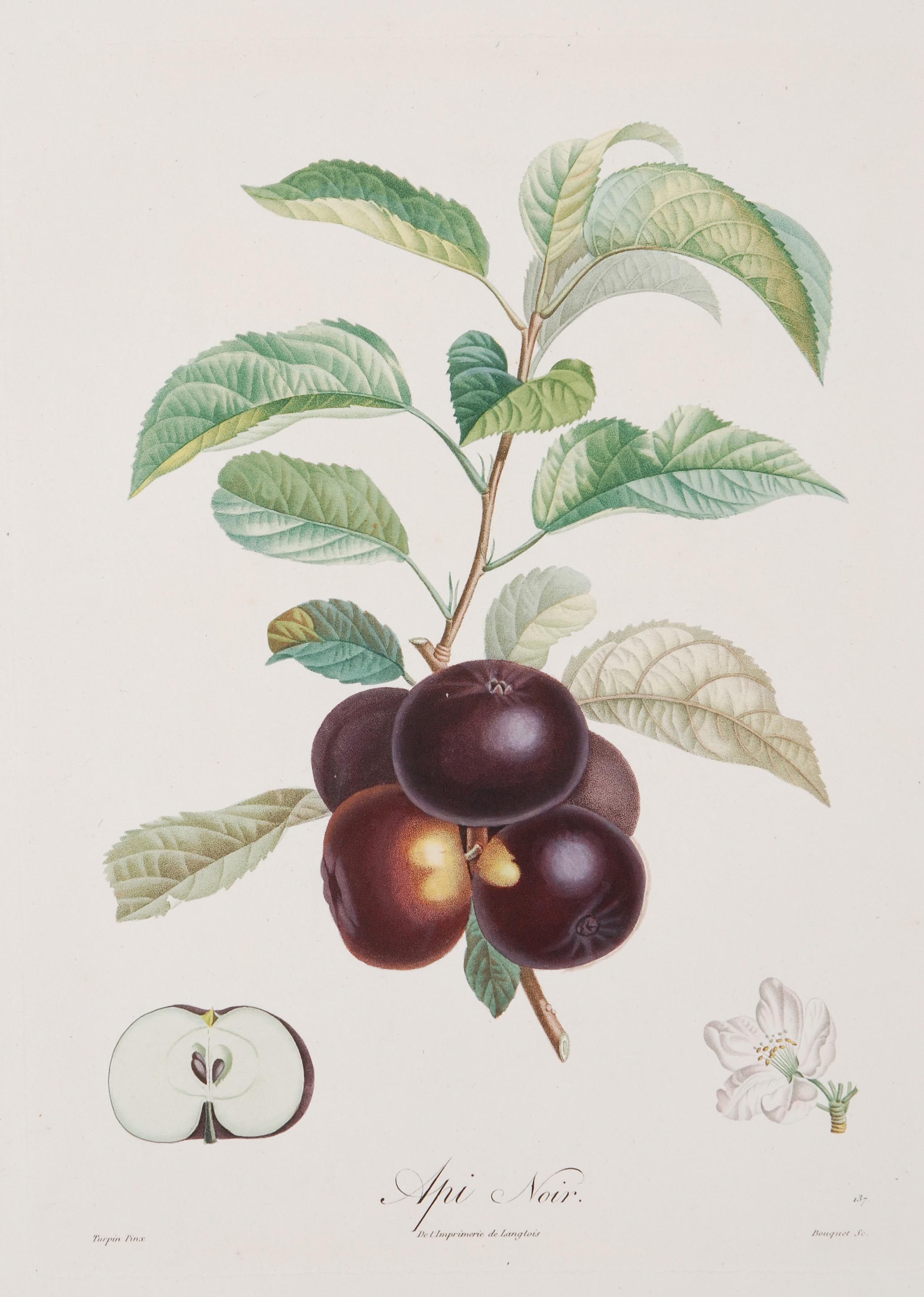 Früchte: Äpfel ("Api noir" und "Reinette de Bretagne") und Birnen ("Bergamotte d'été" und VVermillon"). 4 kolorierte Kupferstiche in Punktiermanier von L. Bouquet nach P. A. Poiteau und P. J. Turpin aus der Flora Parisiensis. Paris 1808-13. Taf.1, 70, 137 und 148. Alle ca. 55x36,5 cm.