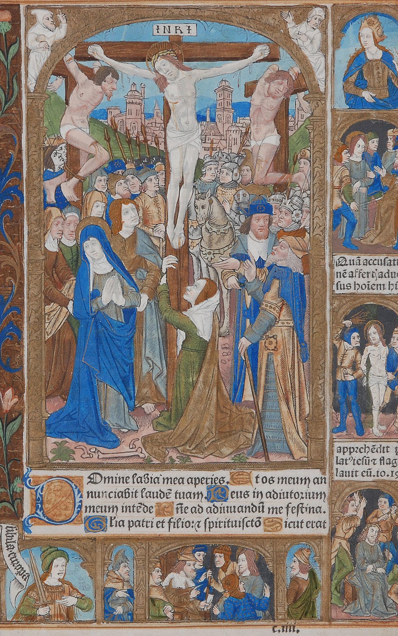 2 Blätter aus einem gedruckten Stundenbuch, Paris um 1500 (Philippe Pigouchet für Simon Vostre ?) mit je einer grossen Miniatur: Heimsuchung (Laudes) und Kreuzigung (de sancto spirito), je umrahmt von kleineren Randbildern aus der Vita Christi bzw. der Passion. Illuminierte, goldgehöhte Metallschnitte auf Pergament. Je ca. 16,5x11,5 cm (Bildausschnitt). Beide gerahmt.
