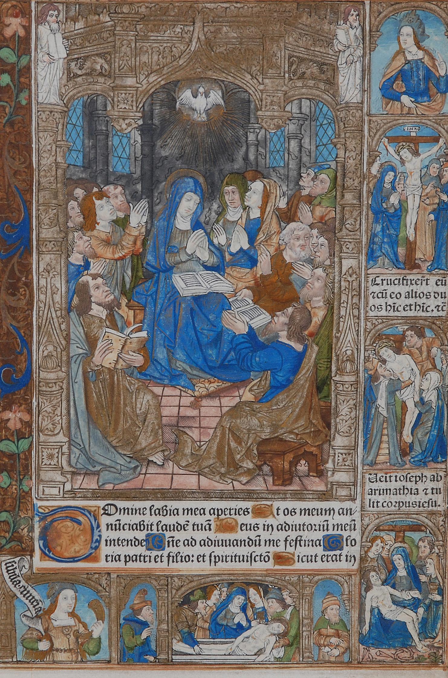 2 Blätter aus einem gedruckten Stundenbuch, Paris um 1500 (Philippe Pigouchet für Simon Vostre ?) mit je einer grossen Miniatur: Pfingstwunder (ad primam) und Lazarus an der Tafel des reichen Mannes (Totenmesse), je umrahmt von kleineren Randbildern aus der Passion bzw. aus dem Totentanz. Illuminierte, goldgehöhte Metallschnitte auf Pergament. Je ca. 16,5x11,5 cm (Bildausschnitt). Beide gerahmt.