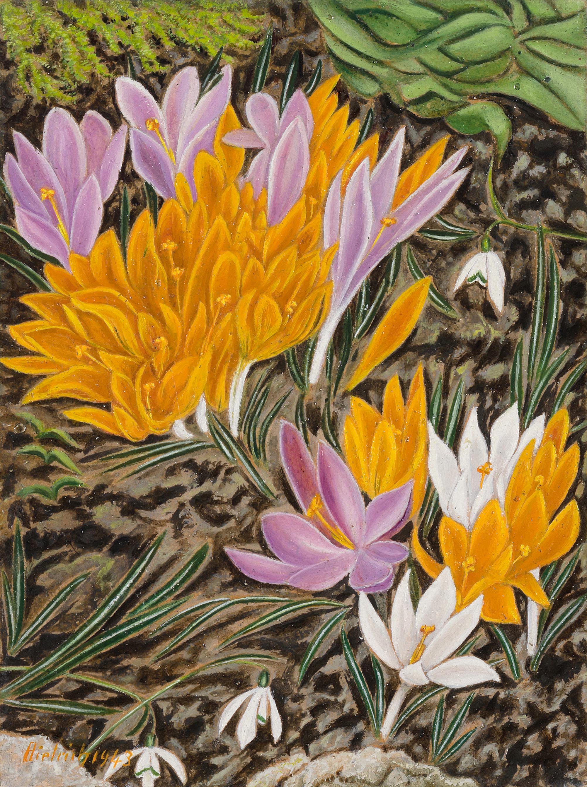 "Krokusse und Schneeglöckchen", 1943, Öl auf Karton. Unten links signiert und datiert. 24x17,8.