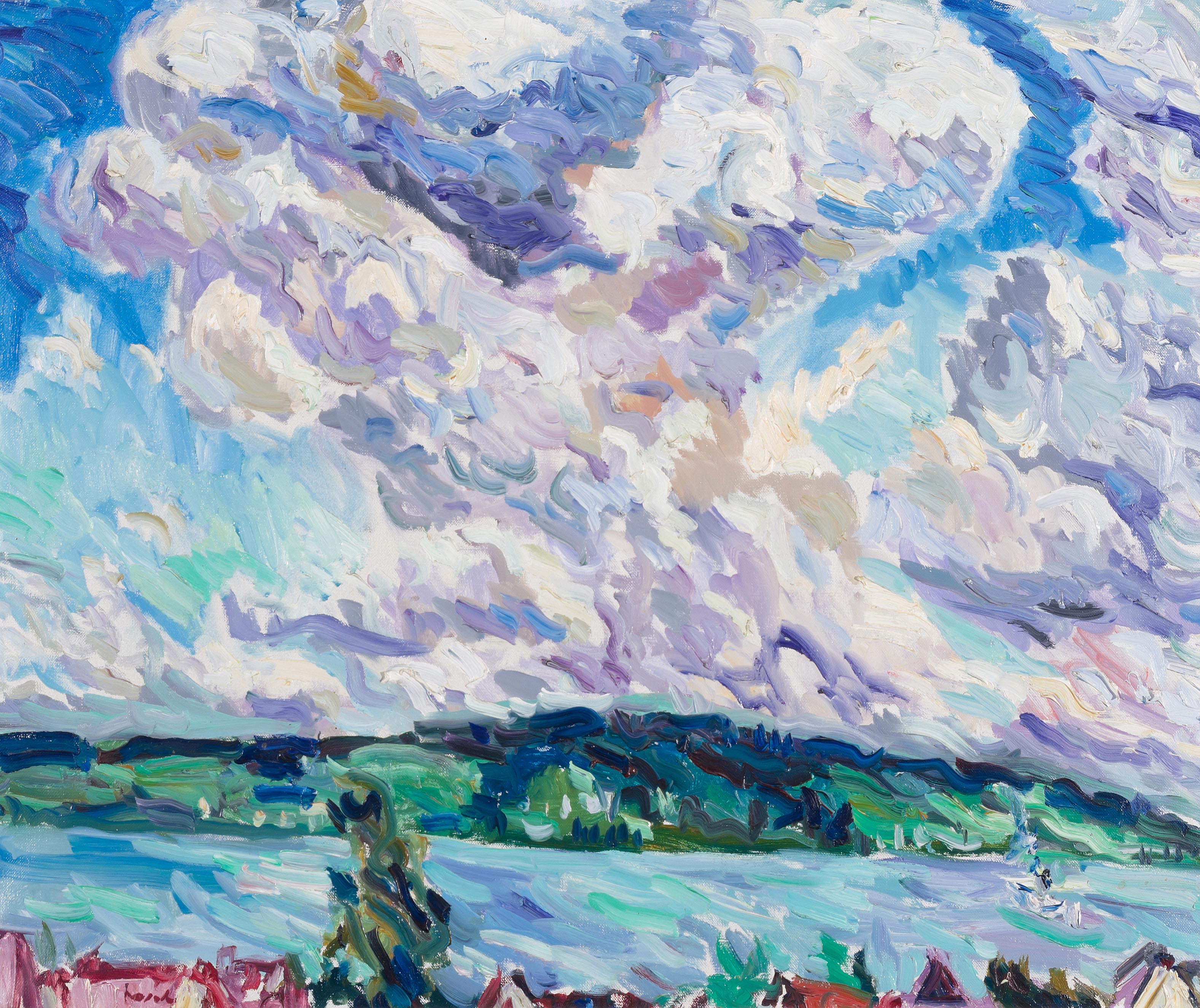 "Wolken über Herrliberg", 1967.Öl auf Leinwand. Unten links signiert, verso auf Künstleretikett bezeichnet und datiert. 61x74 cm.