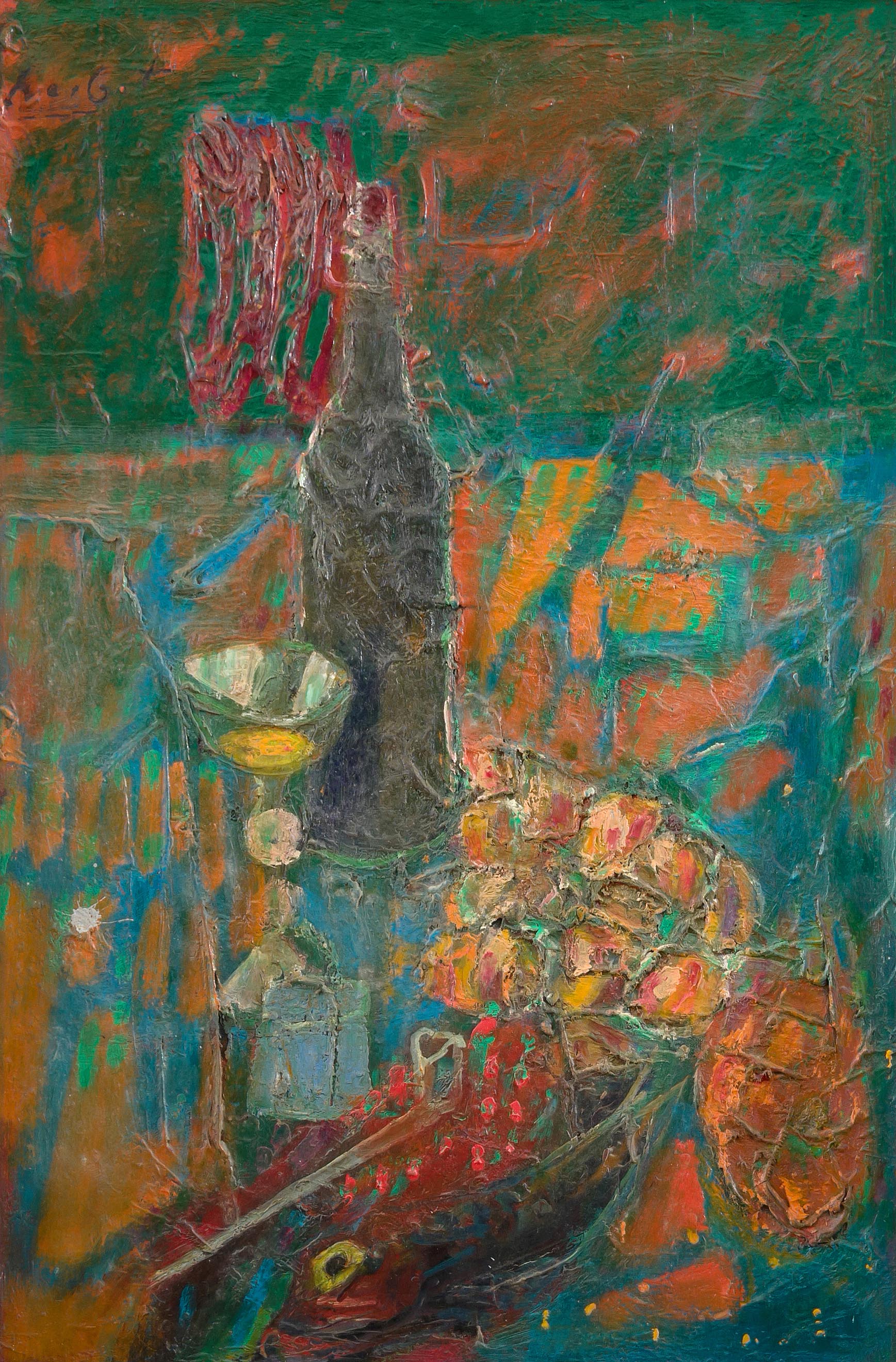 Stillleben mit Weinflasche, 1972. Öl auf Leinwand. Oben links signiert und datiert. 81x54 cm.