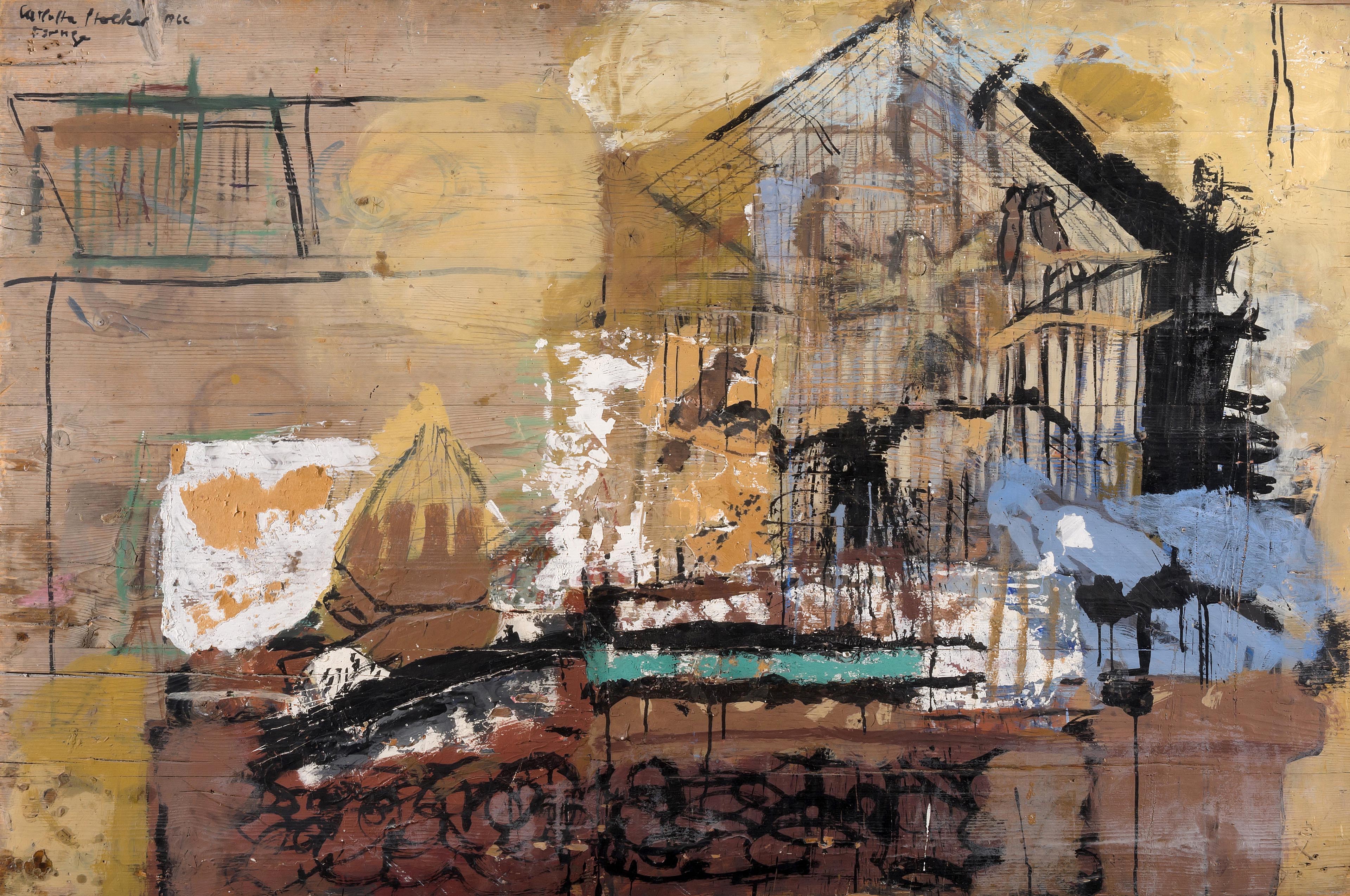 "Tauben im Käfig", Firenze 1962. Acryl und Collage auf Tischplatte. Oben links signiert und datiert. 100x150 cm.