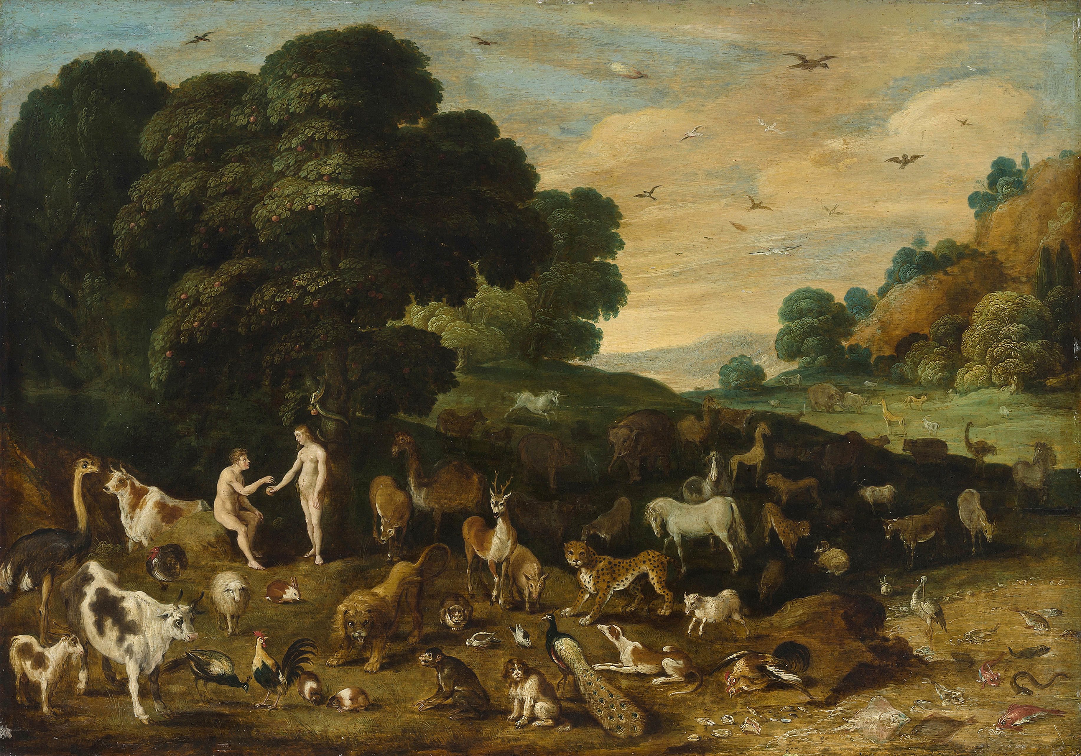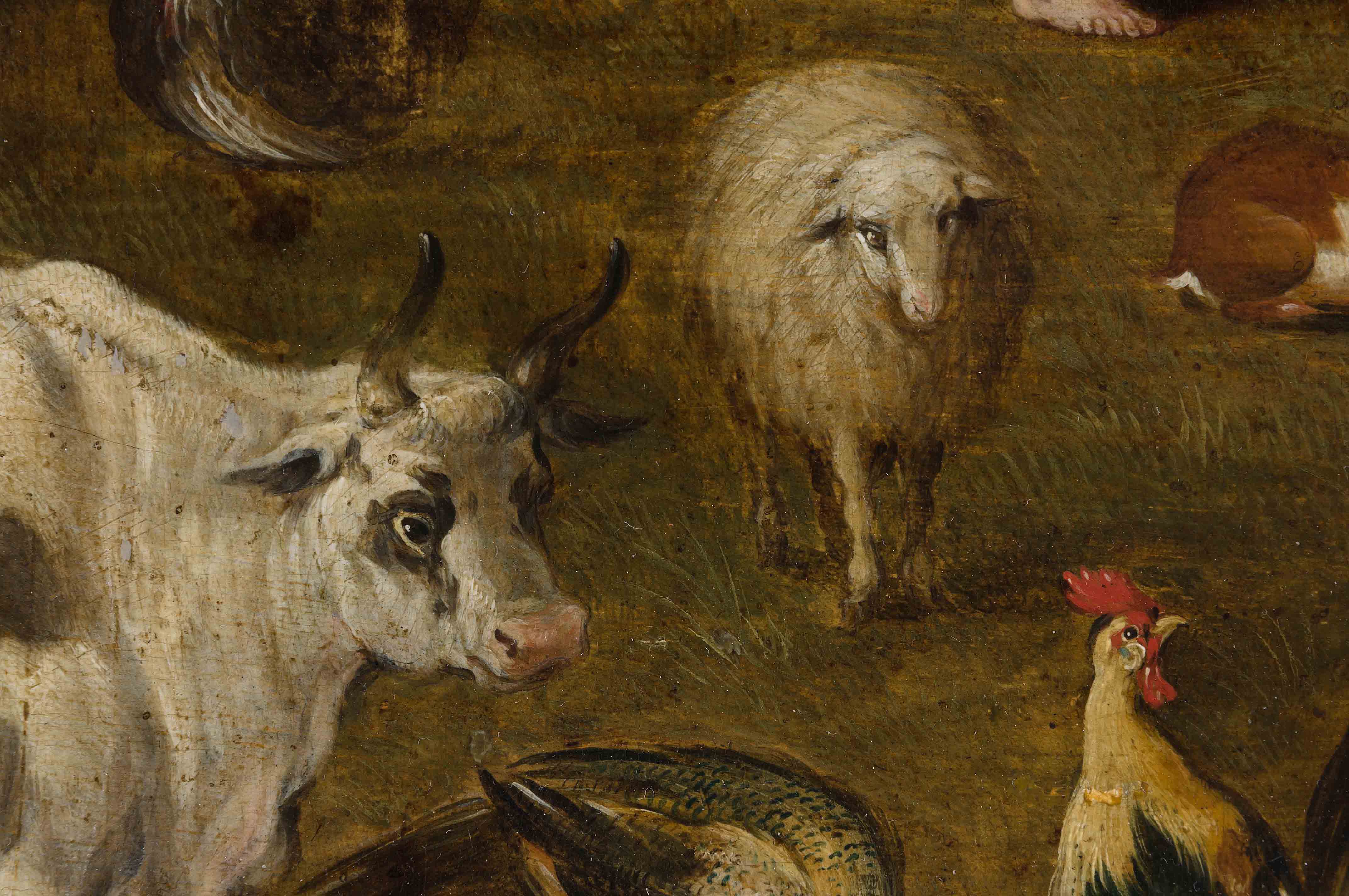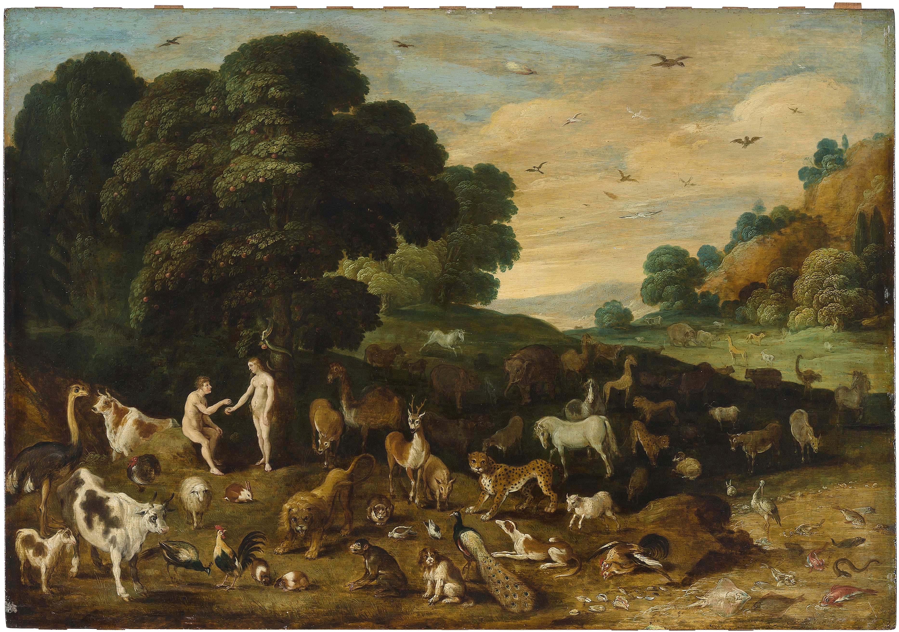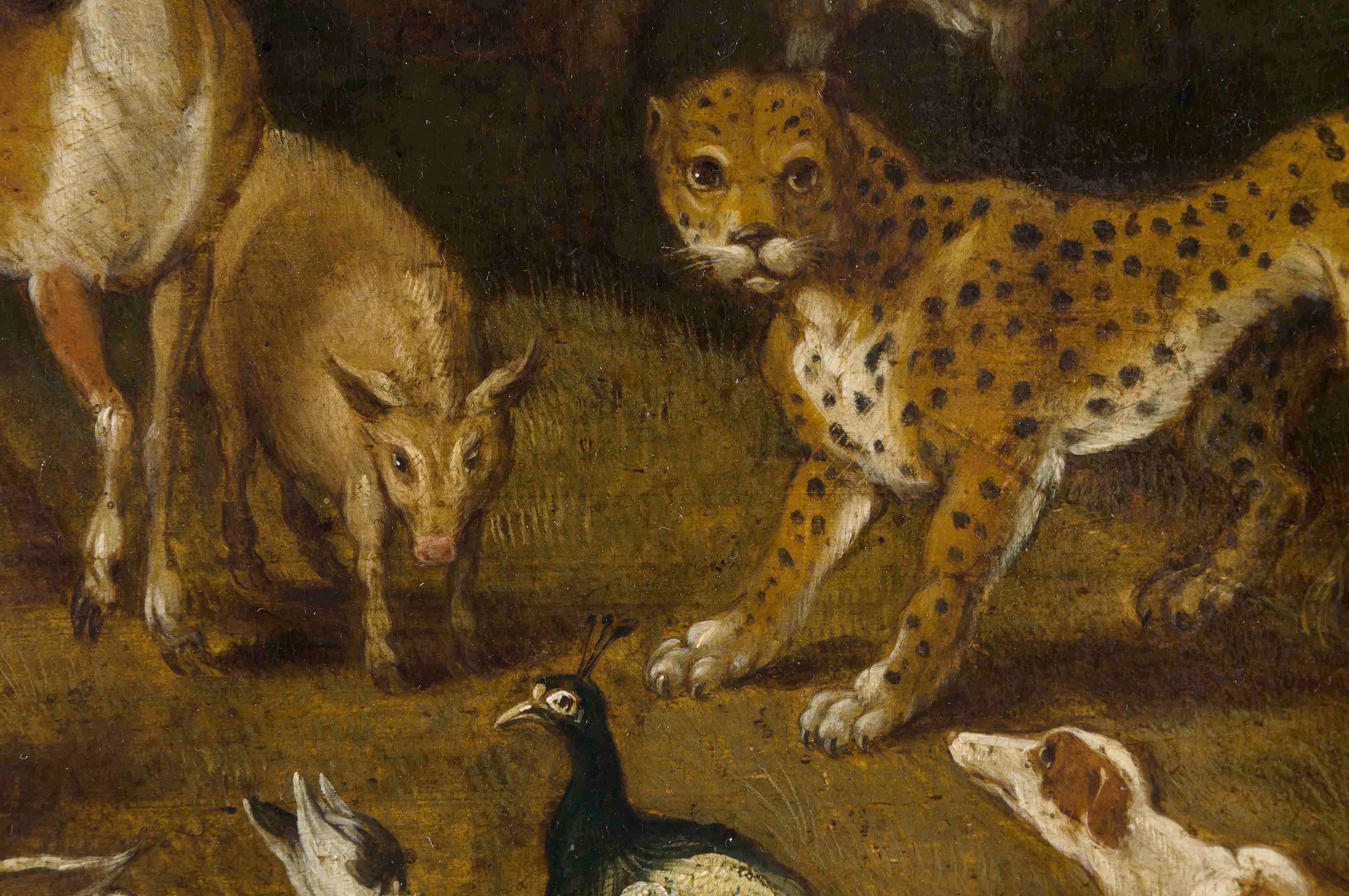 Dieses vor kurzem aufgetauchte und sehr gut erhaltene Gemälde wurde um 1630/40 von einen bisher noch unbekannten Maler aus dem unmittelbaren Umkreis von Jan Brueghel II in Antwerpen gemalt. Von Brueghel stammen der Strauss und der Tiger, doch der Affe und manche andere Tieren sind eigene Erfindungen des Malers. Auffallend ist, dass die Tiere fast enzyklopädisch den Vordergrund füllen. Der Landschaftshintergrund ist von einem zweiten, bisher noch nicht identifizierten Maler. Auch ihn kann man, v.a. in der Behandlung der Blätter, als eine eigene Künstlerpersönlichkeit erkennen.