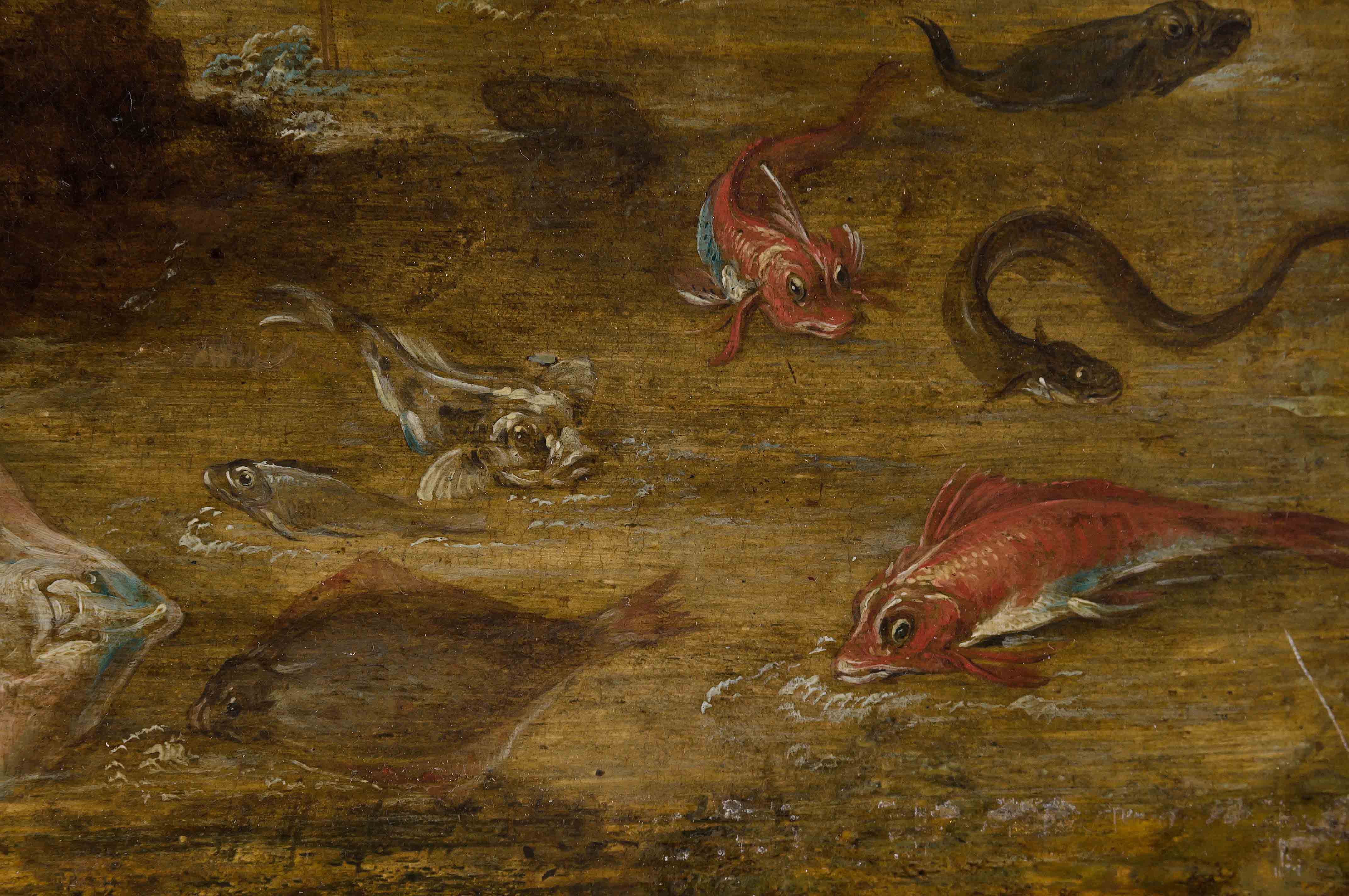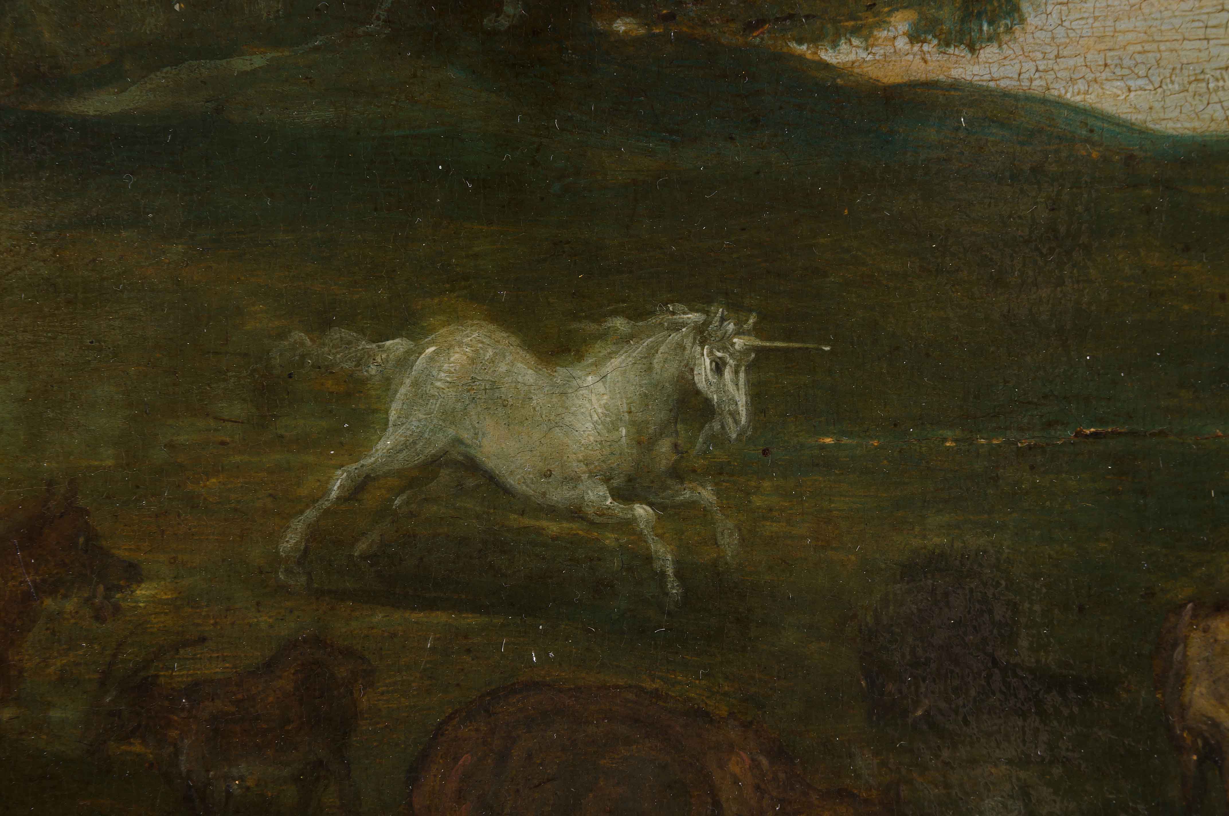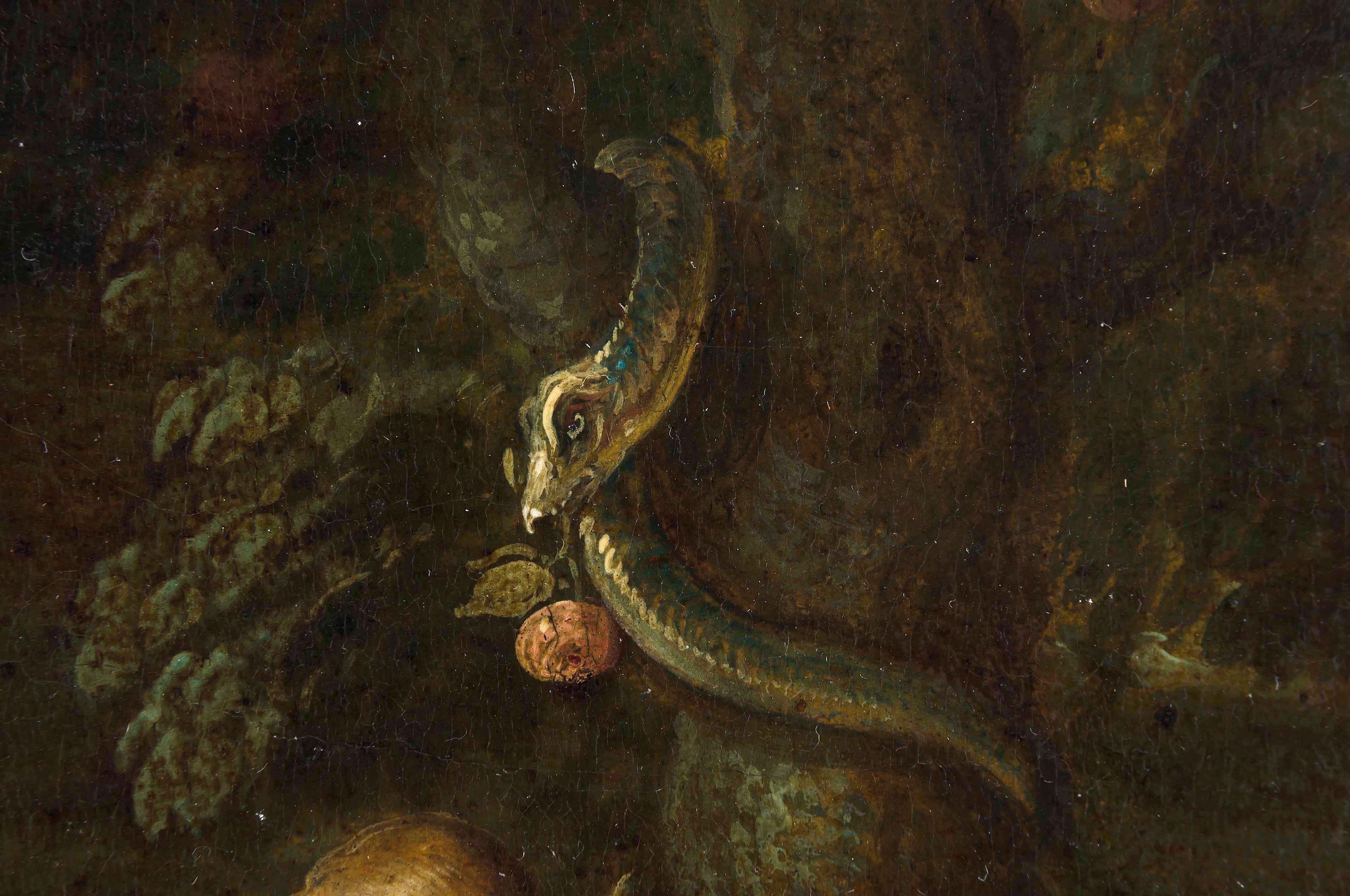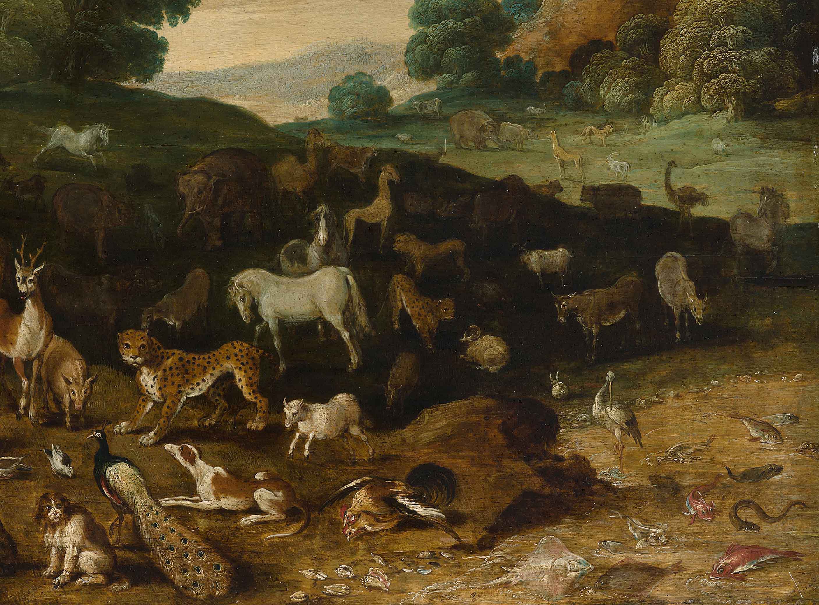 Dieses vor kurzem aufgetauchte und sehr gut erhaltene Gemälde wurde um 1630/40 von einen bisher noch unbekannten Maler aus dem unmittelbaren Umkreis von Jan Brueghel II in Antwerpen gemalt. Von Brueghel stammen der Strauss und der Tiger, doch der Affe und manche andere Tieren sind eigene Erfindungen des Malers. Auffallend ist, dass die Tiere fast enzyklopädisch den Vordergrund füllen. Der Landschaftshintergrund ist von einem zweiten, bisher noch nicht identifizierten Maler. Auch ihn kann man, v.a. in der Behandlung der Blätter, als eine eigene Künstlerpersönlichkeit erkennen.