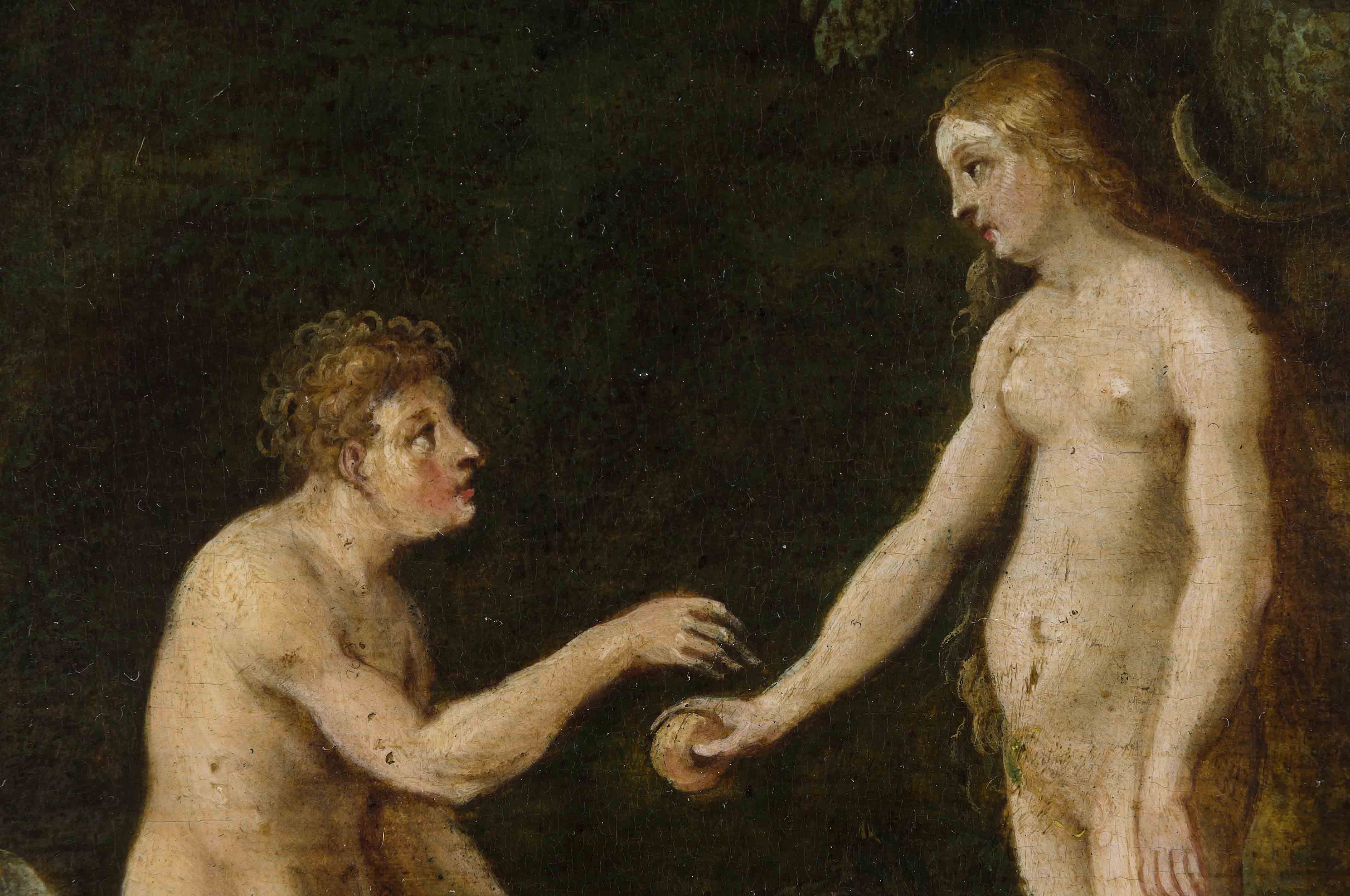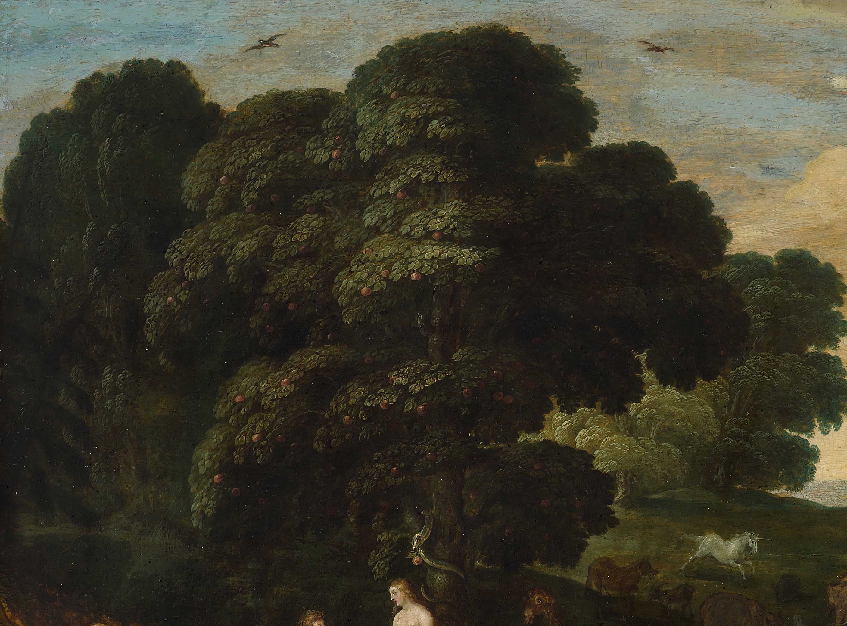Paradieslandschaft mit Sündenfall. Öl auf Holz. 53 x 76 cm.