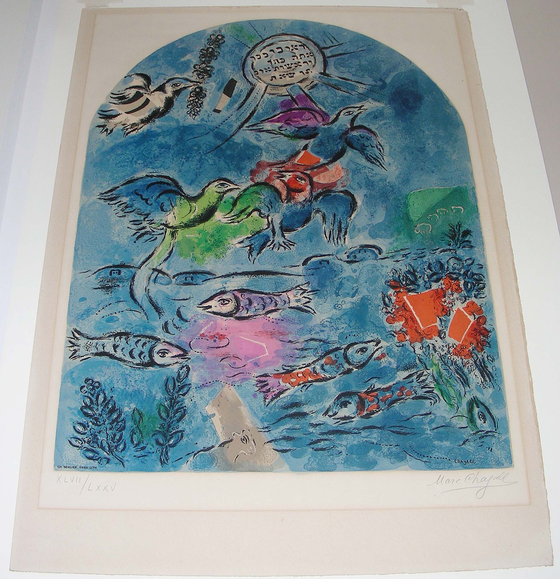 "La Tribu de Ruben". Aus: "Douze Maquettes de Vitraux pour Jérusalem". 1964. Farblithographie. XLVII/LXXV. Unten rechts in Bleistift und im Druck signiert. Unten links nummeriert und im Druck bezeichnet: "Ch. Sorlier_Grav. Lith.". Verso bezeichnet: Marc Chagall / Maquette de Vitraux "Ruben" / pour Jérusalem / reproduit en lithographie / Ch. Sorlier, graveur - Mourlot, imp.". Blattgrösse 74x52,5 cm. Gerahmt. -Blatt gebräunt. Lichtrand. Wenig braunfleckig. In den Ecken winzige Einstichlöcher. Verso am oberen Rand an Rückkarton montiert. Unter Passepartout gerahmt.
