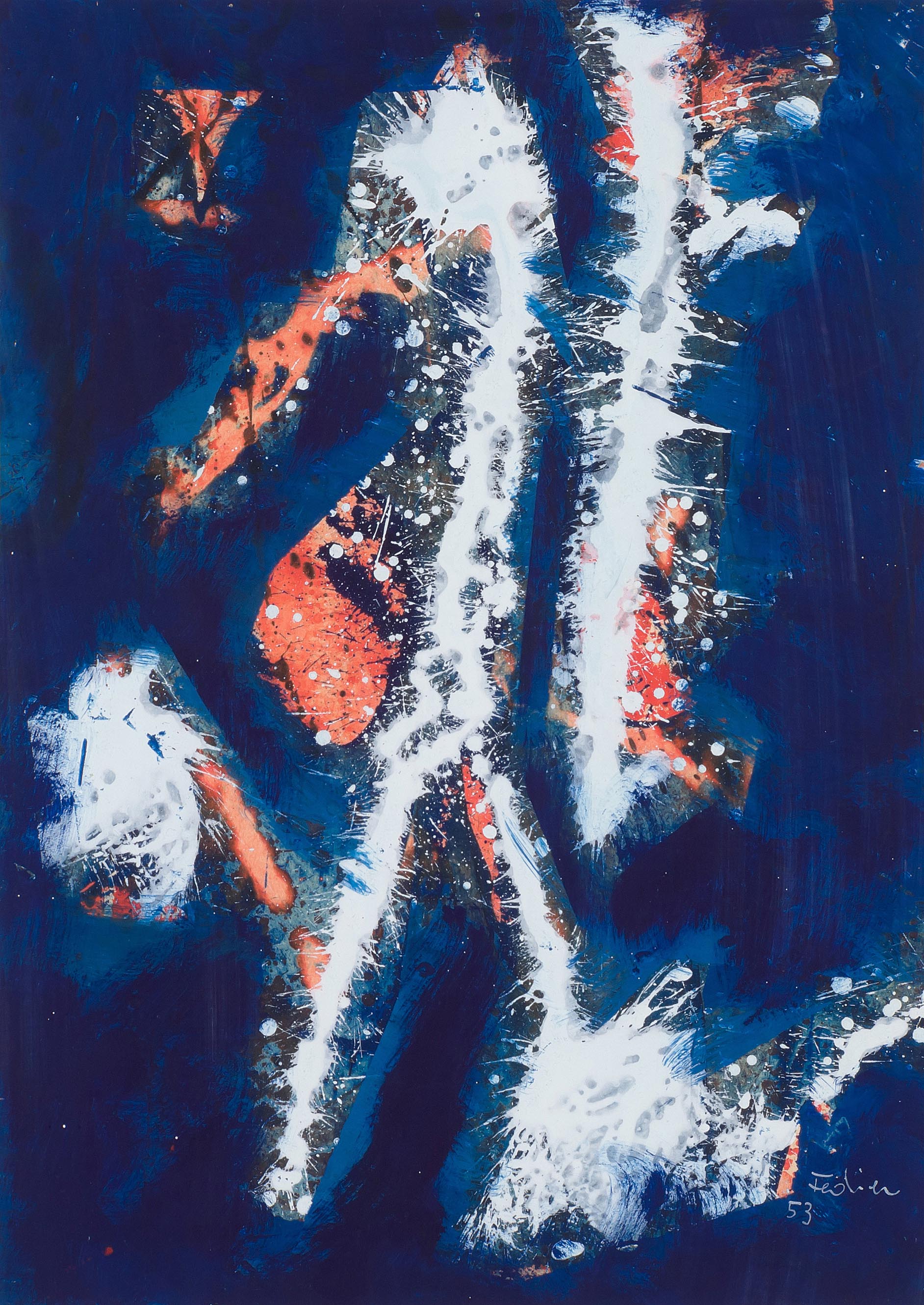 Ohne Titel. 1953. Gouache auf Papier. Unten links signiert und datiert. Blattgrösse 30,5x21,5 cm. Gerahmt. -Ränder und Ecken leicht bestossen. Verso am oberen Rand an Passepartout montiert.