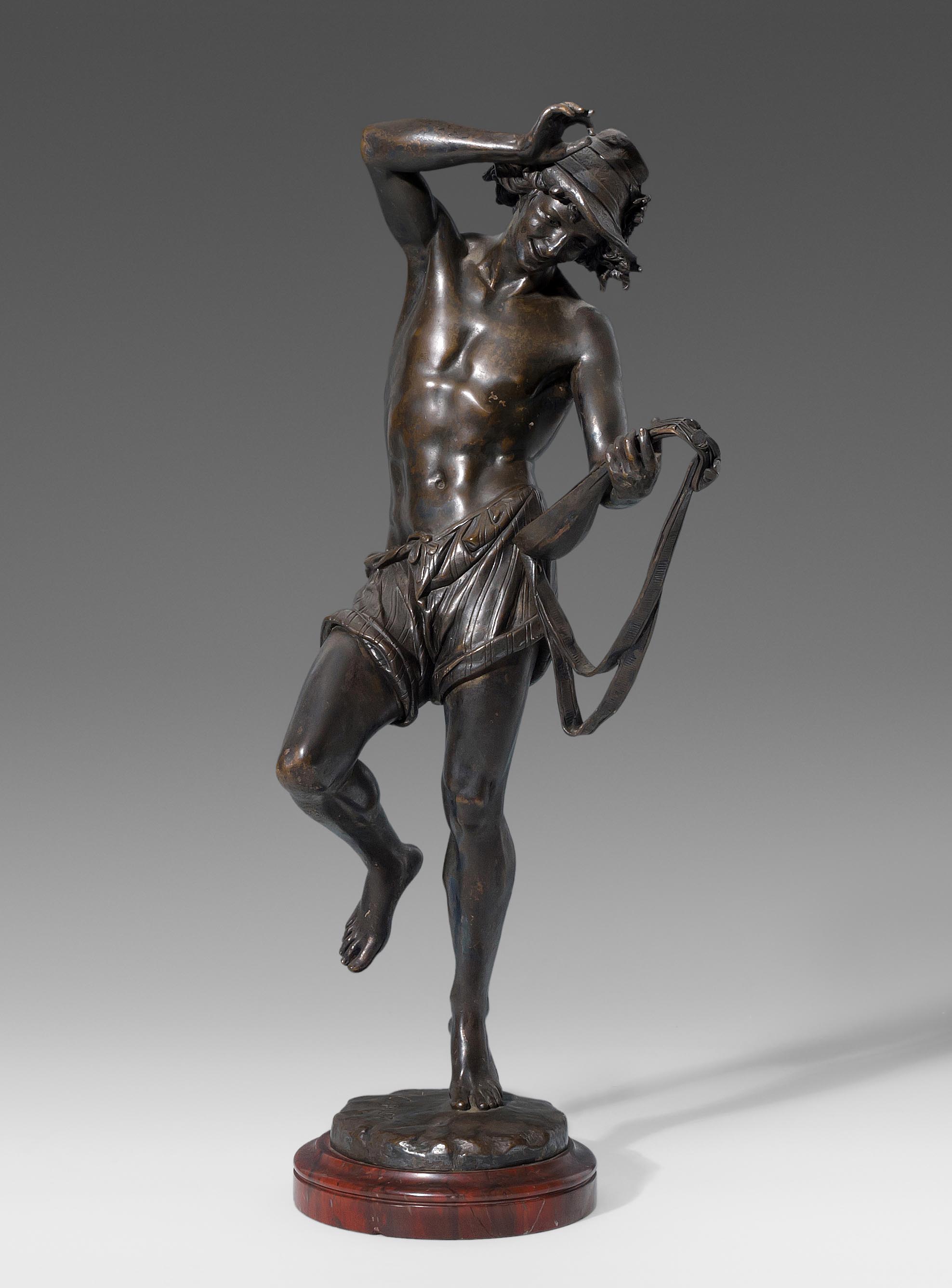 Frankreich, Ende 19.Jh. Nach einem Modell von Albert Ernest Carrier-Belleuse (1824–1887). Bezeichnet: "A. CARRIER". Bronze mit dunkler Patina. Tänzer mit Hut und Mandoline. Roter Marmorsockel. H 46 cm.