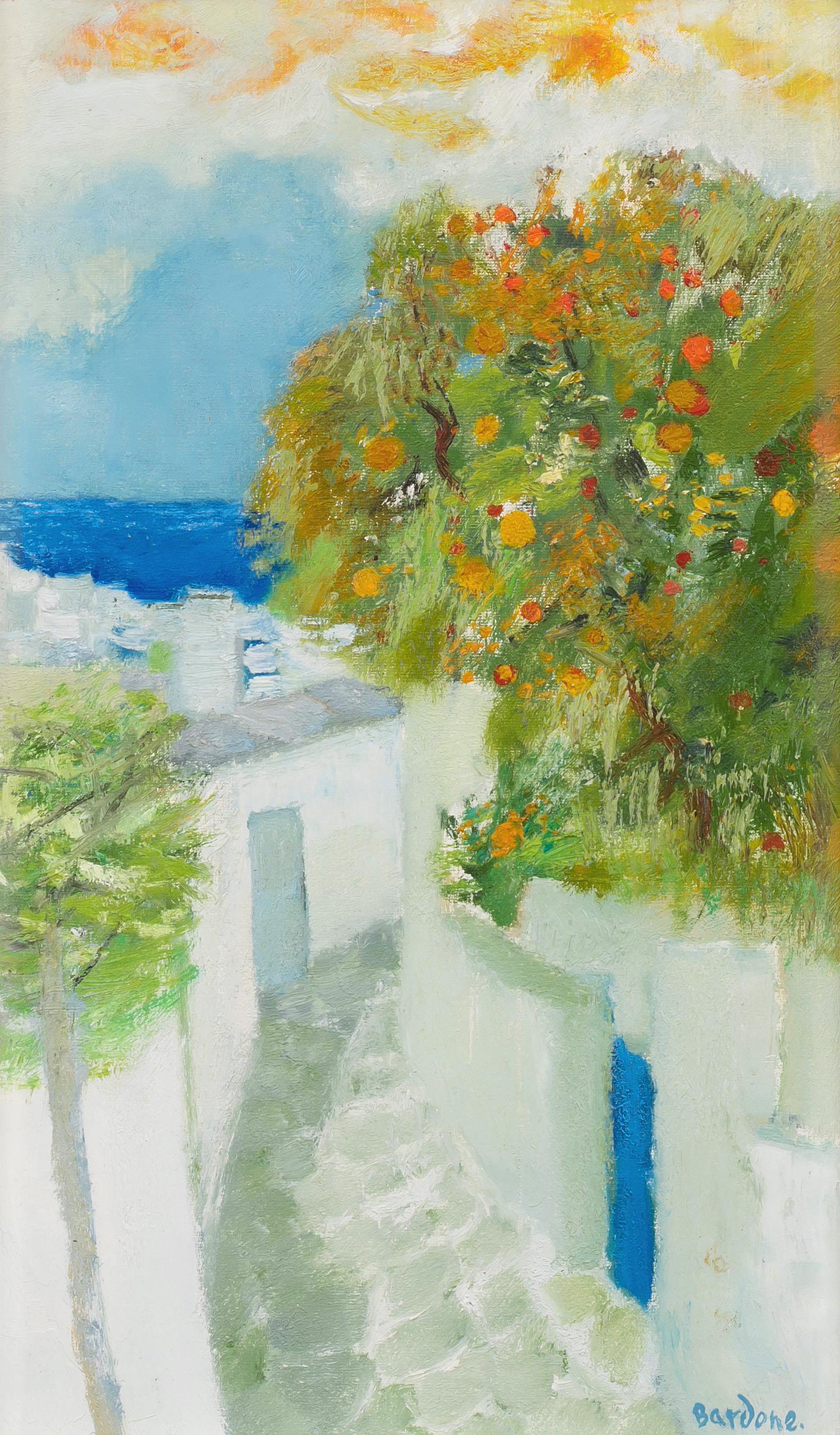 L'Oranger, Mykonos. Öl auf Leinwand. 1974. Unten rechts signiert. Verso auf dem Keilrahmen betitelt, datiert, signiert und nummeriert M.1565. 55x33 cm.