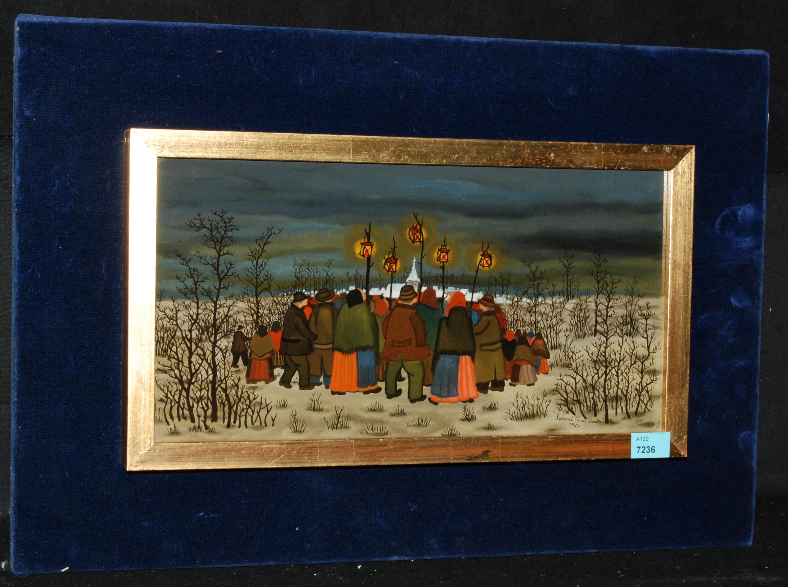 "Die Versammlung". 1967. Hinterglas. Unten rechts signiert und datiert. Verso auf dem Keilrahmen Etikett der Galerie Semiha Huber, Zürich. 18x33 cm.