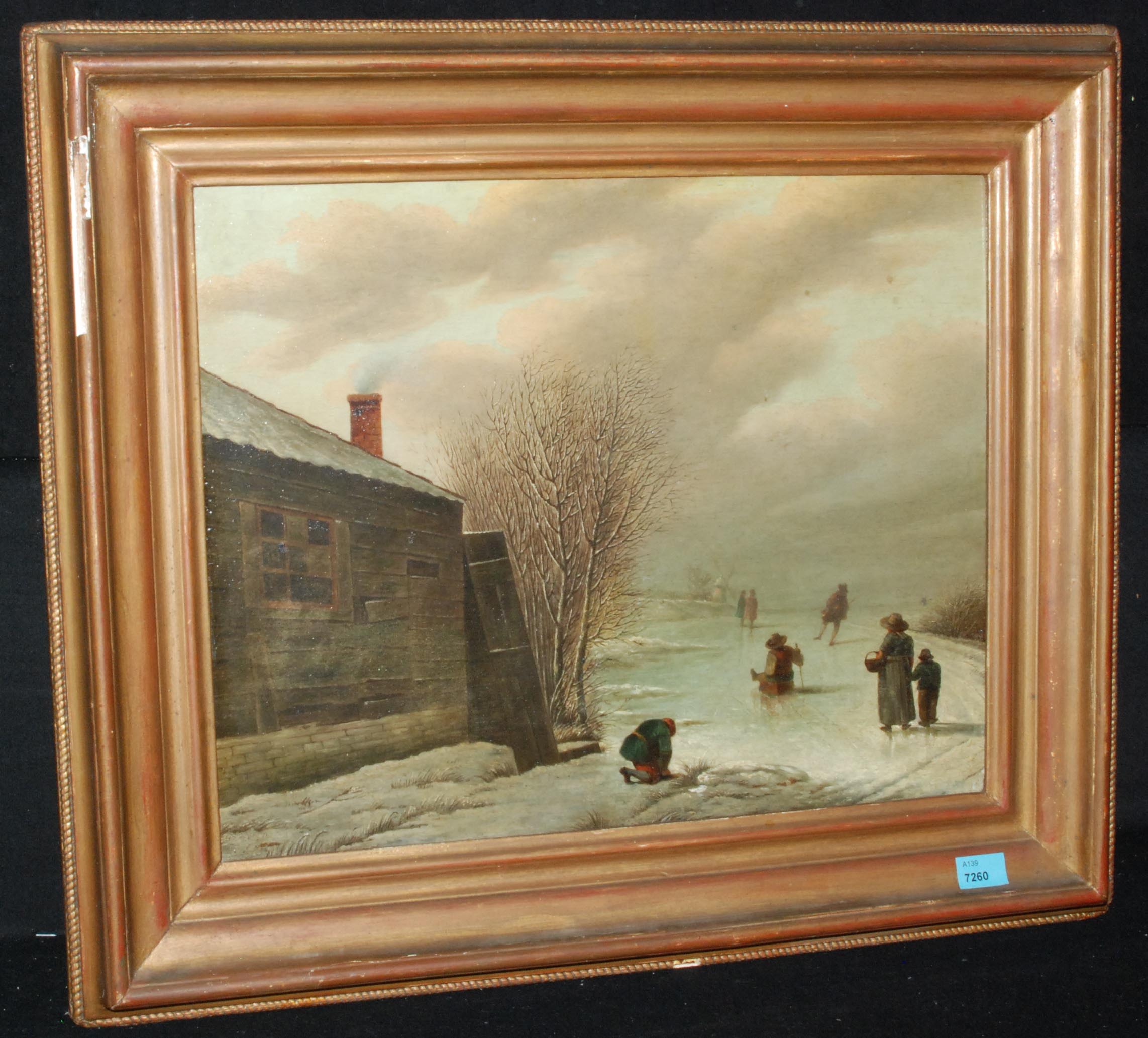 Winterlandschaft mit Eisläufern. Öl auf Holz. 30,4x37,5 cm.