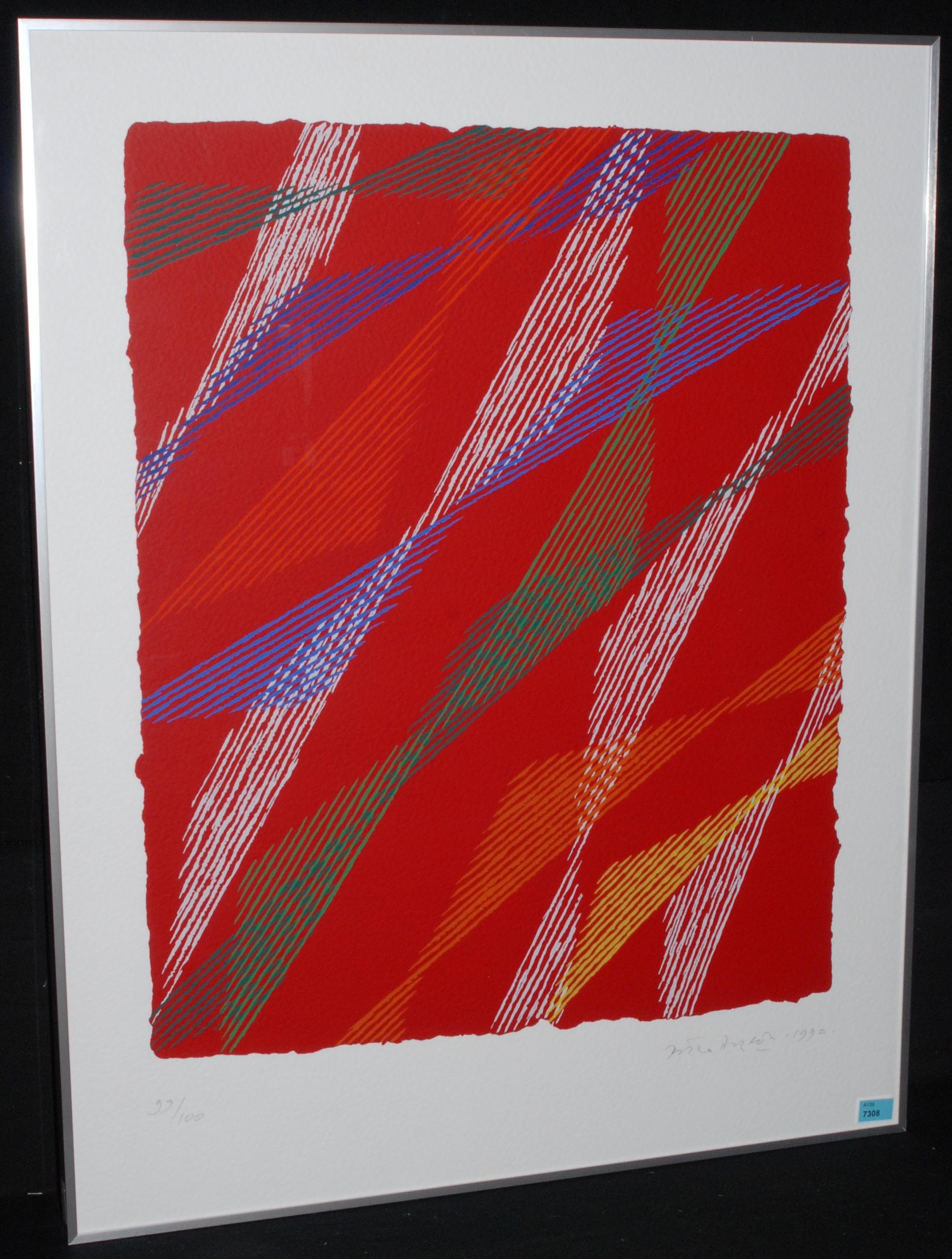 Komposition mit rotem Grund. 1990. Farbserigraphie. 99/100. Unten rechts signiert und datiert. Lichtmass 69x54 cm. Gerahmt.