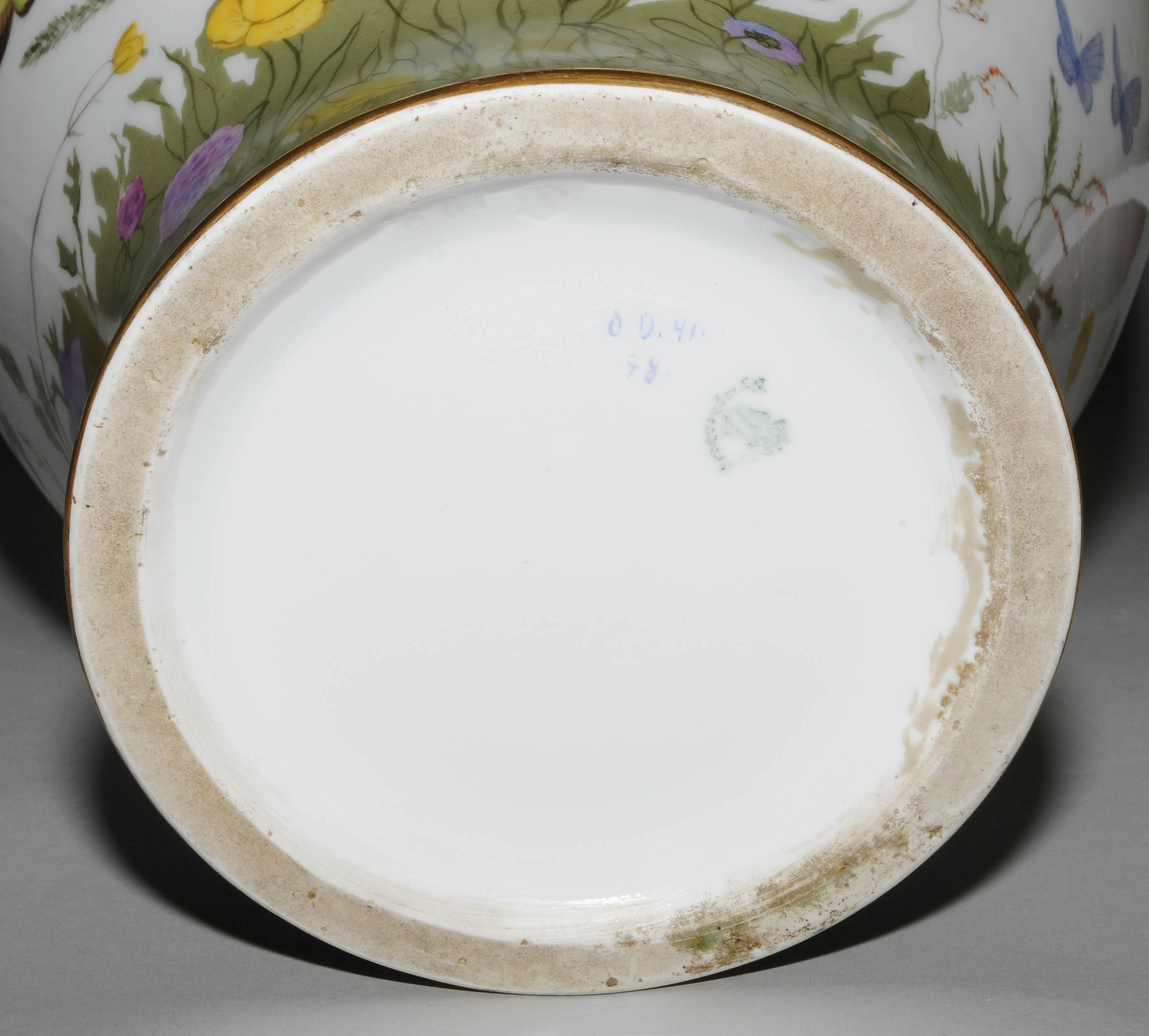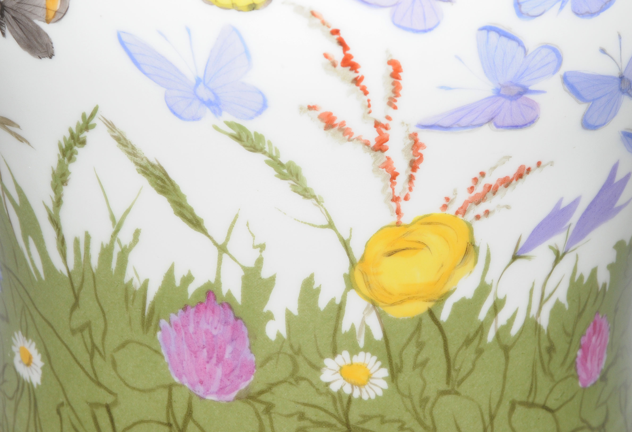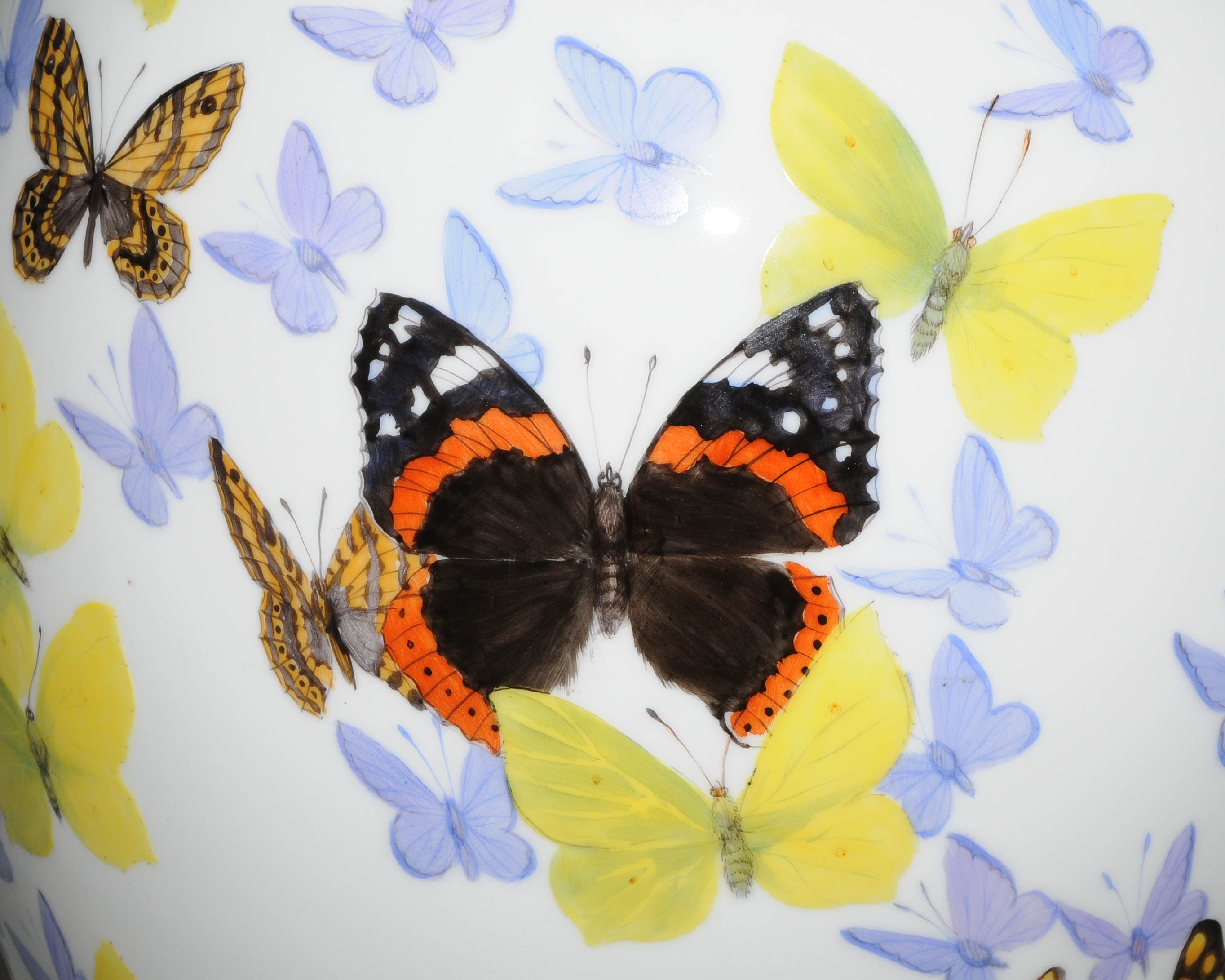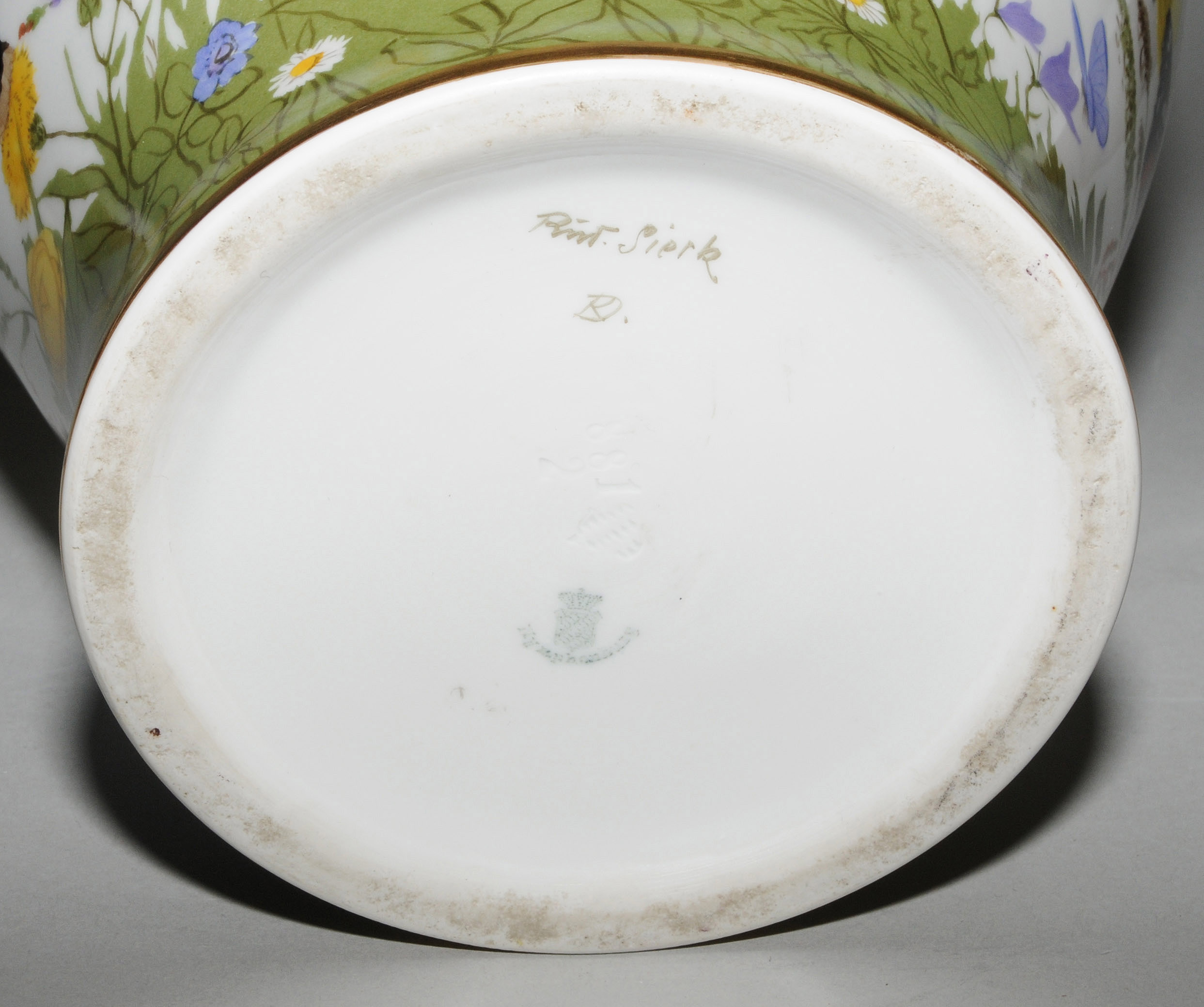 Nach 1920. Entwurf Dekor: Rudolf Sieck (1877–1957). Porzellan, polychrome Malerei mit Blumen und Schmetterlingen. Bezeichnet: Rautenschild (grün), Modellnummer 881, 2 bzw. 881, 3, die kleinere Vase mit der Künstlersignatur "Rud. Sieck" und verschlungenem Monogramm, die grössere mit der Inschrift "D.D.41, 78. H 40 bzw. 51,5 cm.