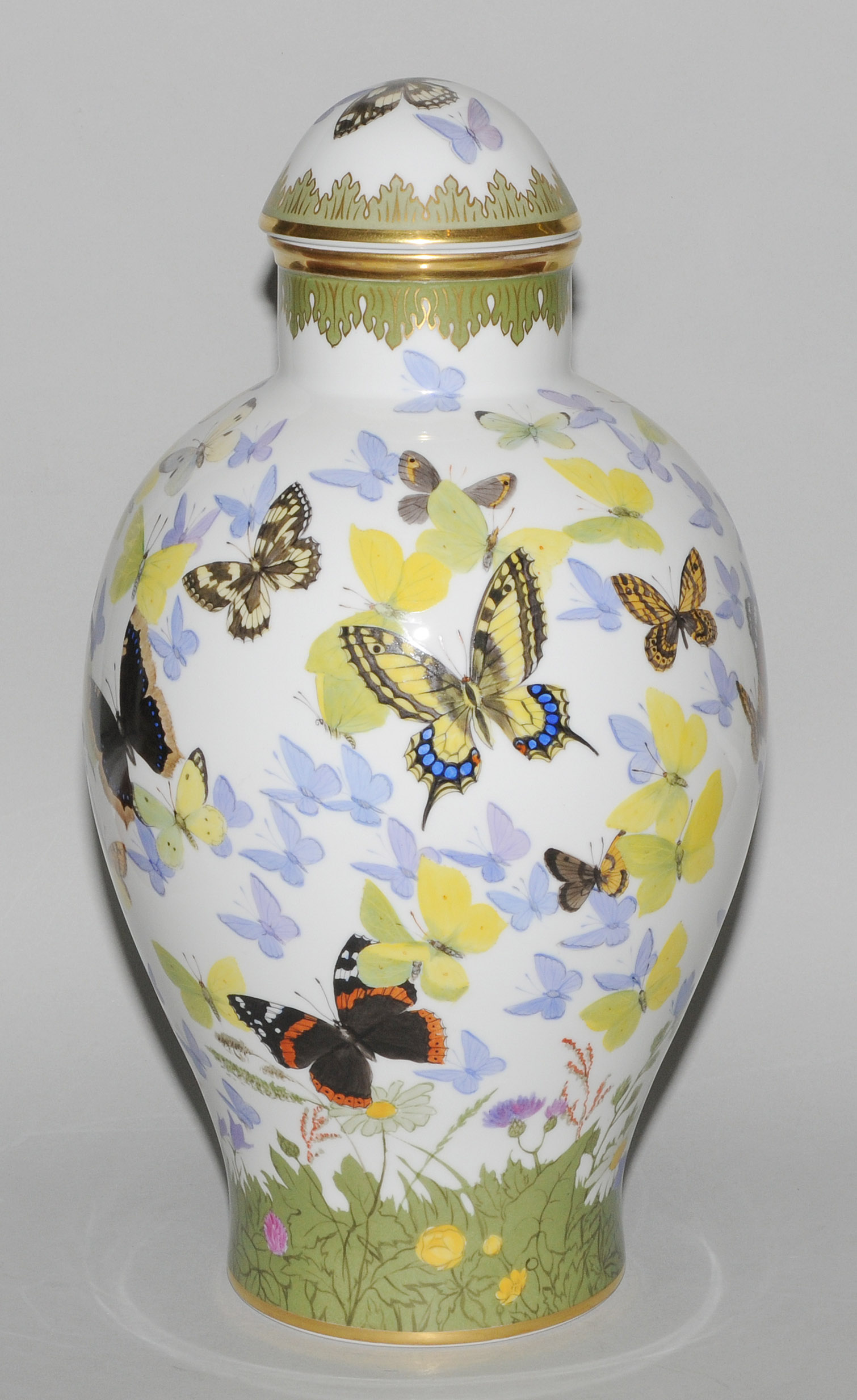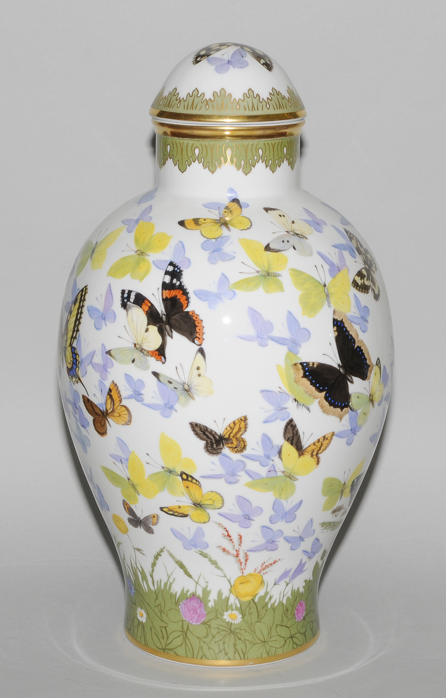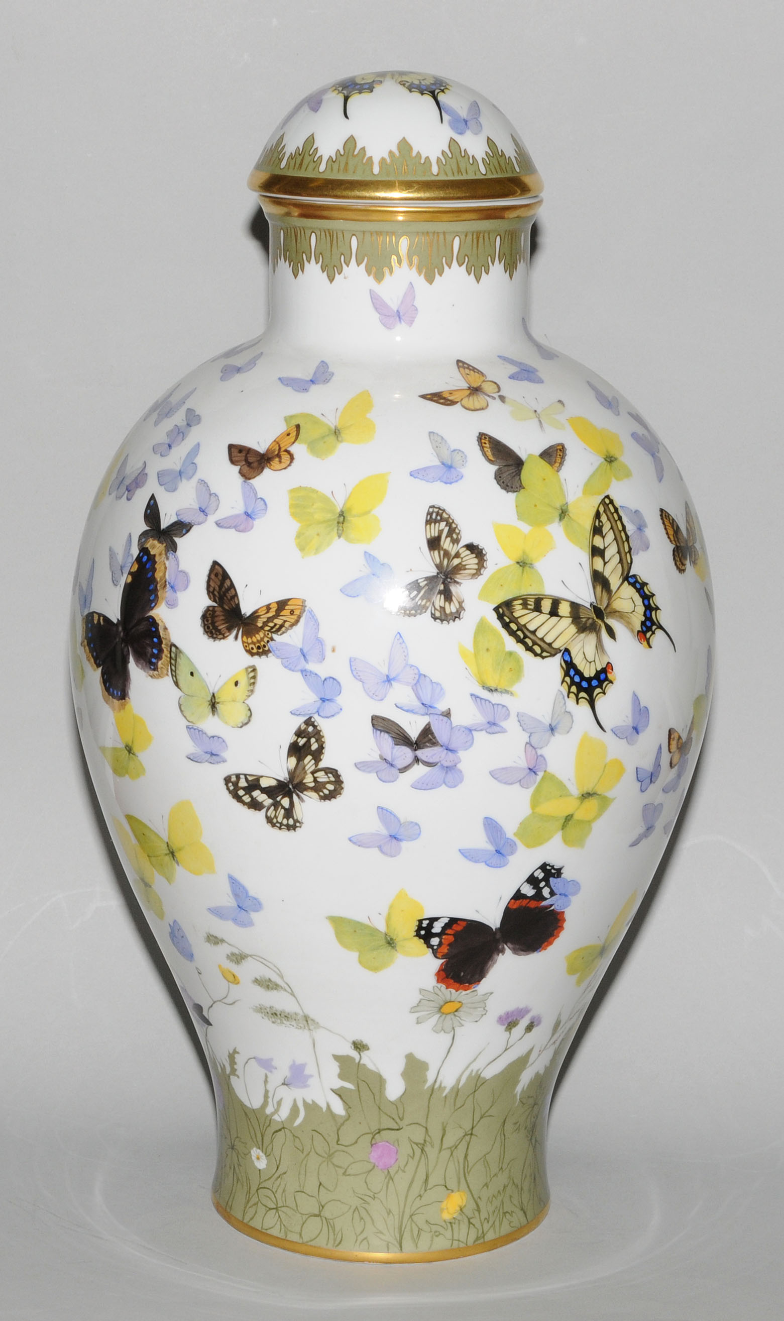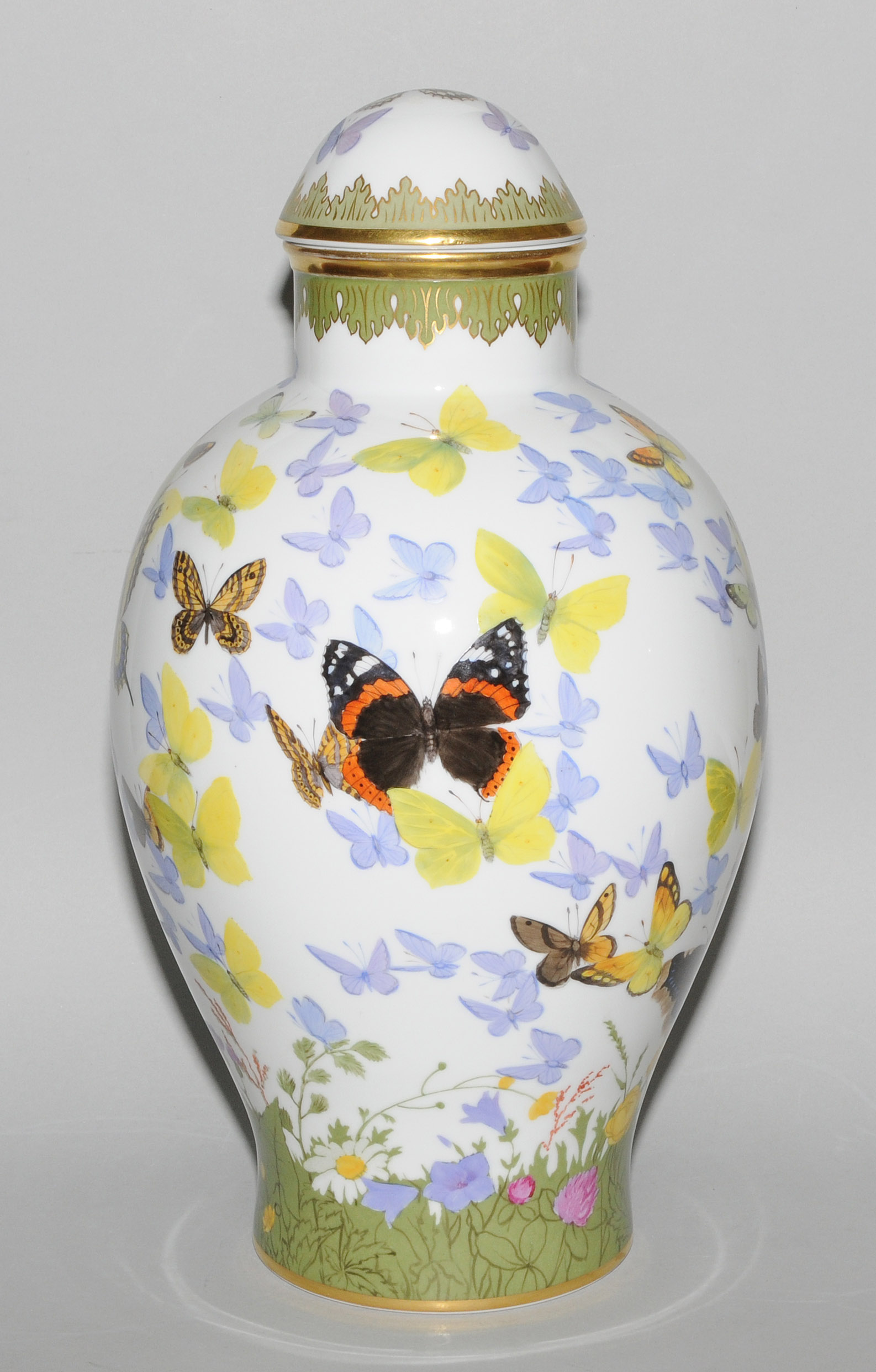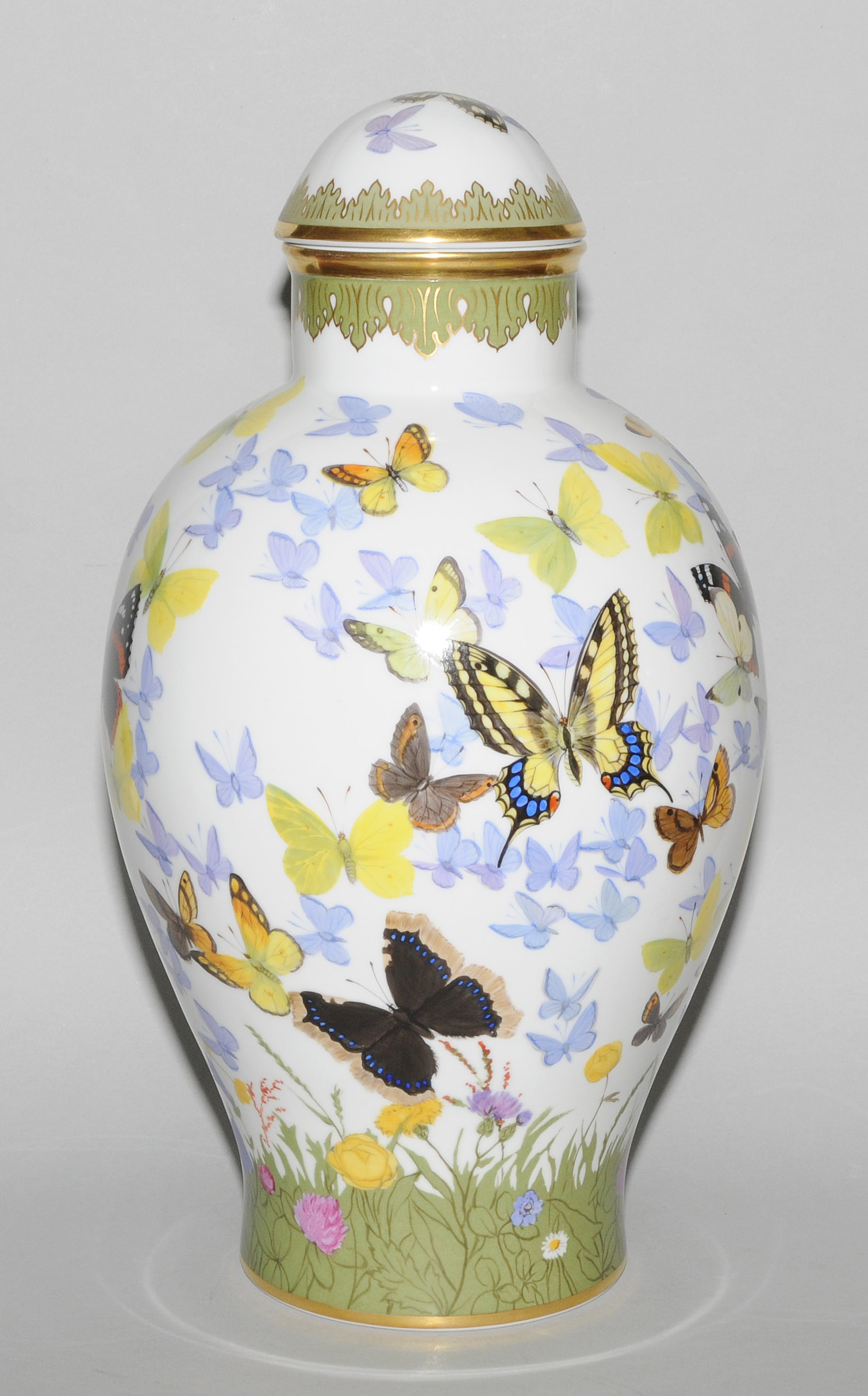 Nach 1920. Entwurf Dekor: Rudolf Sieck (1877–1957). Porzellan, polychrome Malerei mit Blumen und Schmetterlingen. Bezeichnet: Rautenschild (grün), Modellnummer 881, 2 bzw. 881, 3, die kleinere Vase mit der Künstlersignatur "Rud. Sieck" und verschlungenem Monogramm, die grössere mit der Inschrift "D.D.41, 78. H 40 bzw. 51,5 cm.