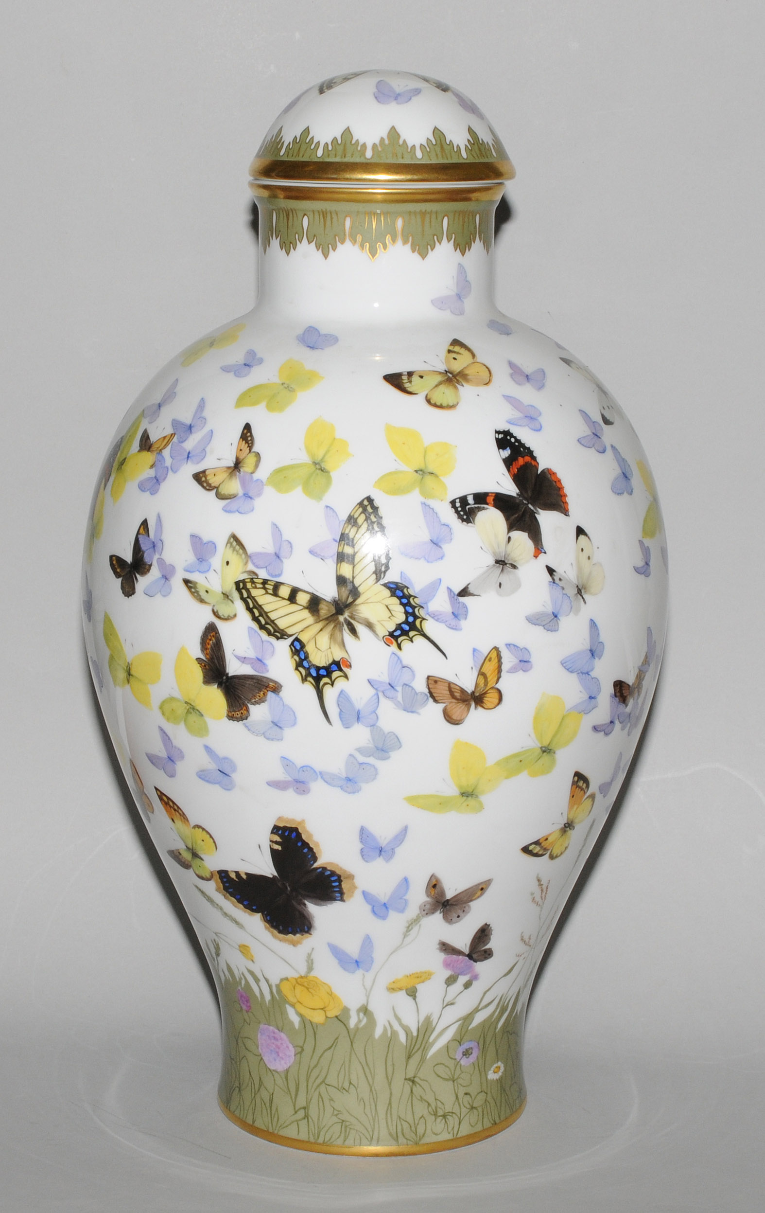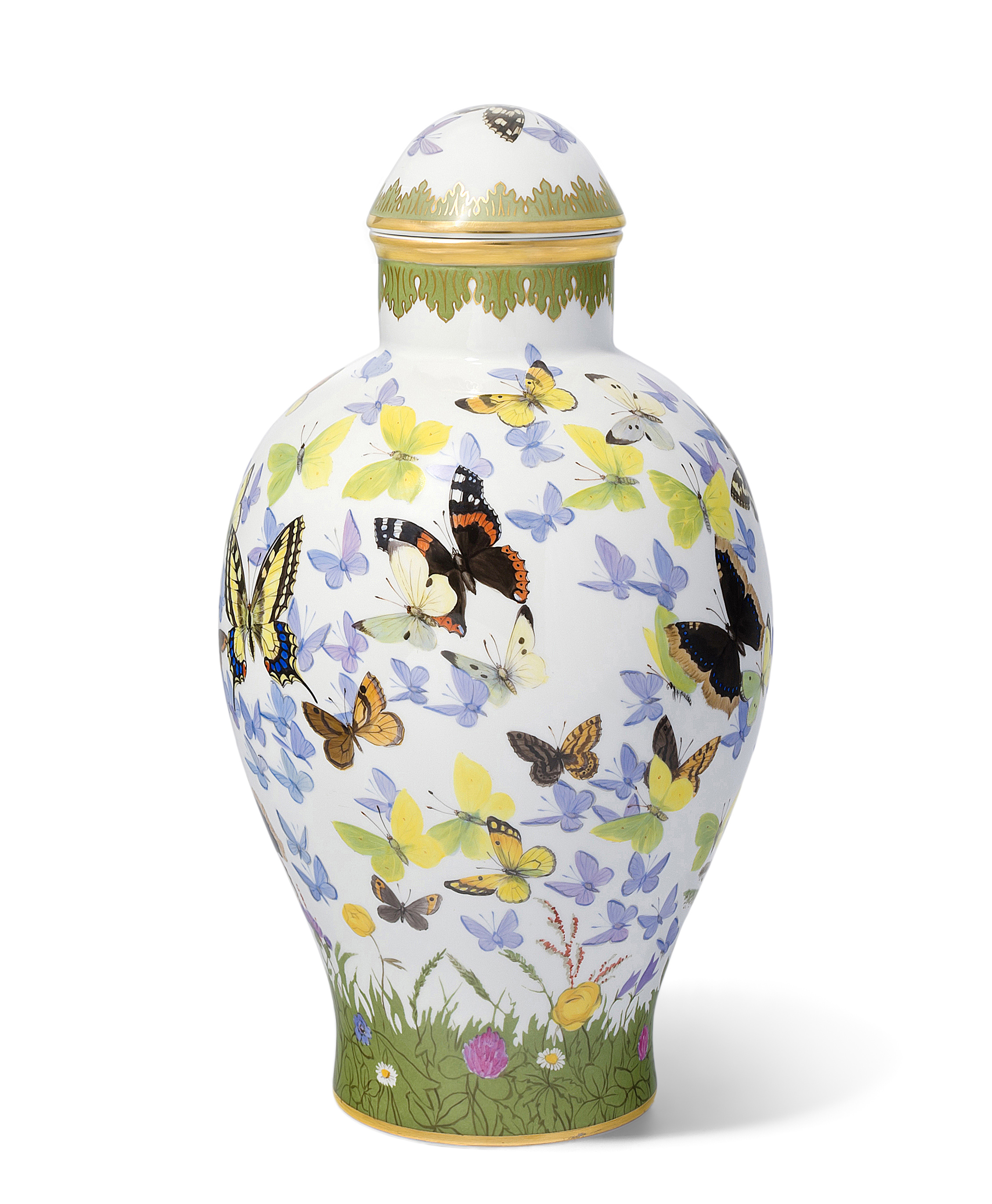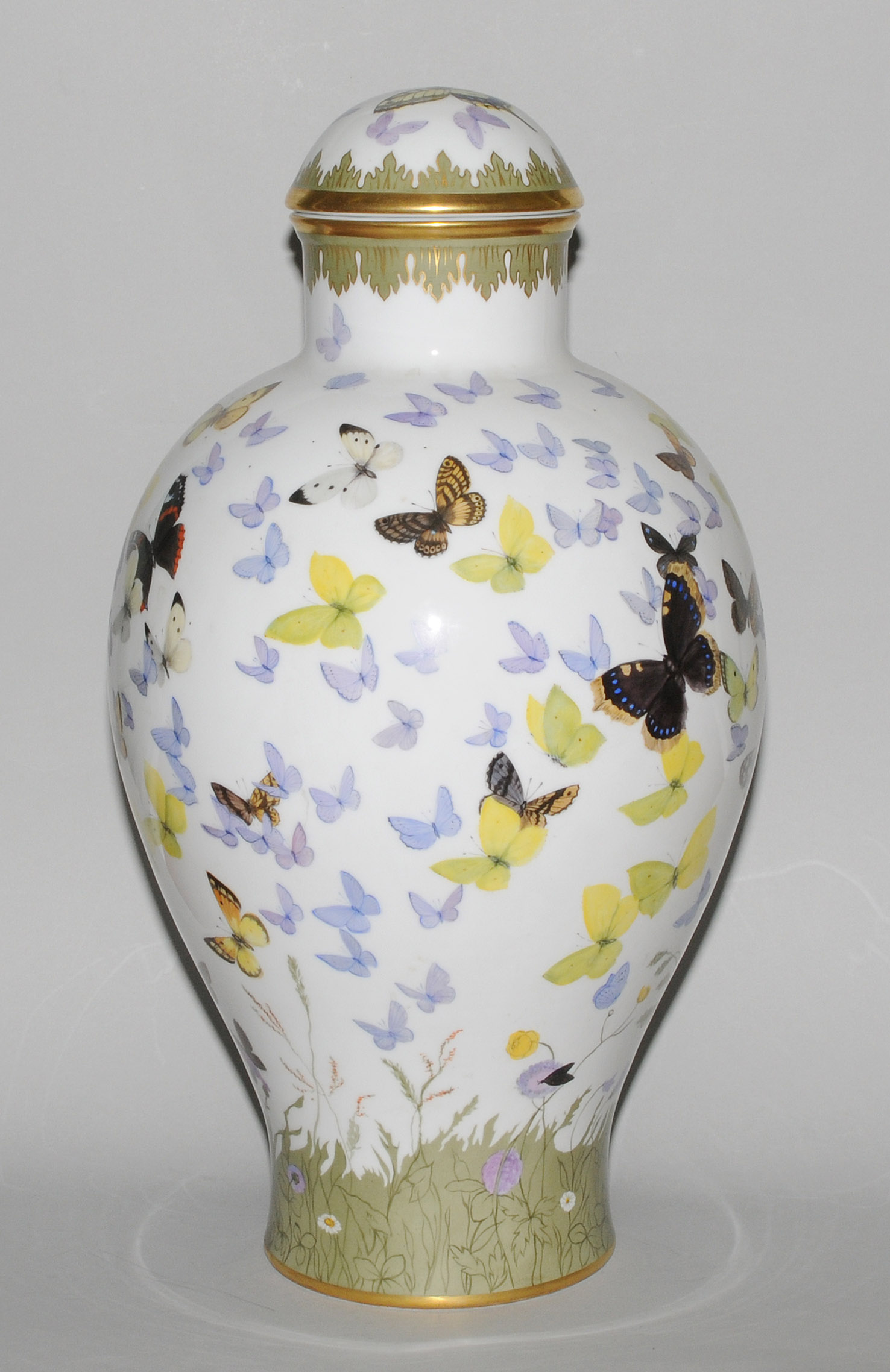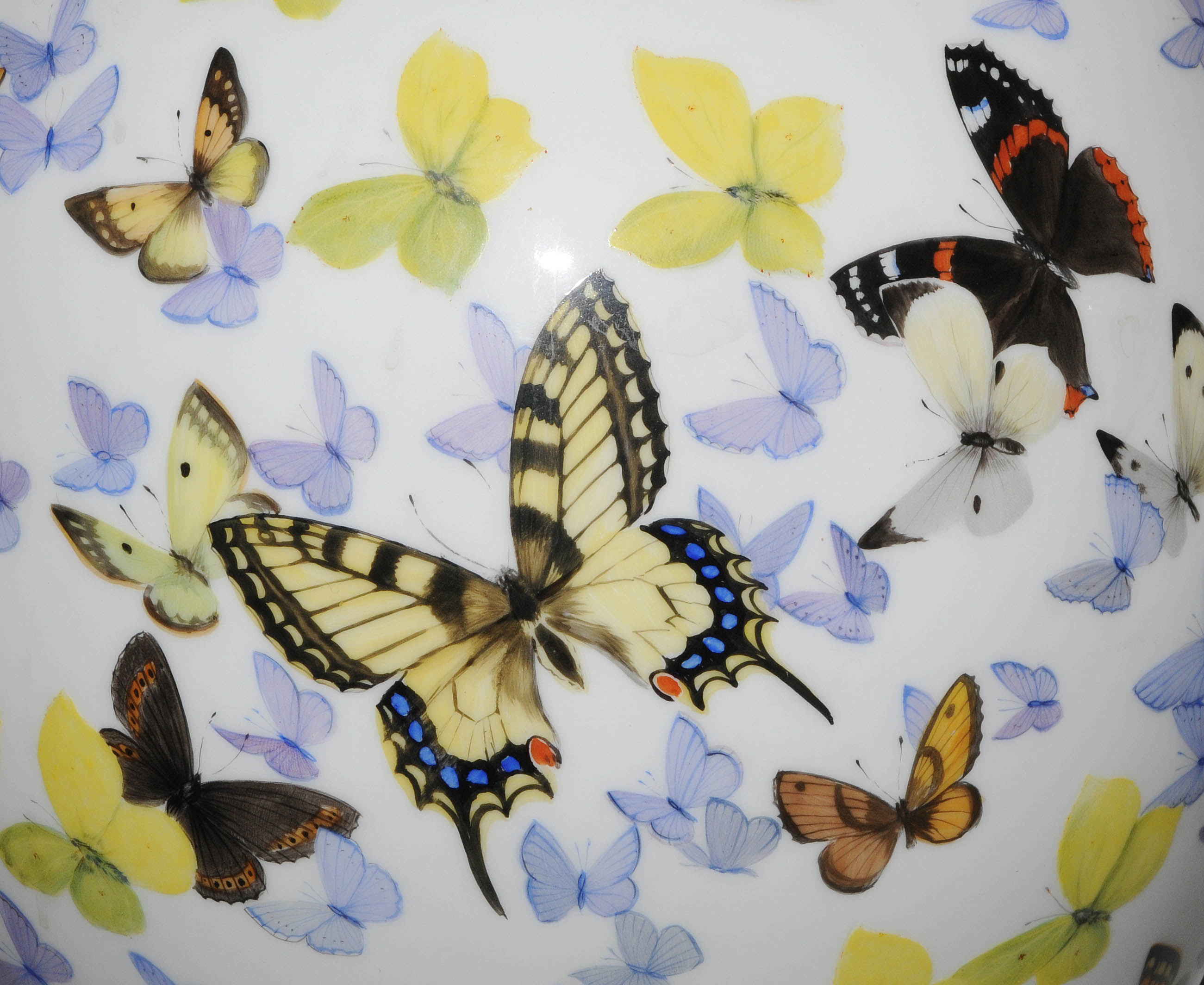 Nach 1920. Entwurf Dekor: Rudolf Sieck (1877–1957). Porzellan, polychrome Malerei mit Blumen und Schmetterlingen. Bezeichnet: Rautenschild (grün), Modellnummer 881, 2 bzw. 881, 3, die kleinere Vase mit der Künstlersignatur "Rud. Sieck" und verschlungenem Monogramm, die grössere mit der Inschrift "D.D.41, 78. H 40 bzw. 51,5 cm.