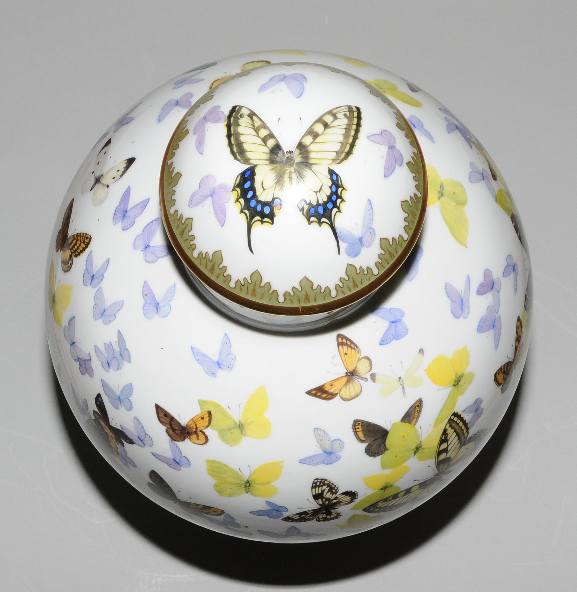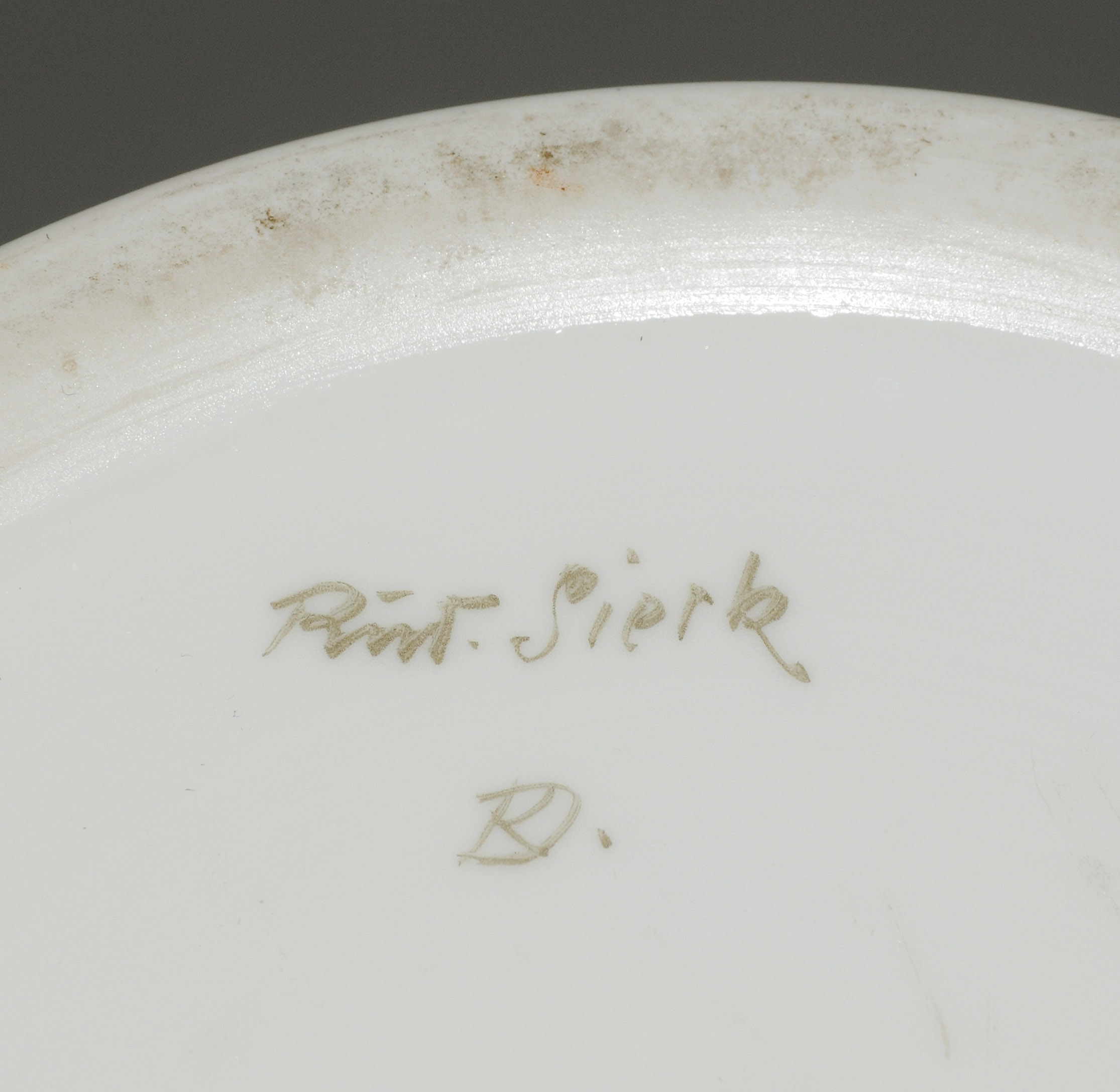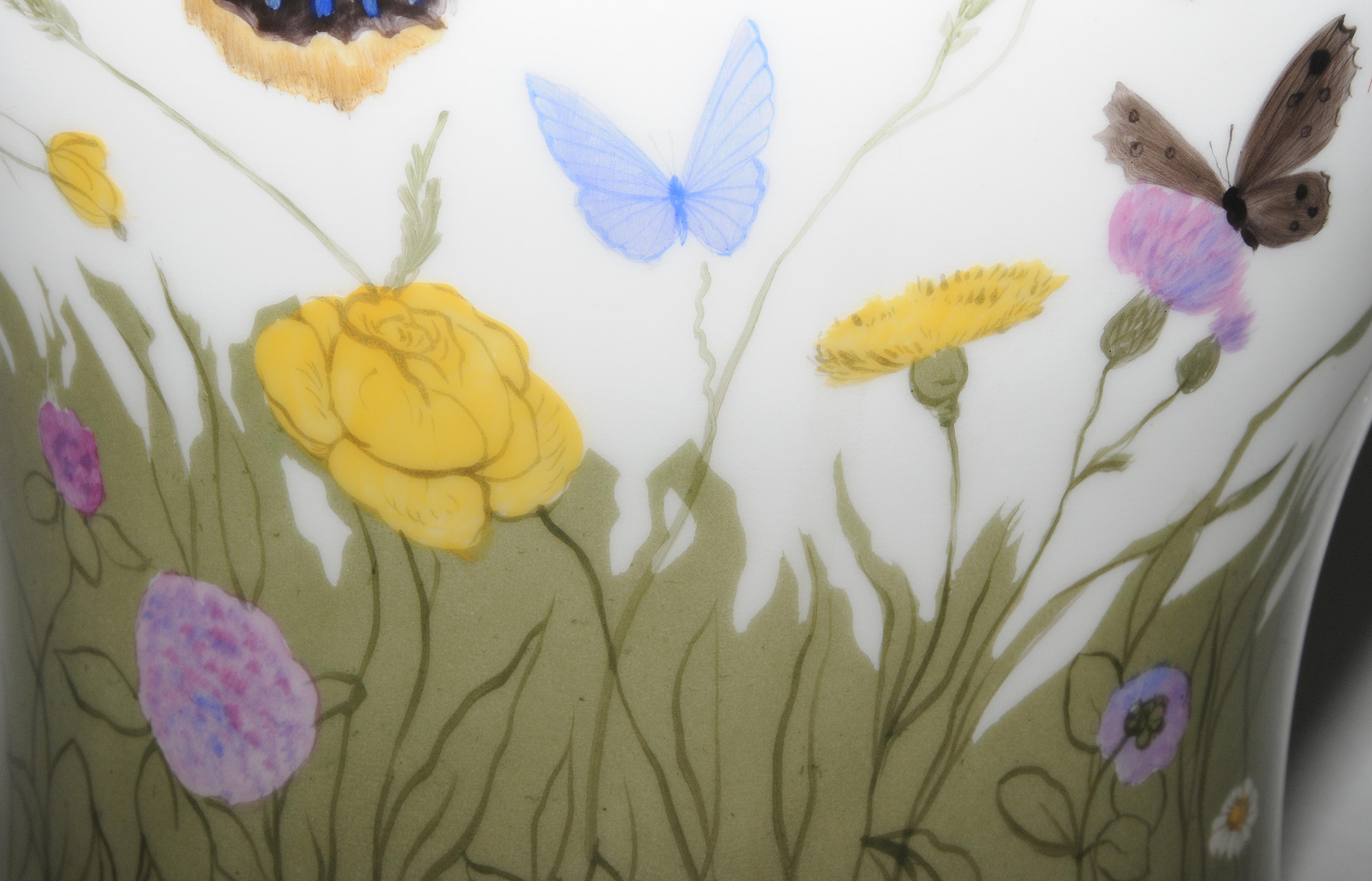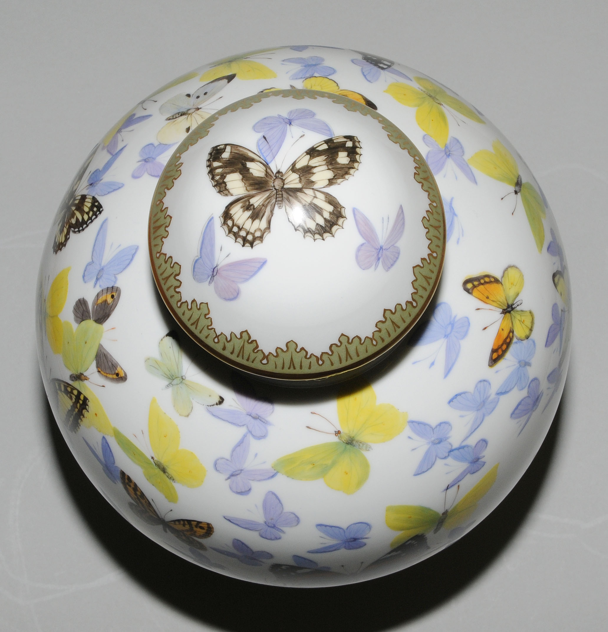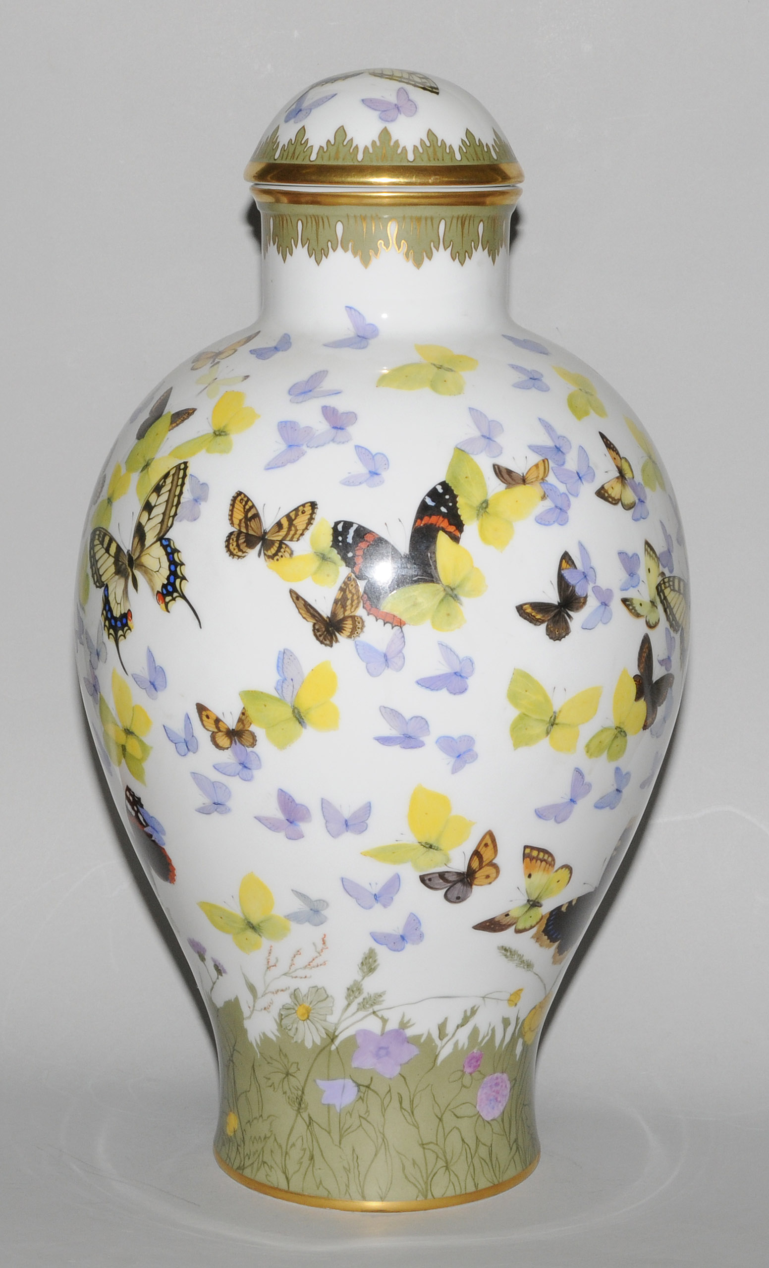 Nach 1920. Entwurf Dekor: Rudolf Sieck (1877–1957). Porzellan, polychrome Malerei mit Blumen und Schmetterlingen. Bezeichnet: Rautenschild (grün), Modellnummer 881, 2 bzw. 881, 3, die kleinere Vase mit der Künstlersignatur "Rud. Sieck" und verschlungenem Monogramm, die grössere mit der Inschrift "D.D.41, 78. H 40 bzw. 51,5 cm.