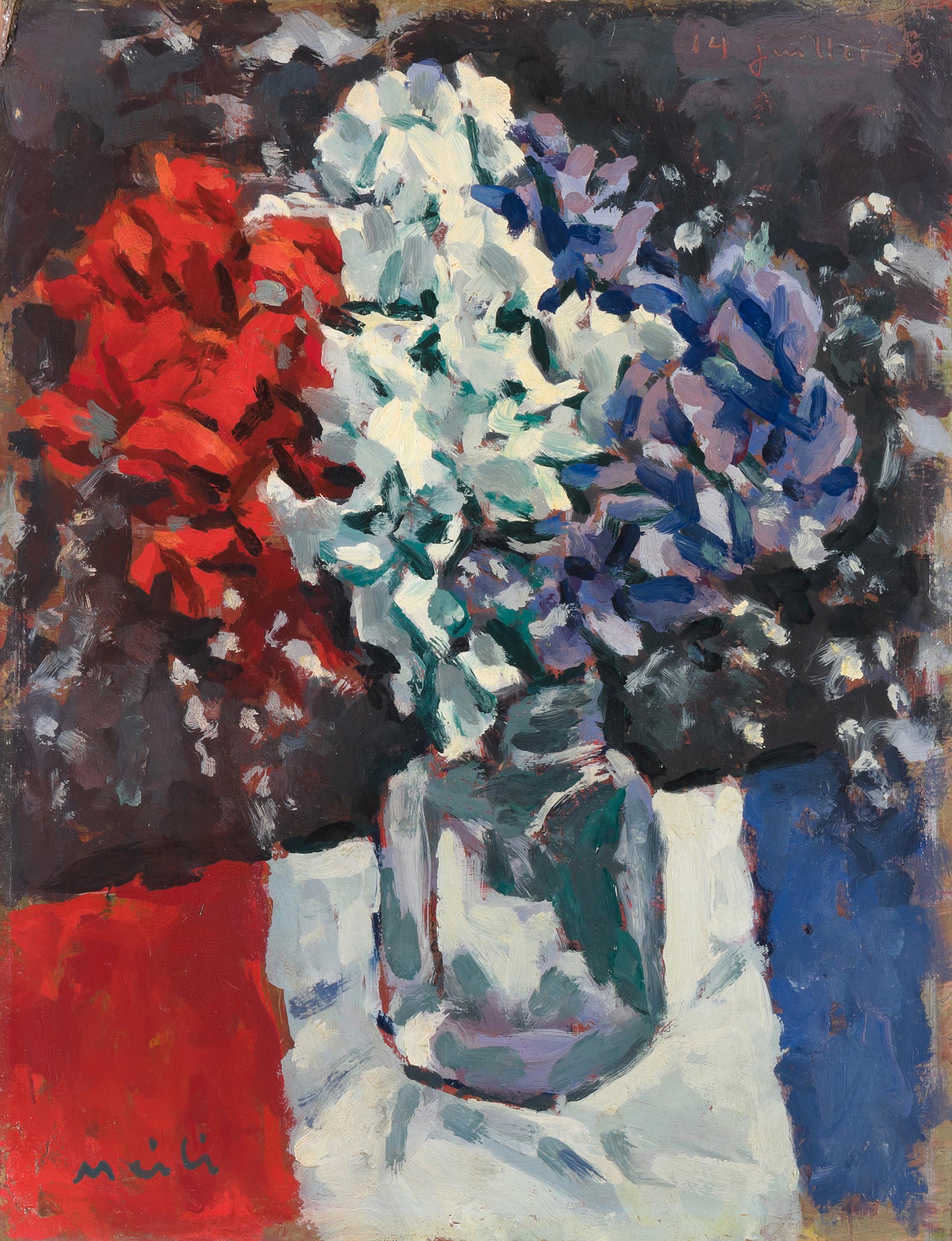 "Bouquet Tricolore", 14 juillet (19)56. Öl auf Karton. Unten links signiert, oben rechts mit geritzter Datierung. 35x27 cm.