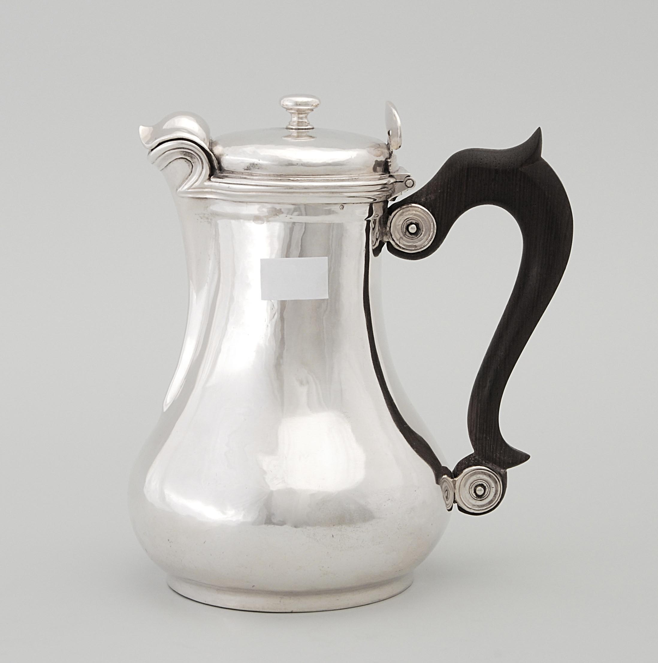 1756–62. Silber. Meistermarke Jean-Guillaume Vealle (Meister 1754). Birnenförmiger Korpus mit Schnabelausguss, scharnierter Deckel mit Scheibenknauf und ohrenförmigem, ebonisiertem Holzhenkel.