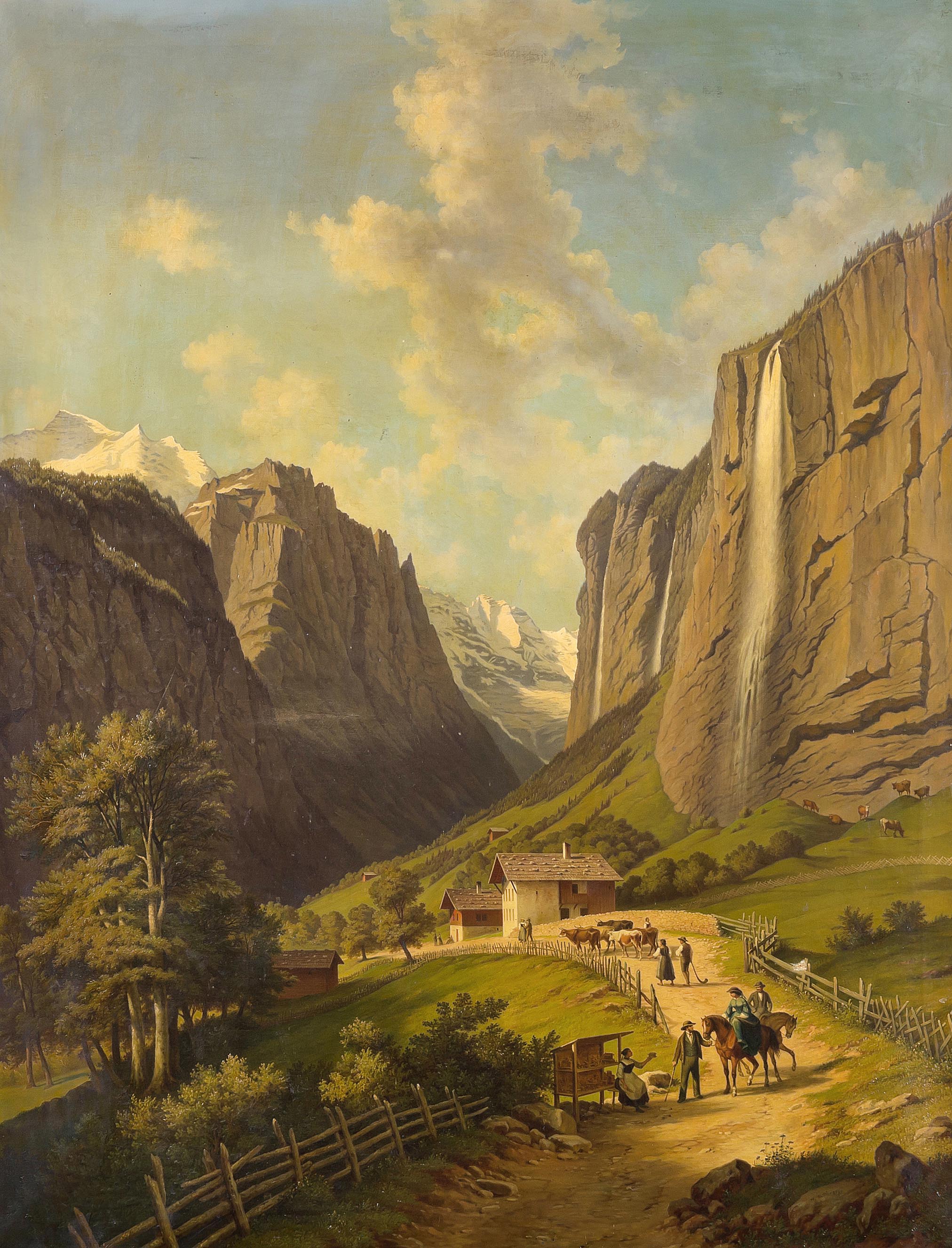 Lauterbrunnental. Im Vordergrund junge Frau Brienzer Holzschnitzereien Touristen anbietend. 1862. Öl auf Leinwand. Unten rechts signiert und datiert. Verso bezeichnet "Staubbach". 128,2x98,2 cm.