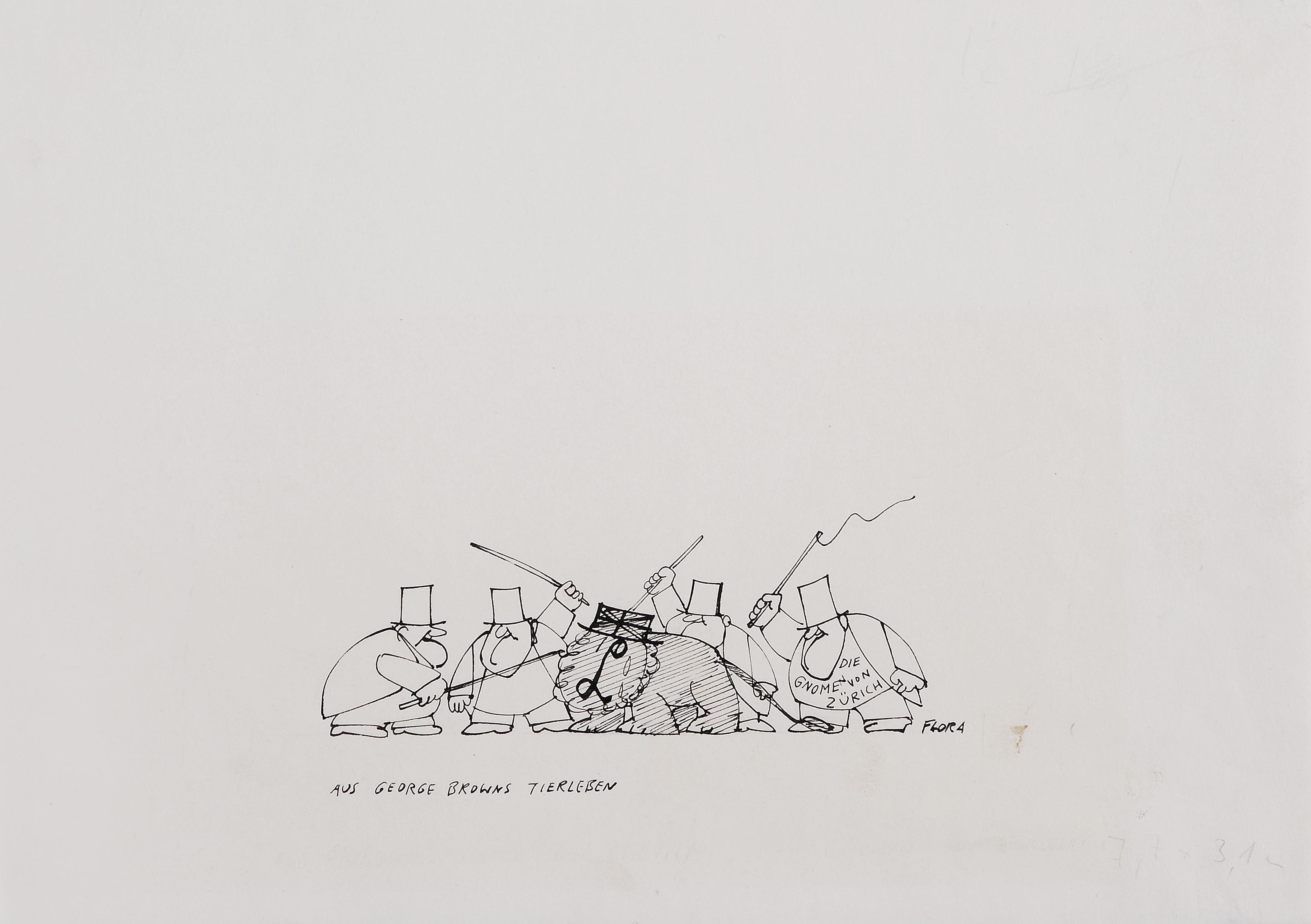 "Aus George Browns Tierleben". Tusche auf Papier. Rechts in Tusche signiert. Blattgrösse 21x29,7 cm. -Blatt leicht gebräunt. Hellerer Lichtrand. Knitter. Wenig fleckig. Ränder und Ecken leicht bestossen mit wenigen, winzigen Einrissen. Verso Papierverlust.
