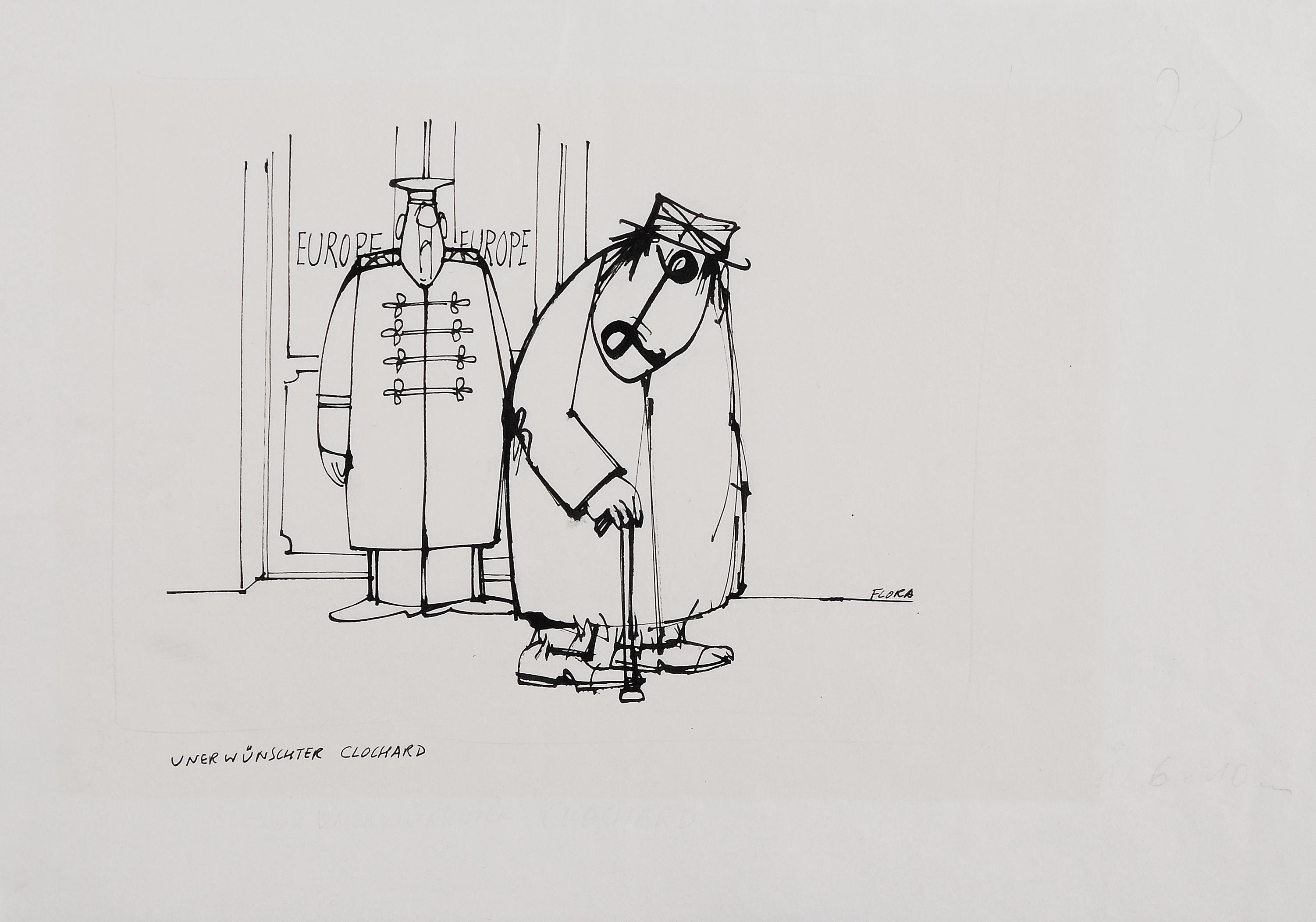 "Unerwünschter Clochard". Tusche auf Papier. Rechts in Tusche signiert. Blattgrösse 21x29,7 cm. -Blatt leicht gebräunt. Hellerer Lichtrand. Wenig fleckig. Knitter. Ränder und Ecken leicht bestossen.