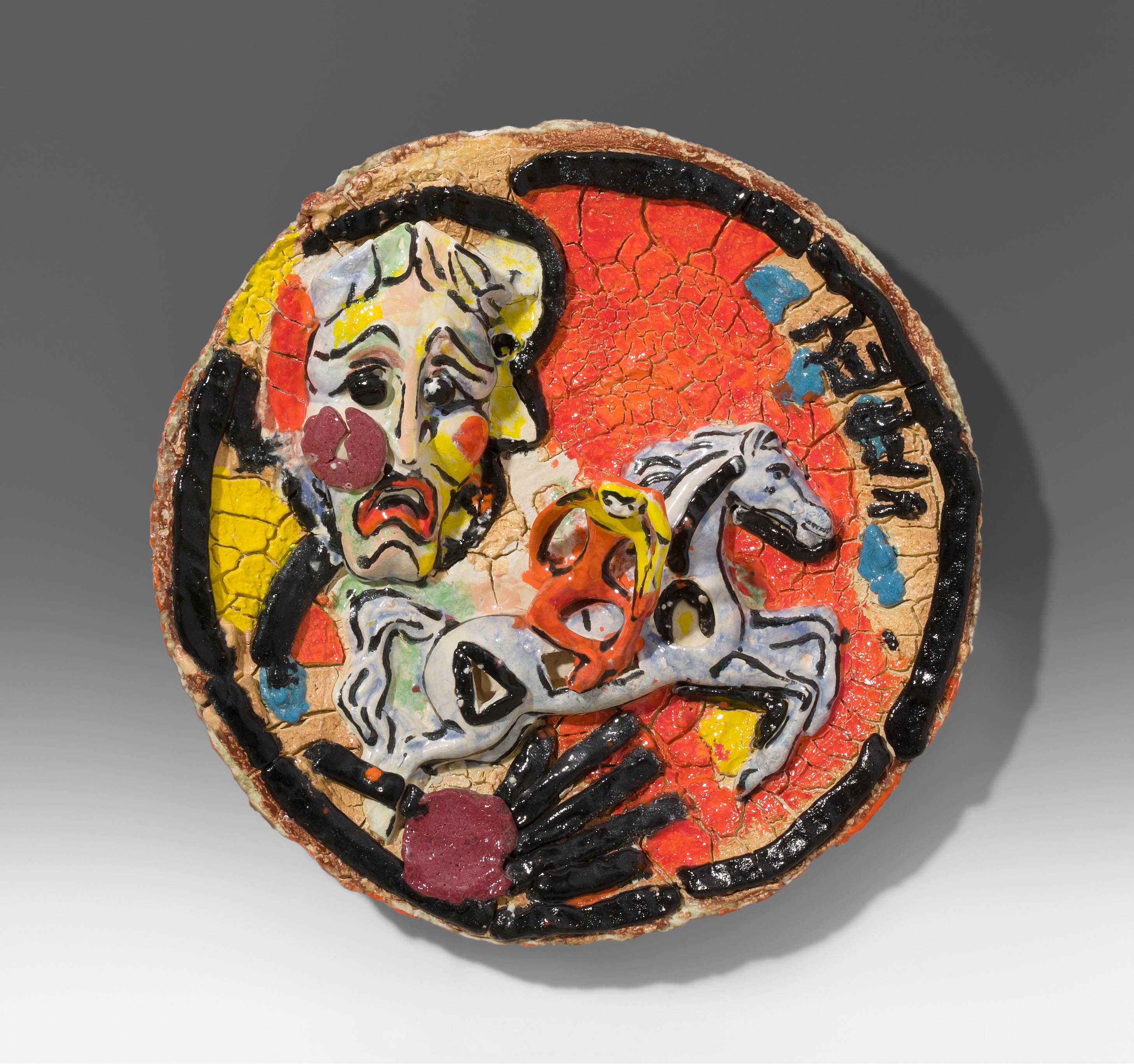 Blue Face and Red Monkey. 1997. Bemalte Keramikplatte. Am Rand der Platte signiert. D 63 cm. -Patina. Leicht schmutzig. Wenige, kleine Bestossungen.