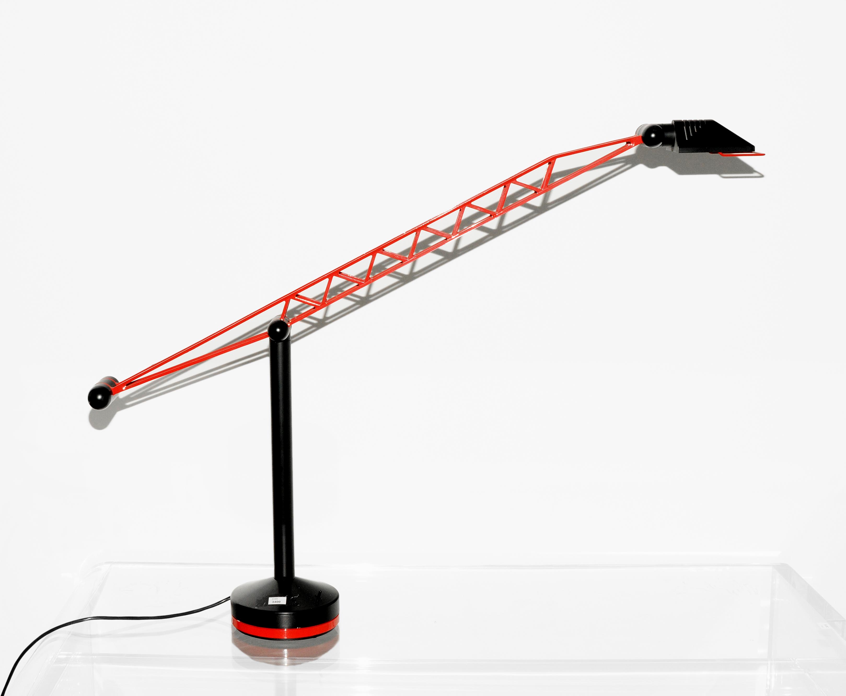 Tischleuchte, 1986. Hersteller Tronconi, Italien. In Form eines Baukrans. Metall und Kunststoff schwarz und rot lackiert. Beweglicher Arm. Guter Zustand und Funktionsfähig. H 45 cm. L 98 cm.