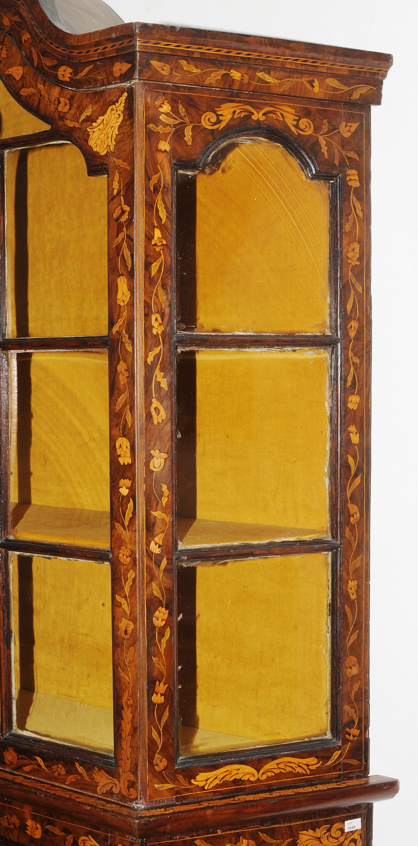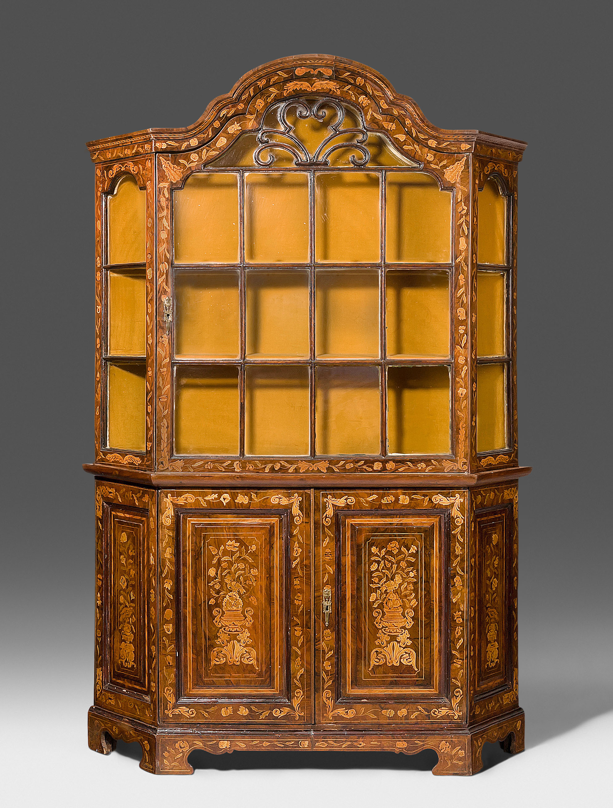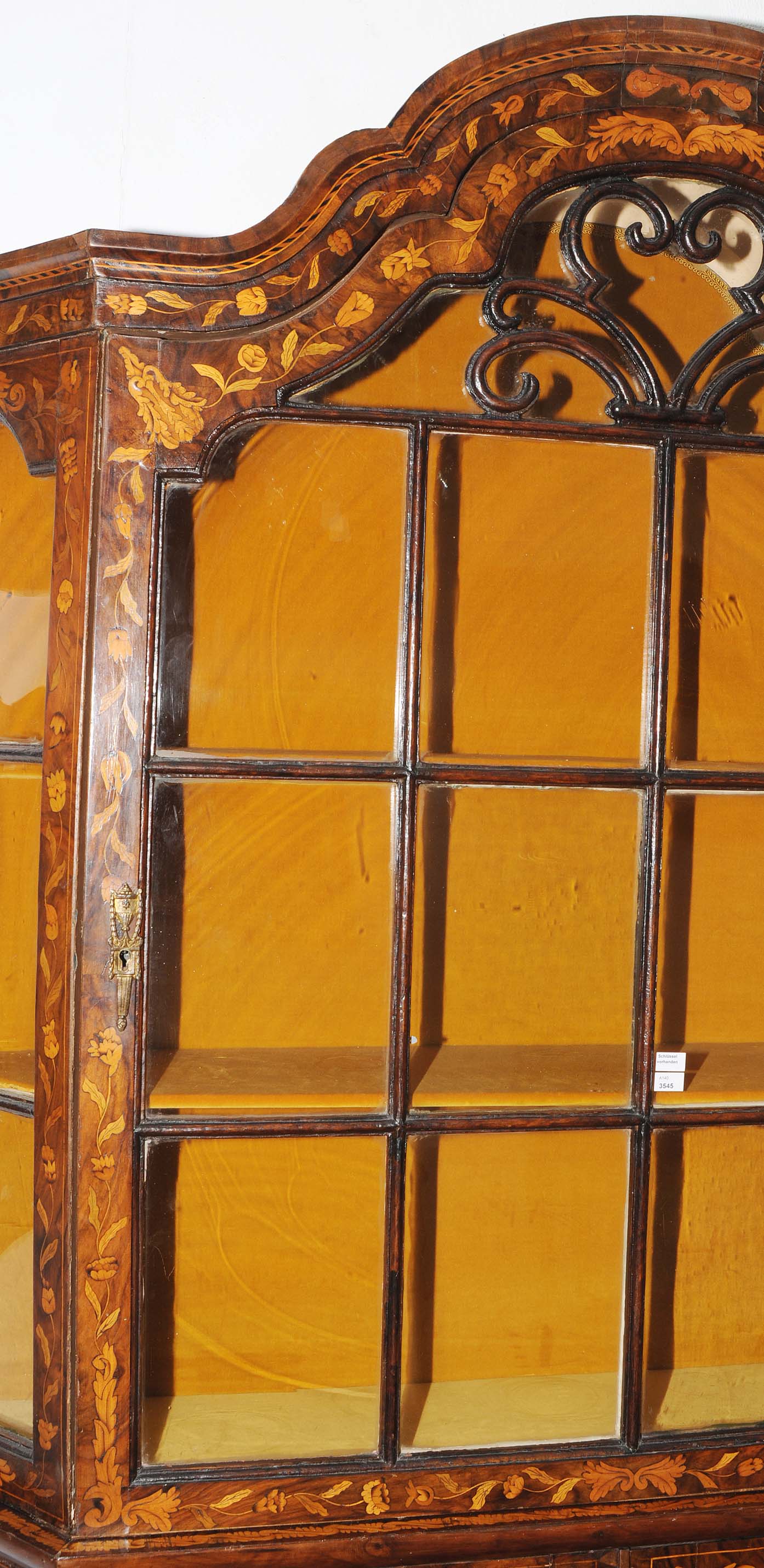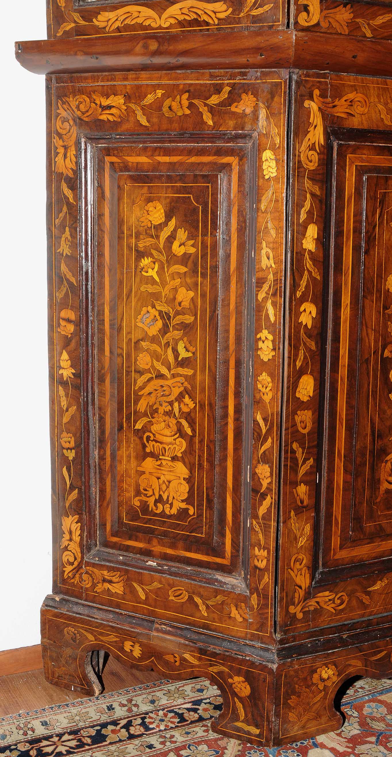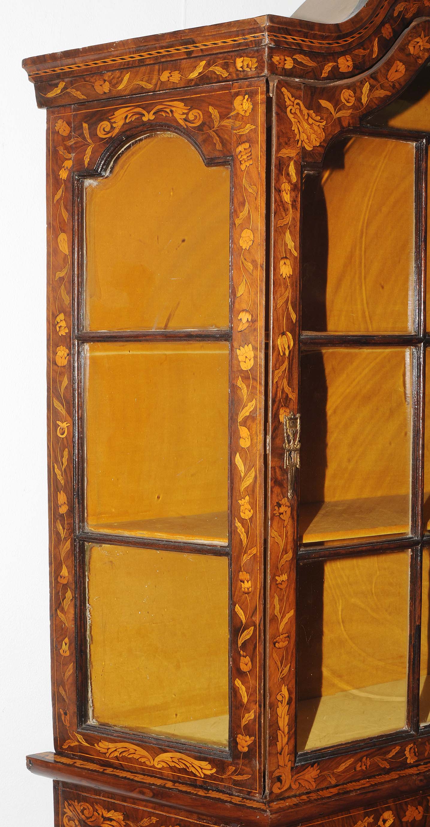 Holland. Barock. Nussbaum. Zweitüriger Unterbau mit schräggestellten Seiten. Eintürig, verglaster Aufsatz mit Giebelabschluss. Reich mit floralen Einlegearbeiten. Gebrauchsspuren. 136x30x207 cm.