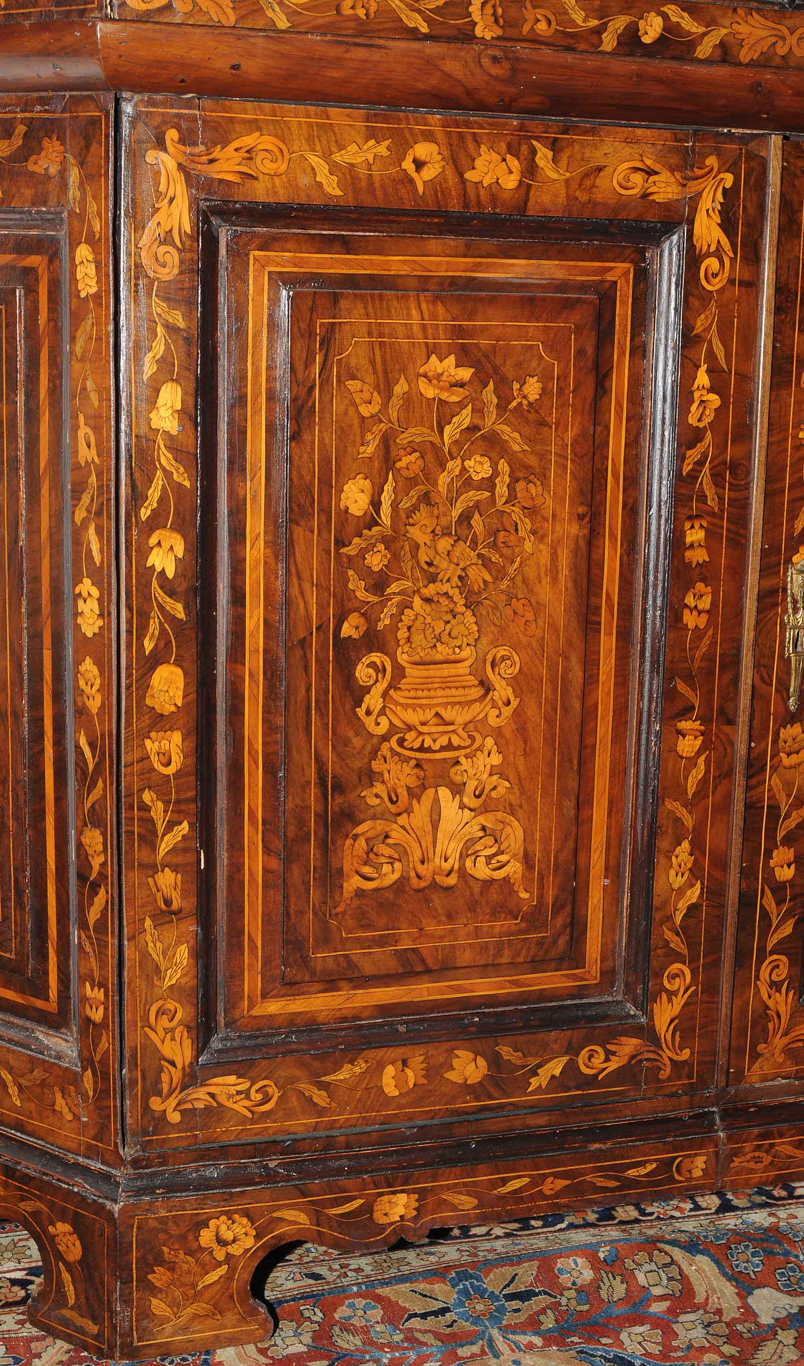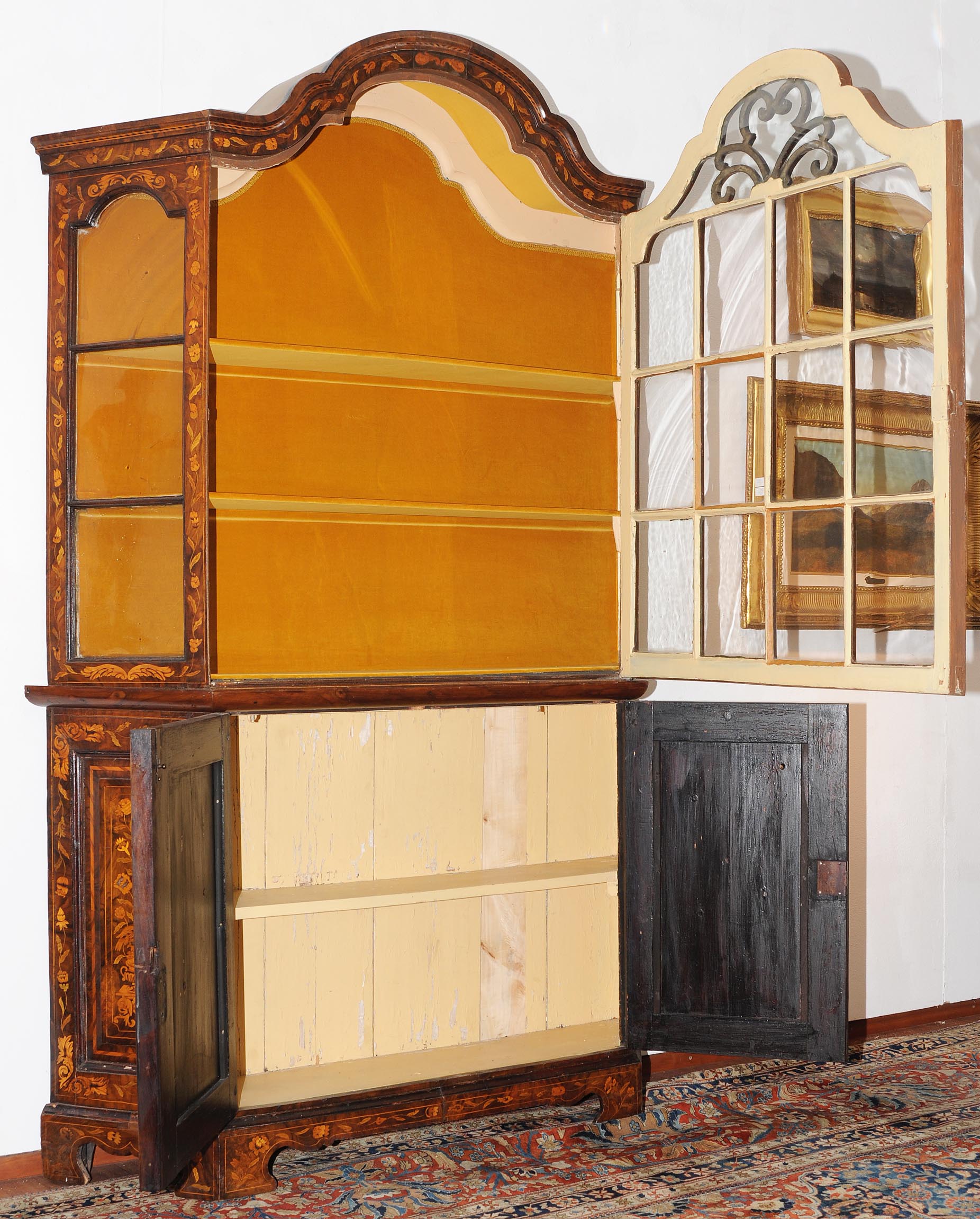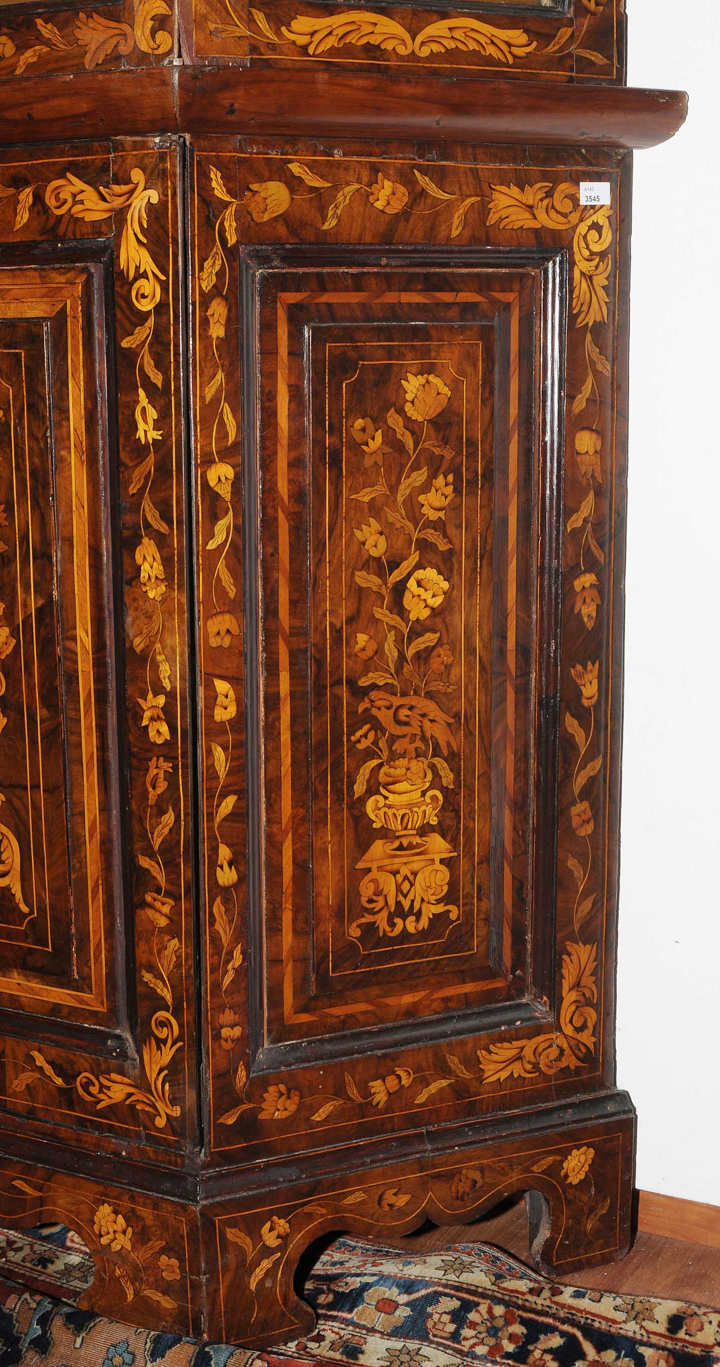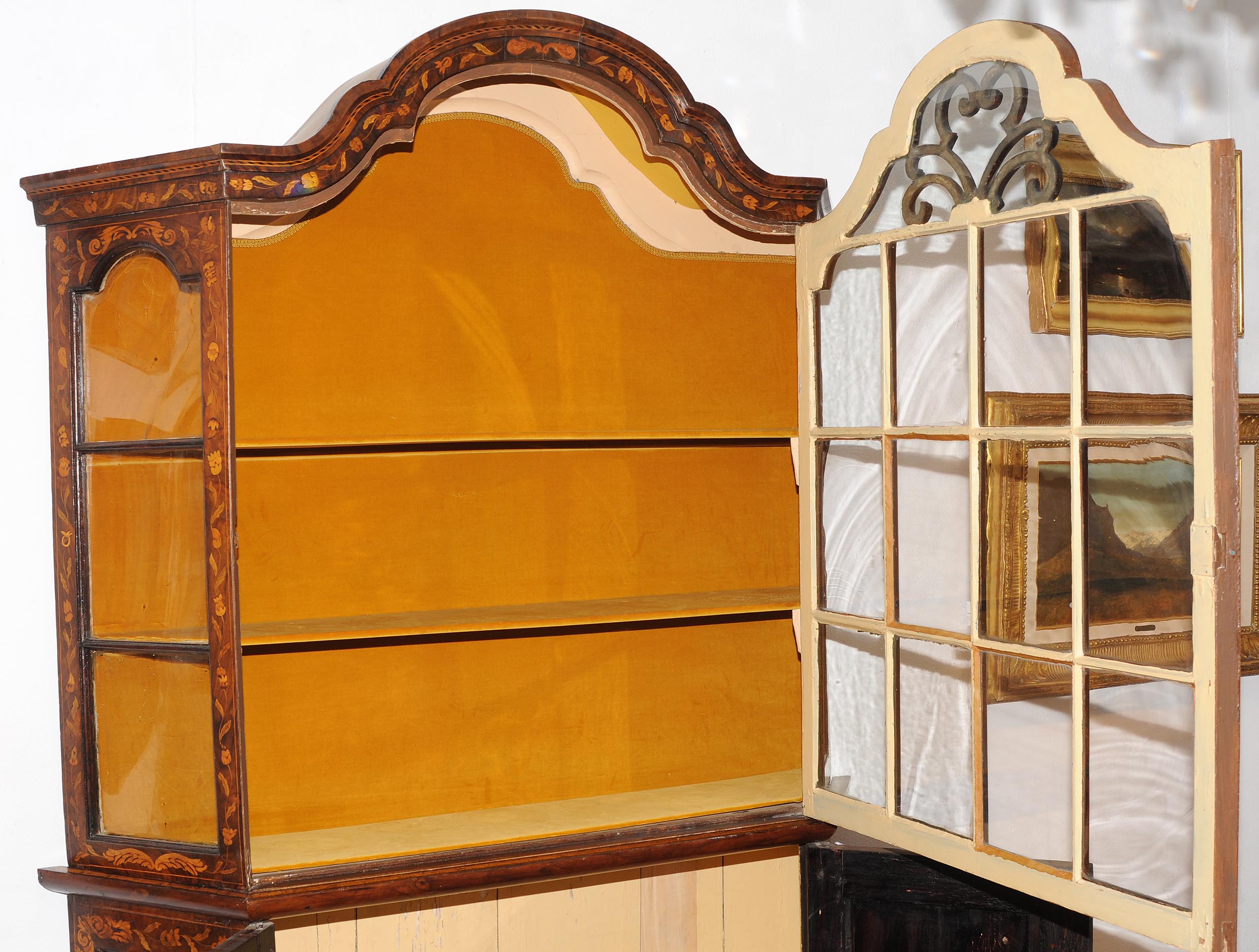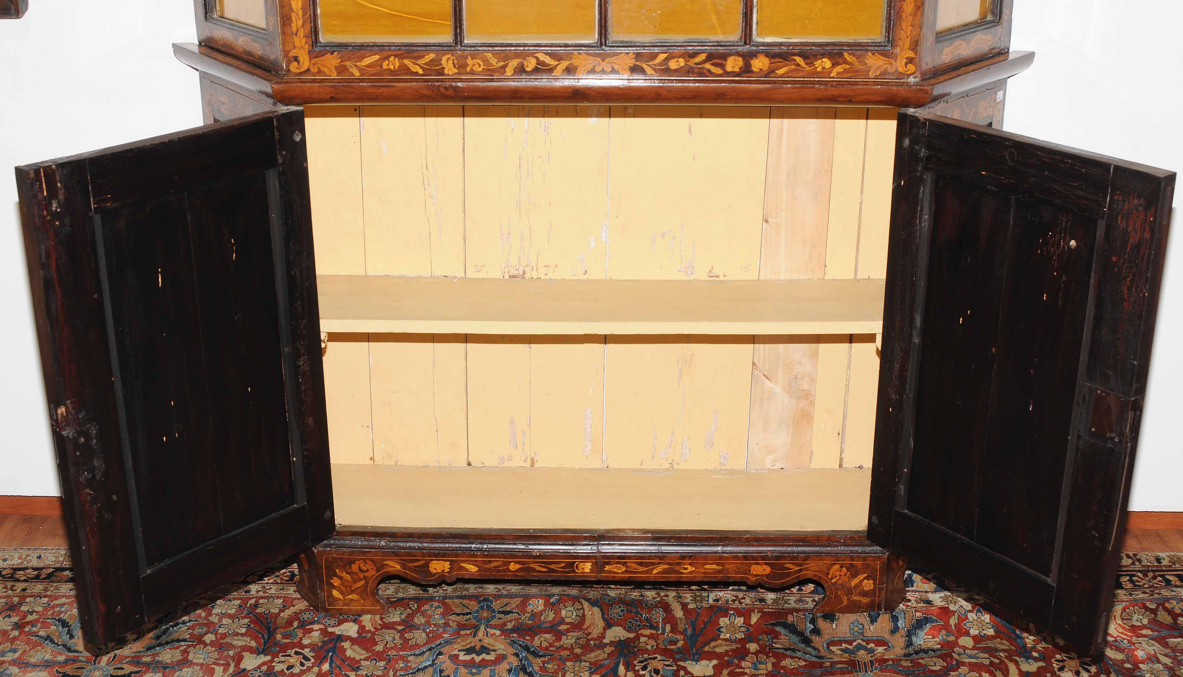 Holland. Barock. Nussbaum. Zweitüriger Unterbau mit schräggestellten Seiten. Eintürig, verglaster Aufsatz mit Giebelabschluss. Reich mit floralen Einlegearbeiten. Gebrauchsspuren. 136x30x207 cm.