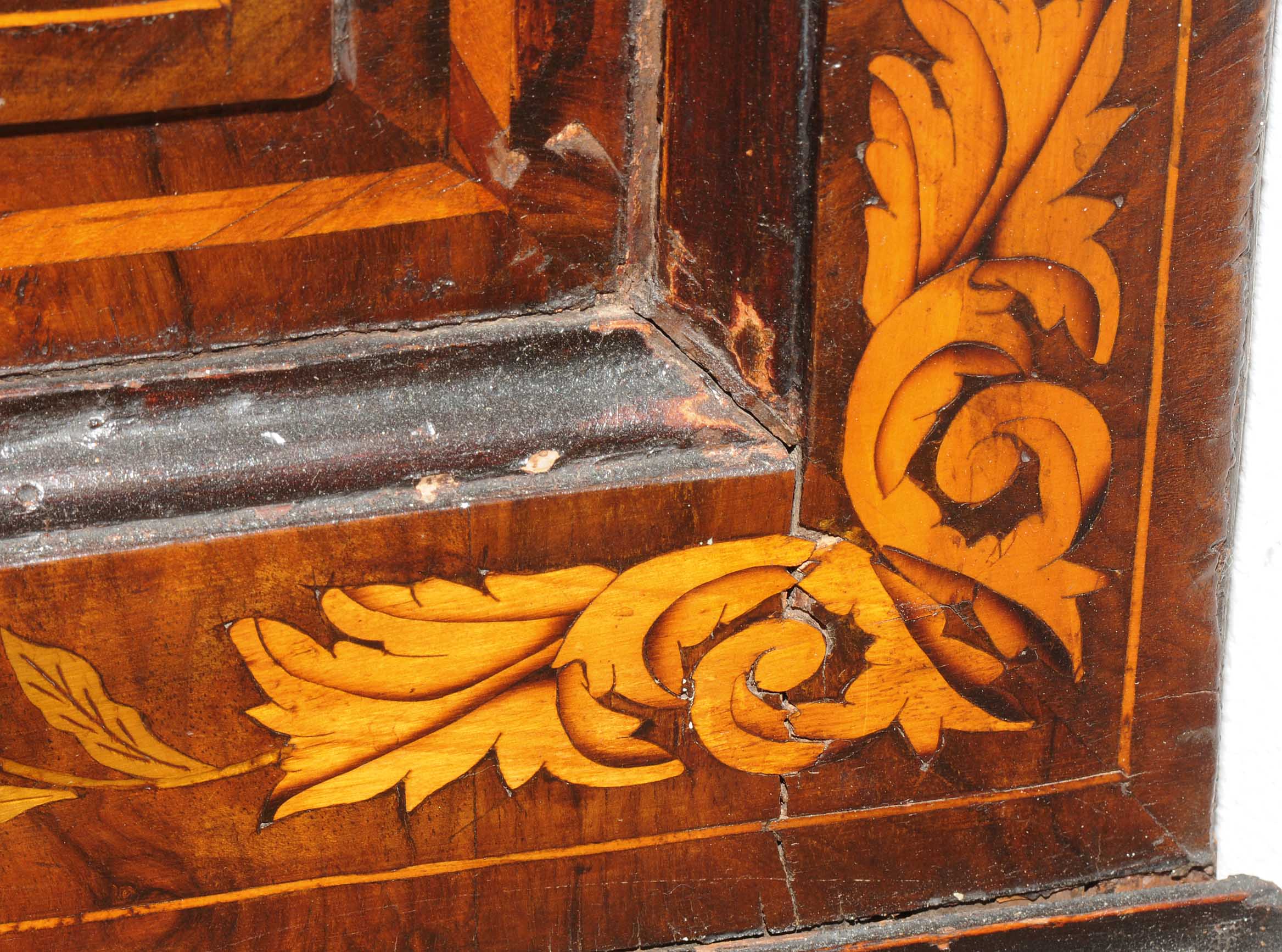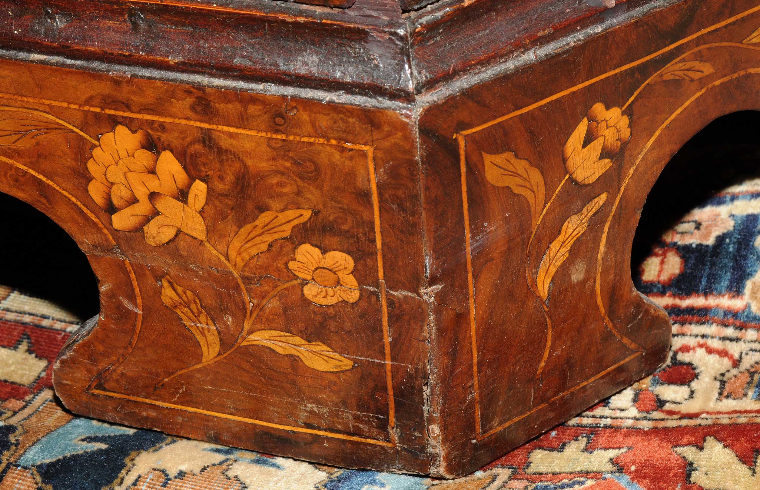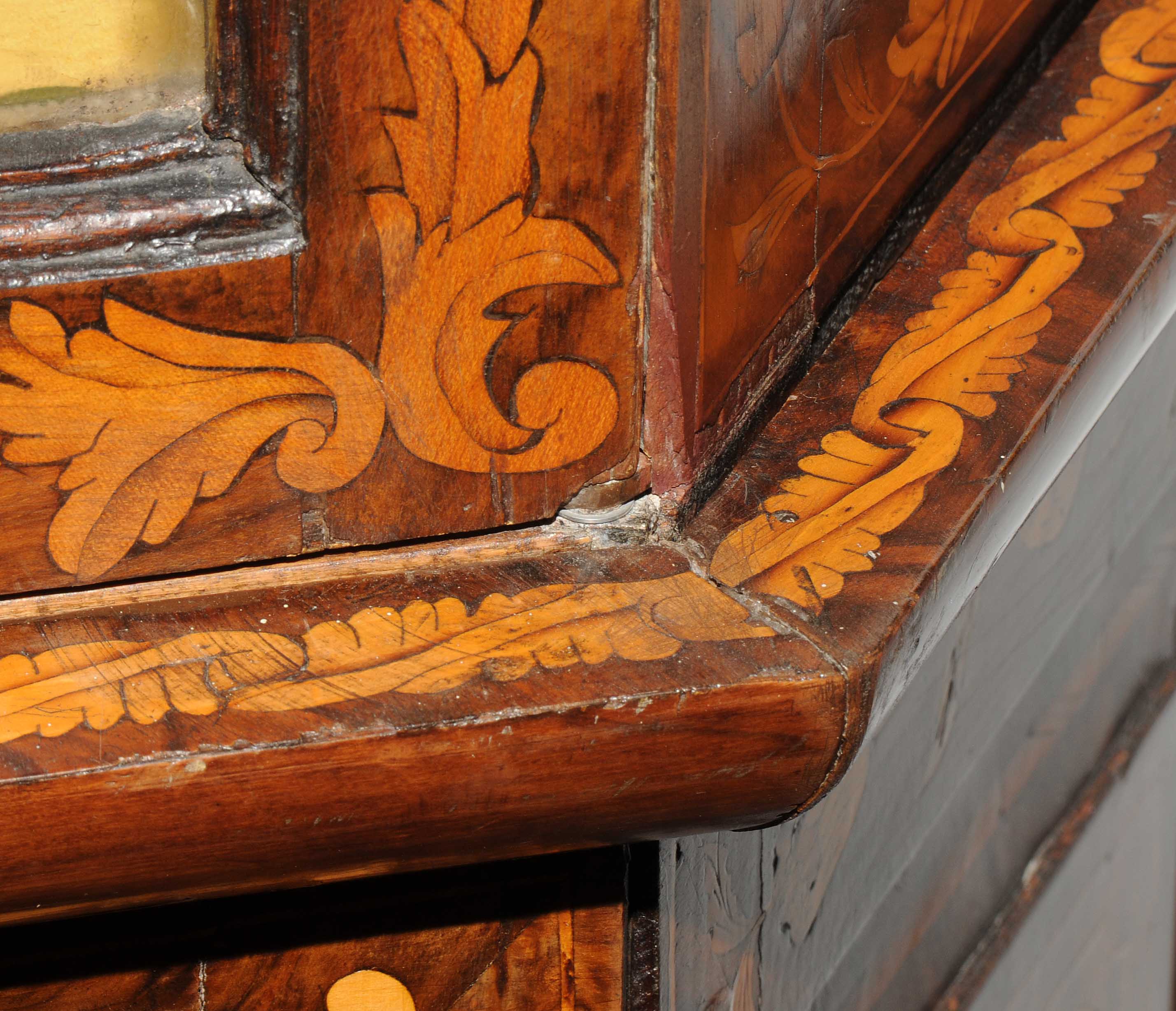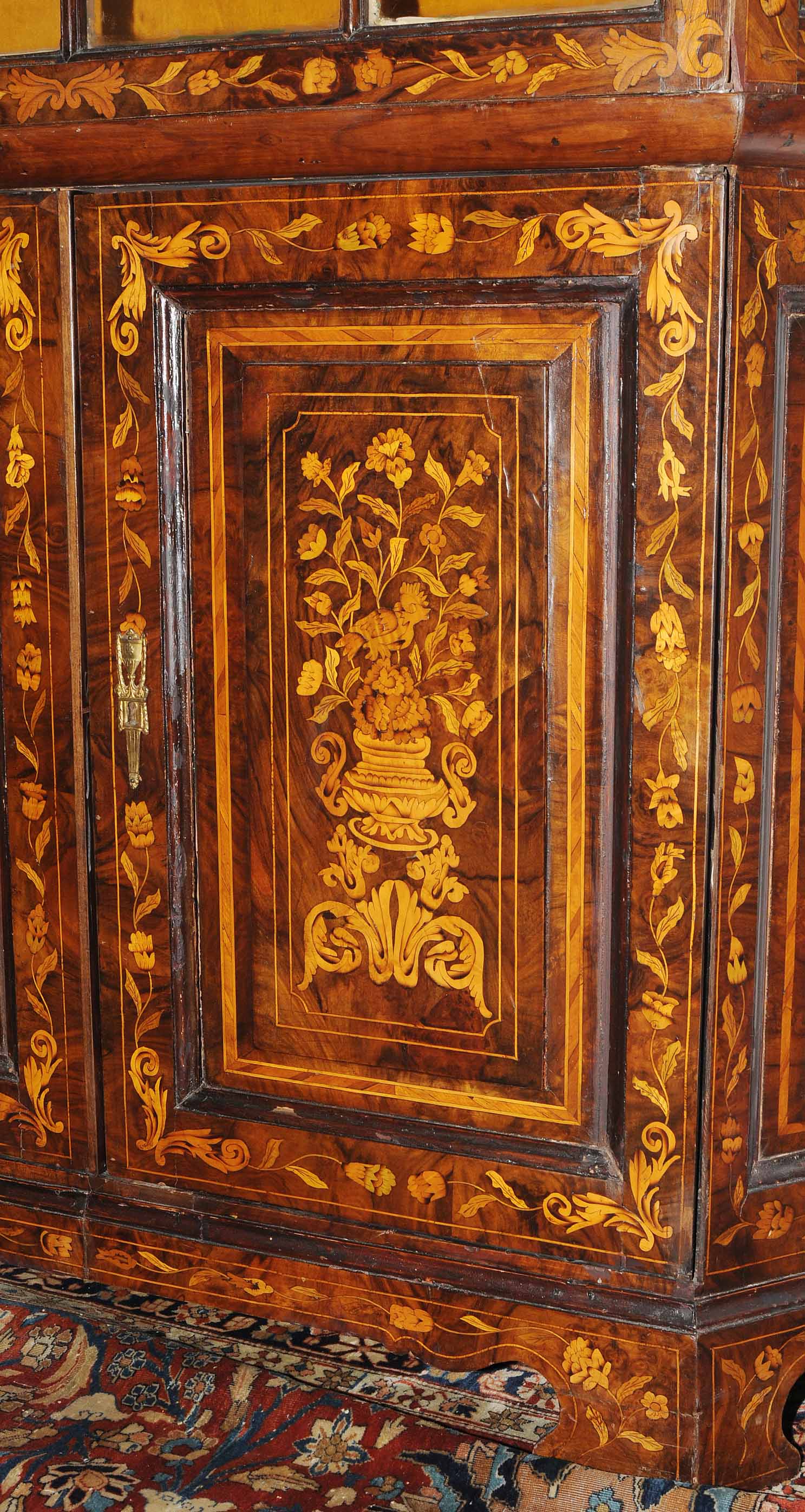 Holland. Barock. Nussbaum. Zweitüriger Unterbau mit schräggestellten Seiten. Eintürig, verglaster Aufsatz mit Giebelabschluss. Reich mit floralen Einlegearbeiten. Gebrauchsspuren. 136x30x207 cm.
