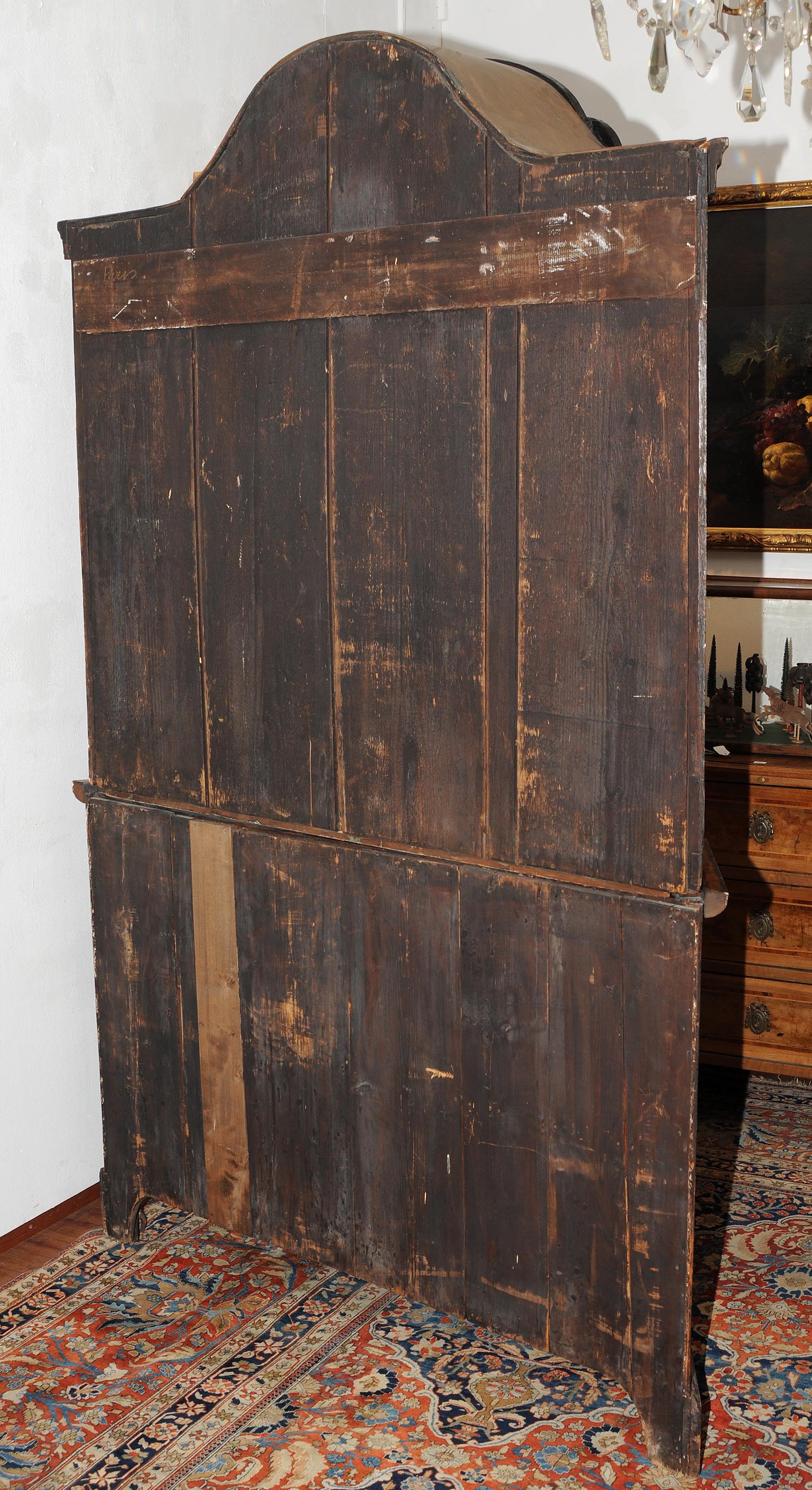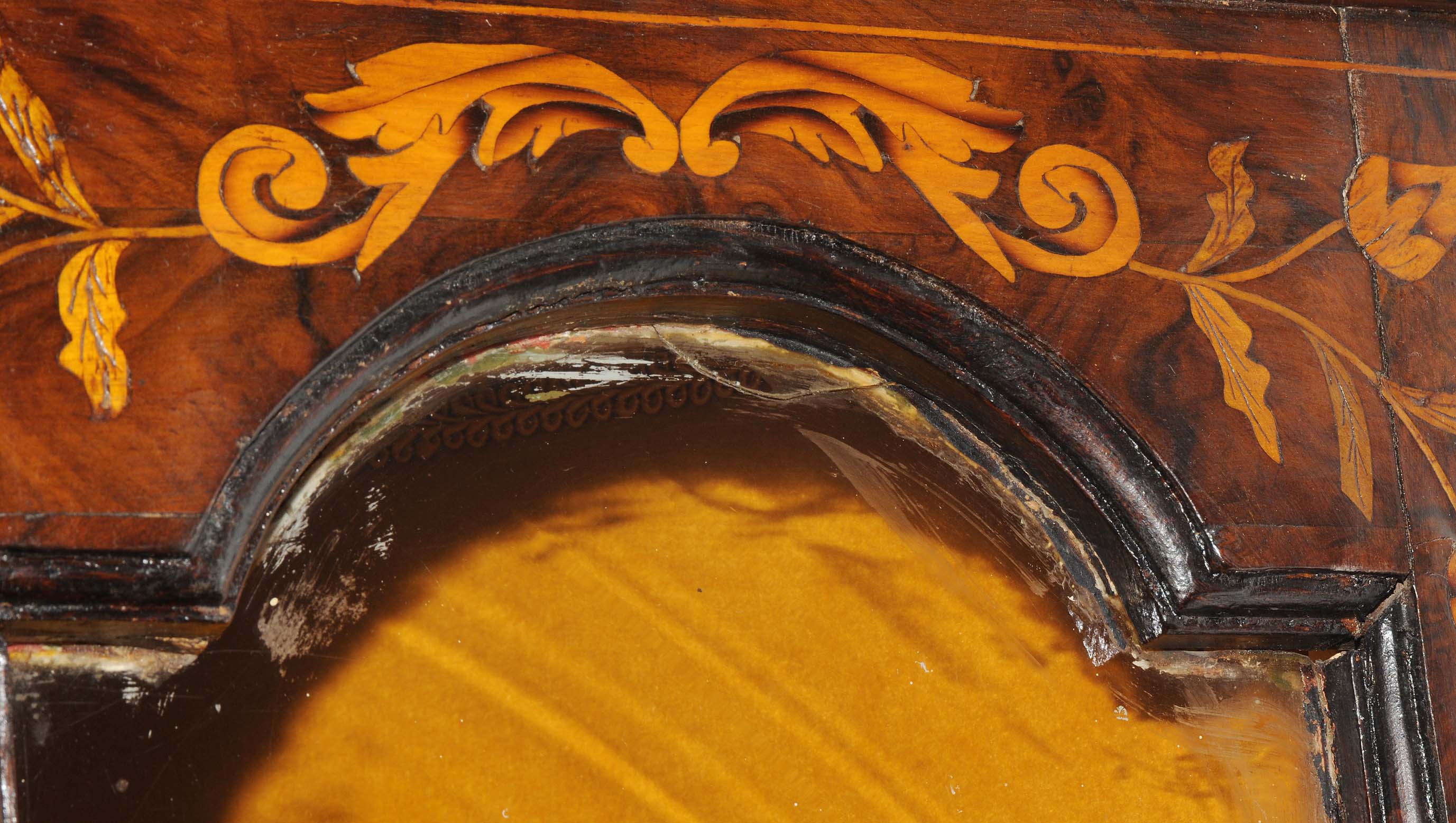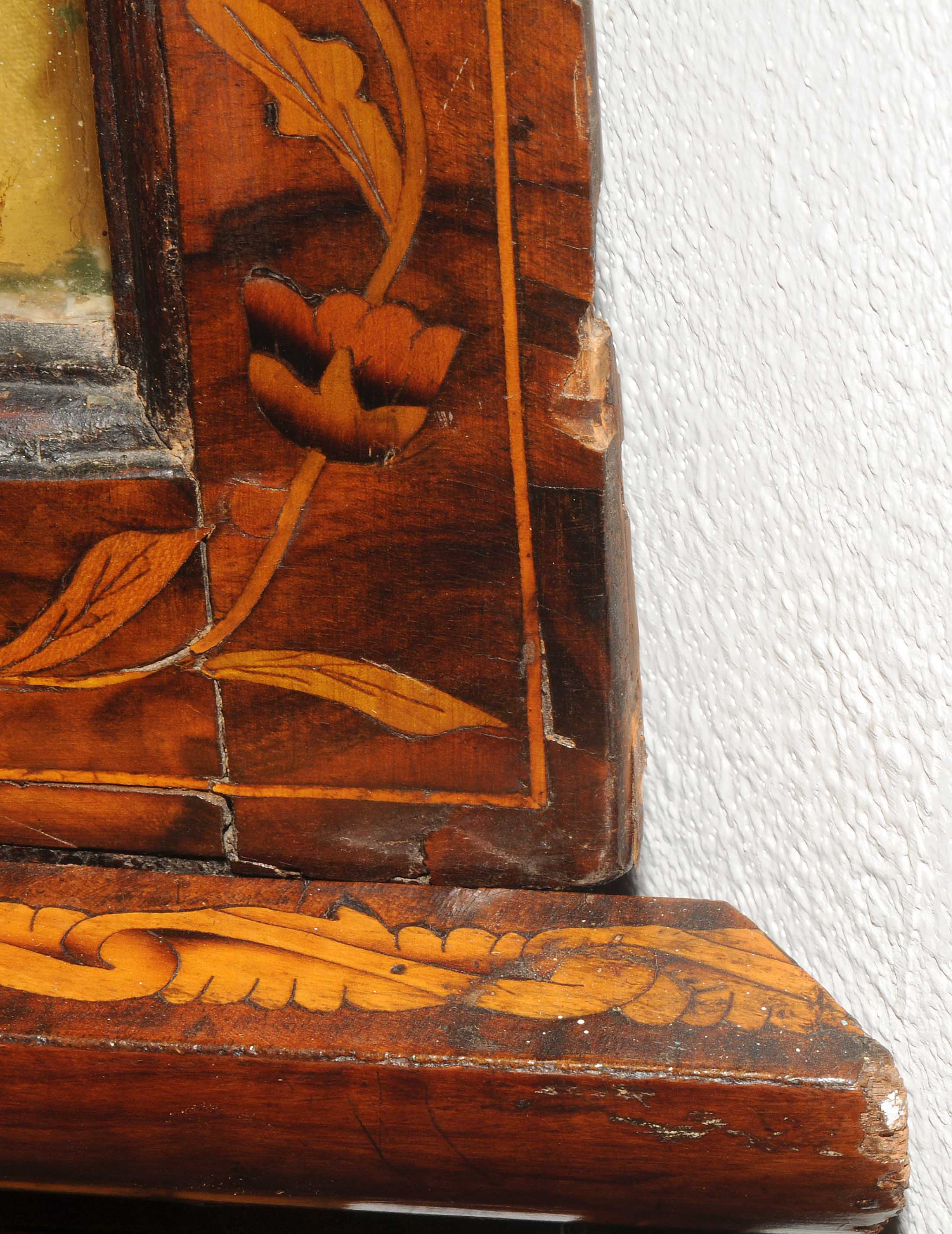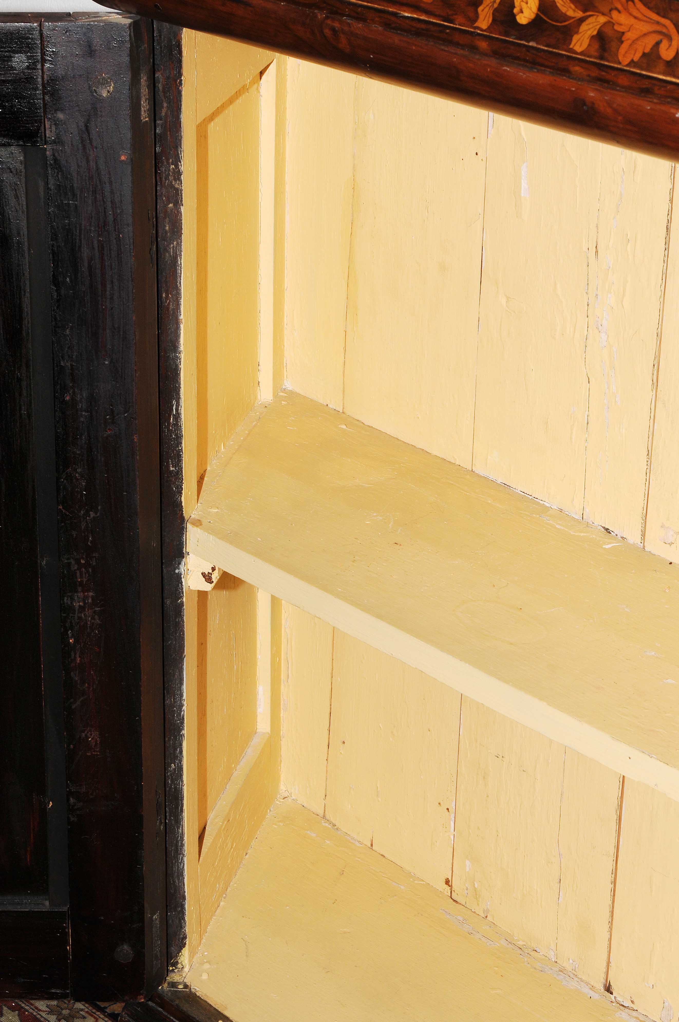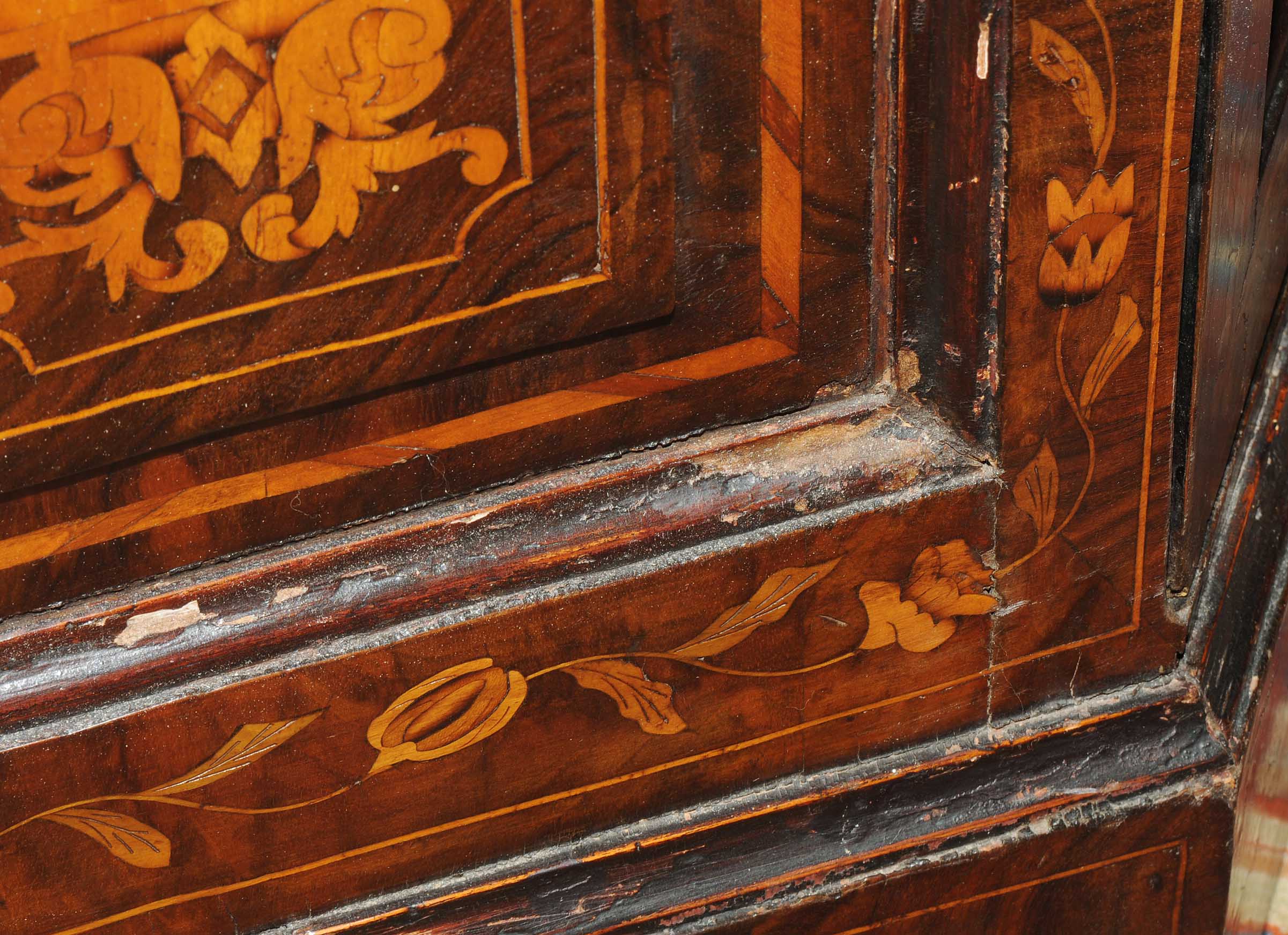 Holland. Barock. Nussbaum. Zweitüriger Unterbau mit schräggestellten Seiten. Eintürig, verglaster Aufsatz mit Giebelabschluss. Reich mit floralen Einlegearbeiten. Gebrauchsspuren. 136x30x207 cm.