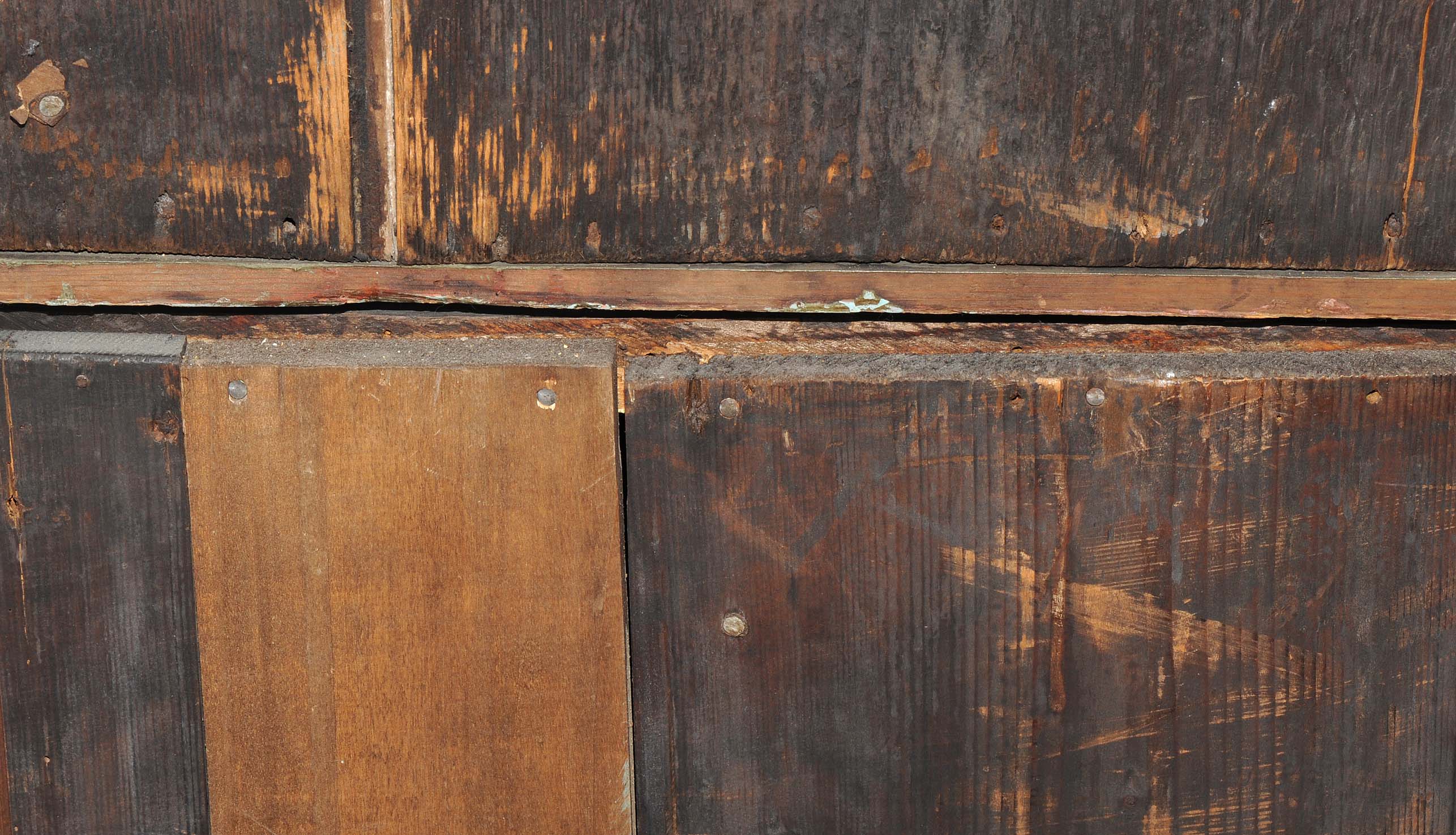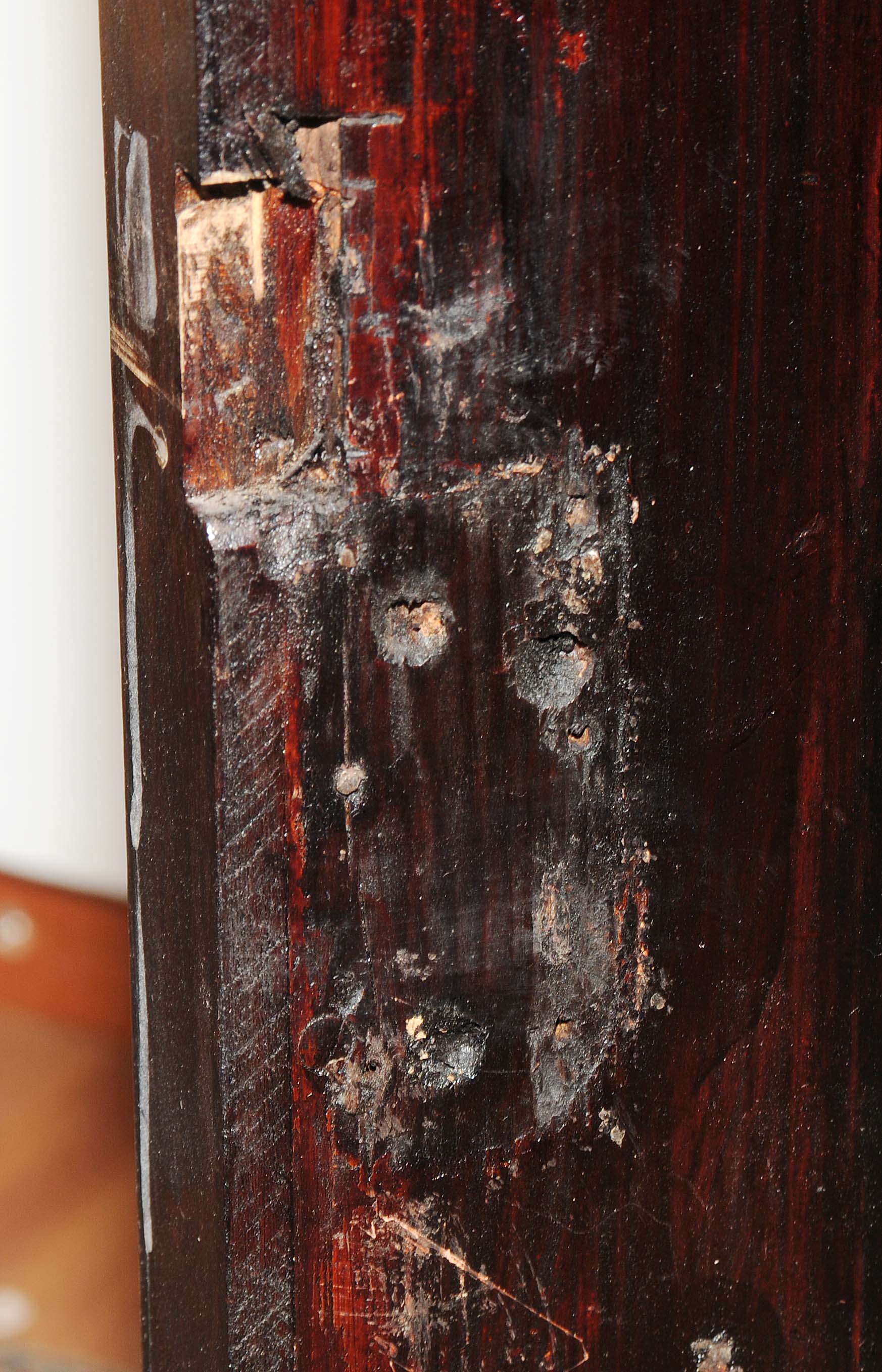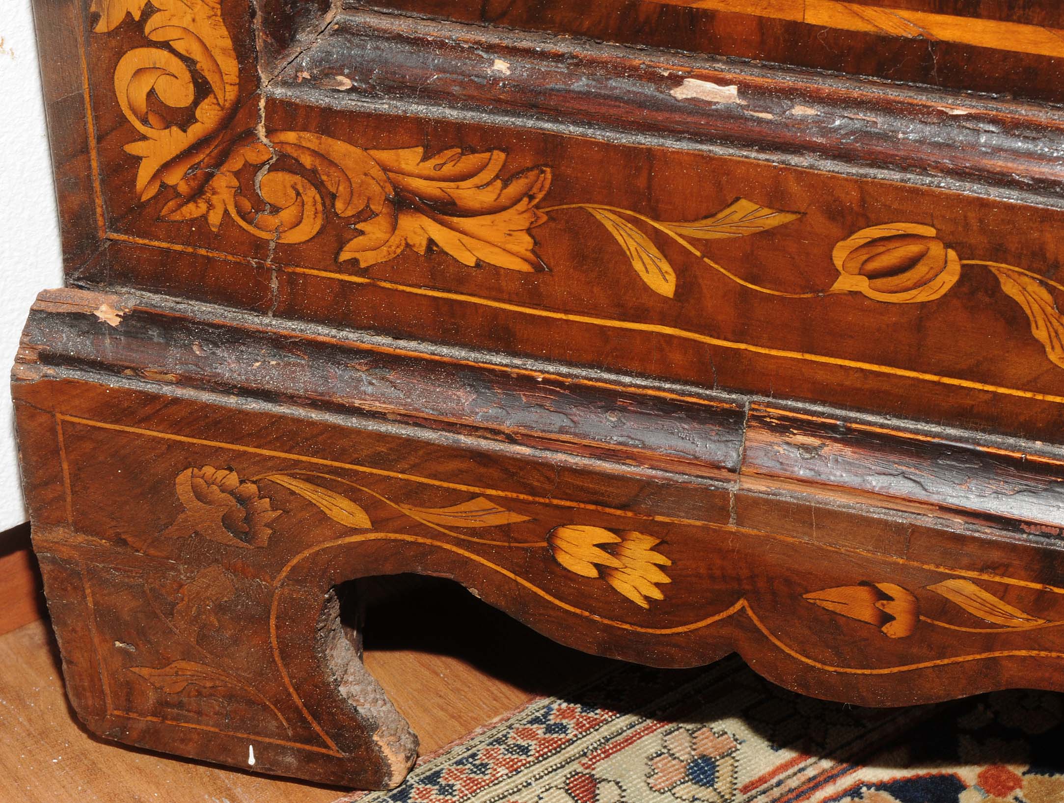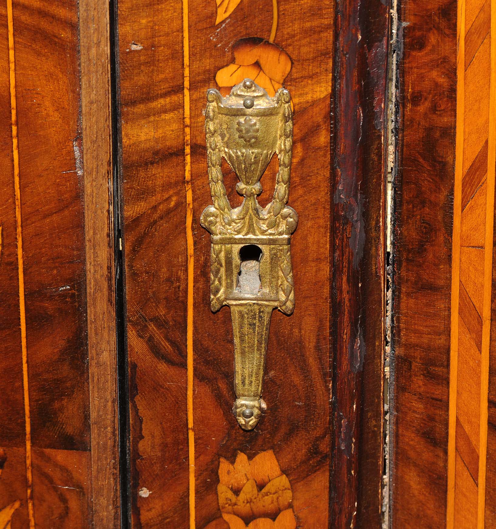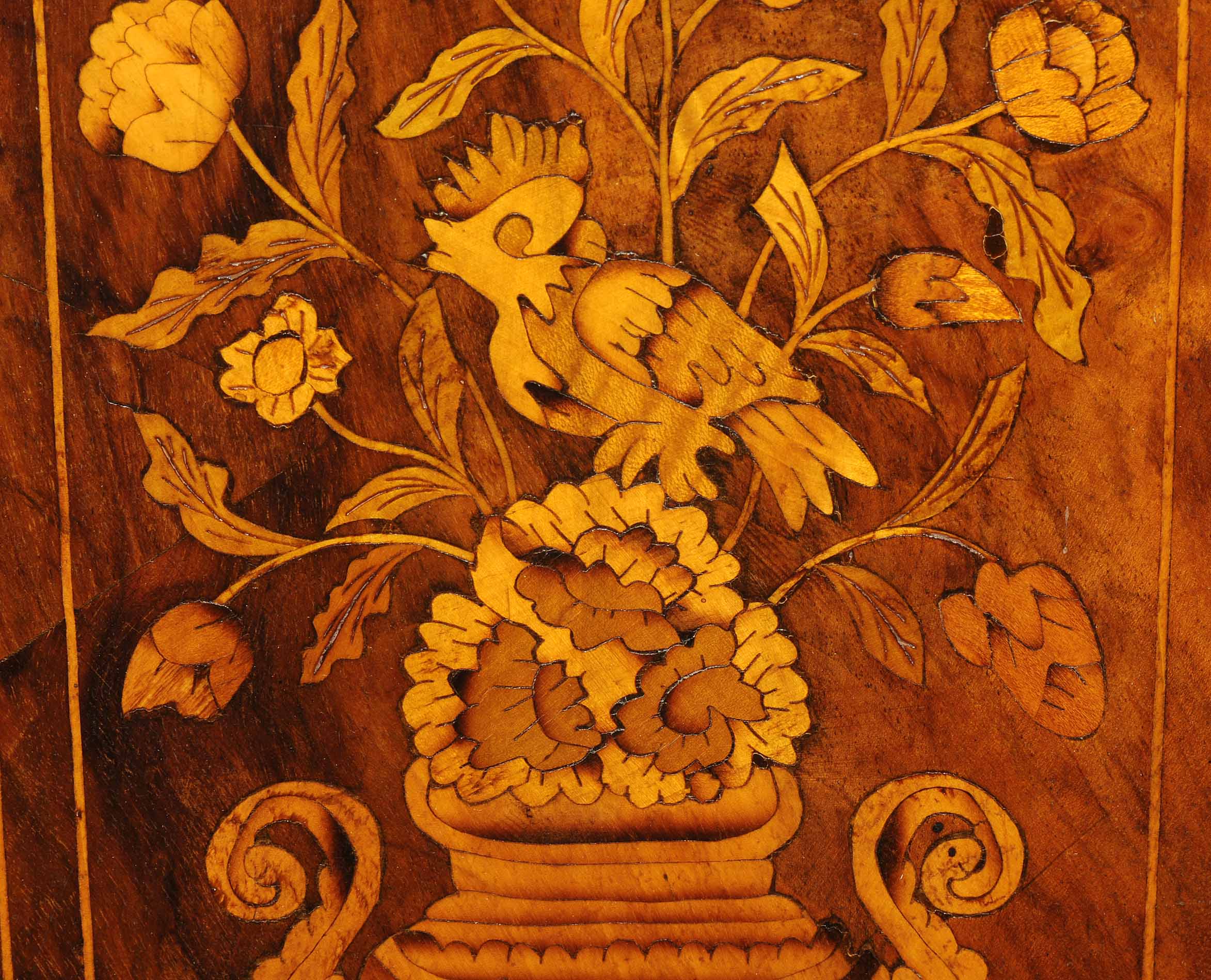 Holland. Barock. Nussbaum. Zweitüriger Unterbau mit schräggestellten Seiten. Eintürig, verglaster Aufsatz mit Giebelabschluss. Reich mit floralen Einlegearbeiten. Gebrauchsspuren. 136x30x207 cm.