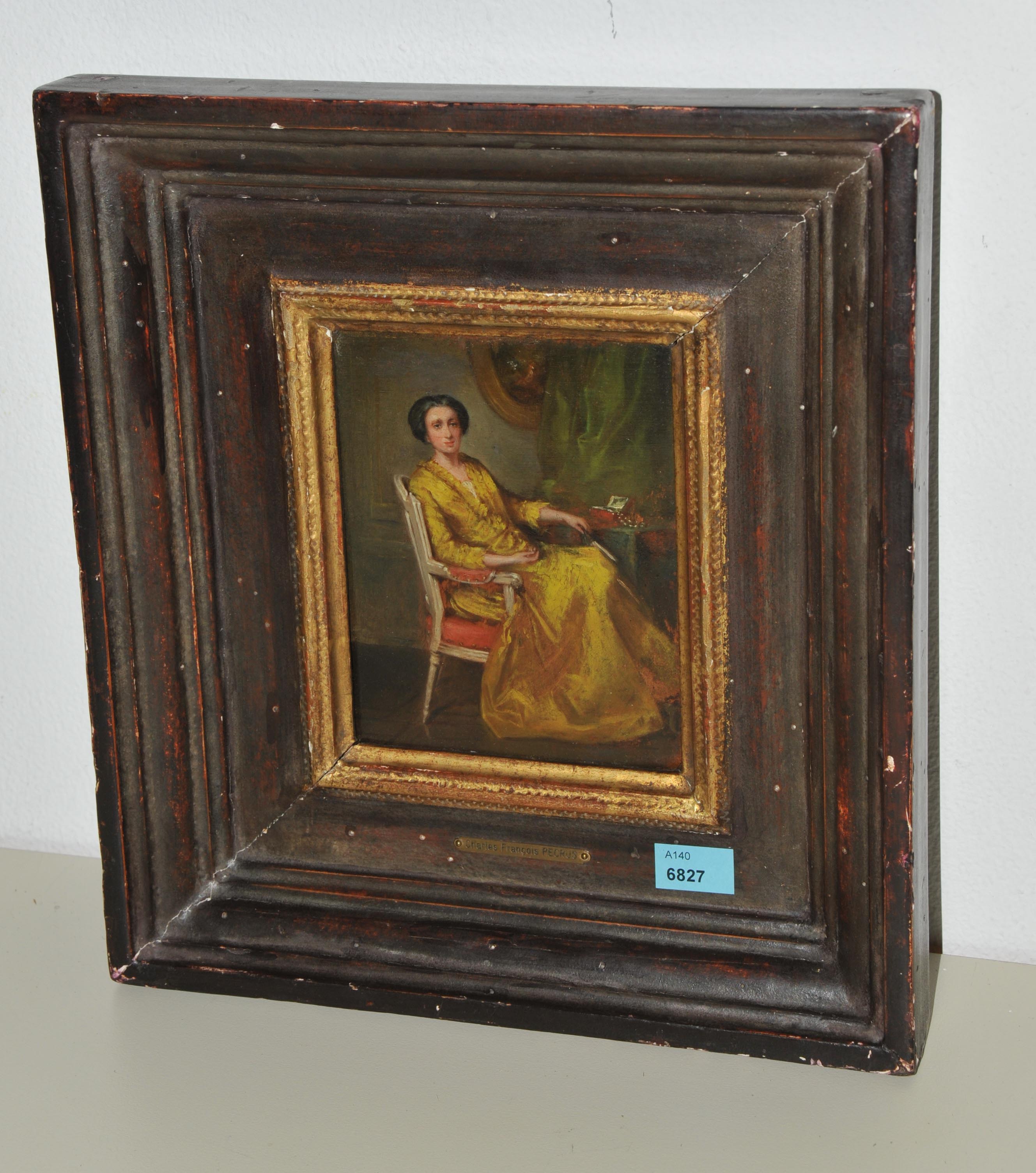 Elegante Dame in gelbem Kleid, in einem Fauteuil sitzend. Öl auf Holz. Unten links signiert. 14x11 cm.