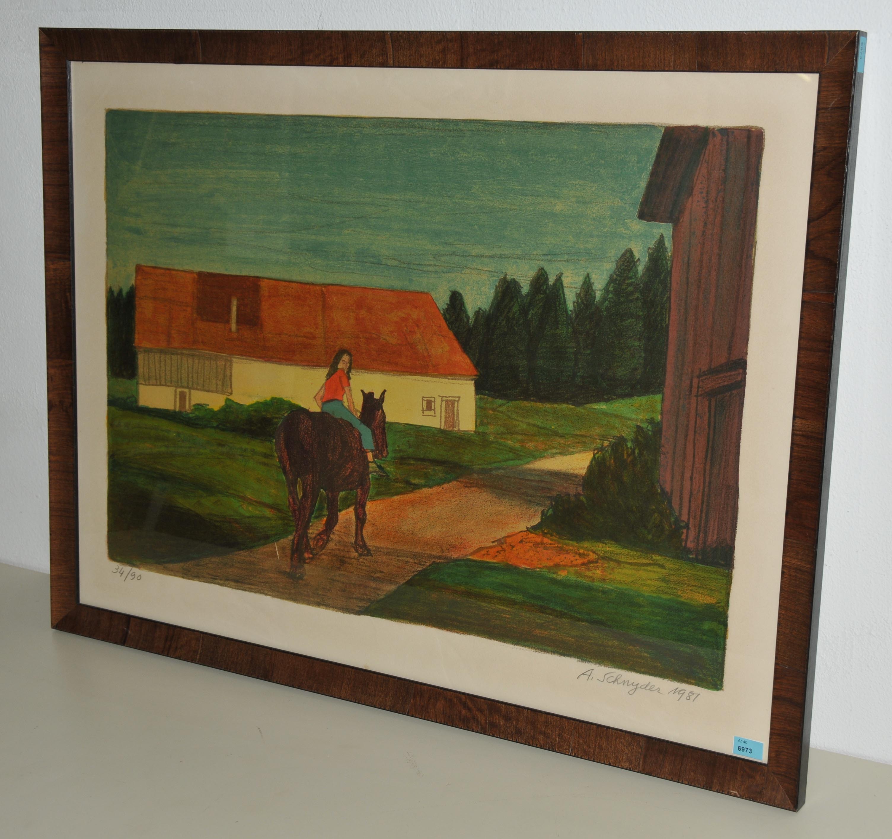Reiterin vor einem Hof. 1981. Farblithographie. 34/90. Unten rechts signiert und datiert. Lichtmass 54x75 cm. Gerahmt.