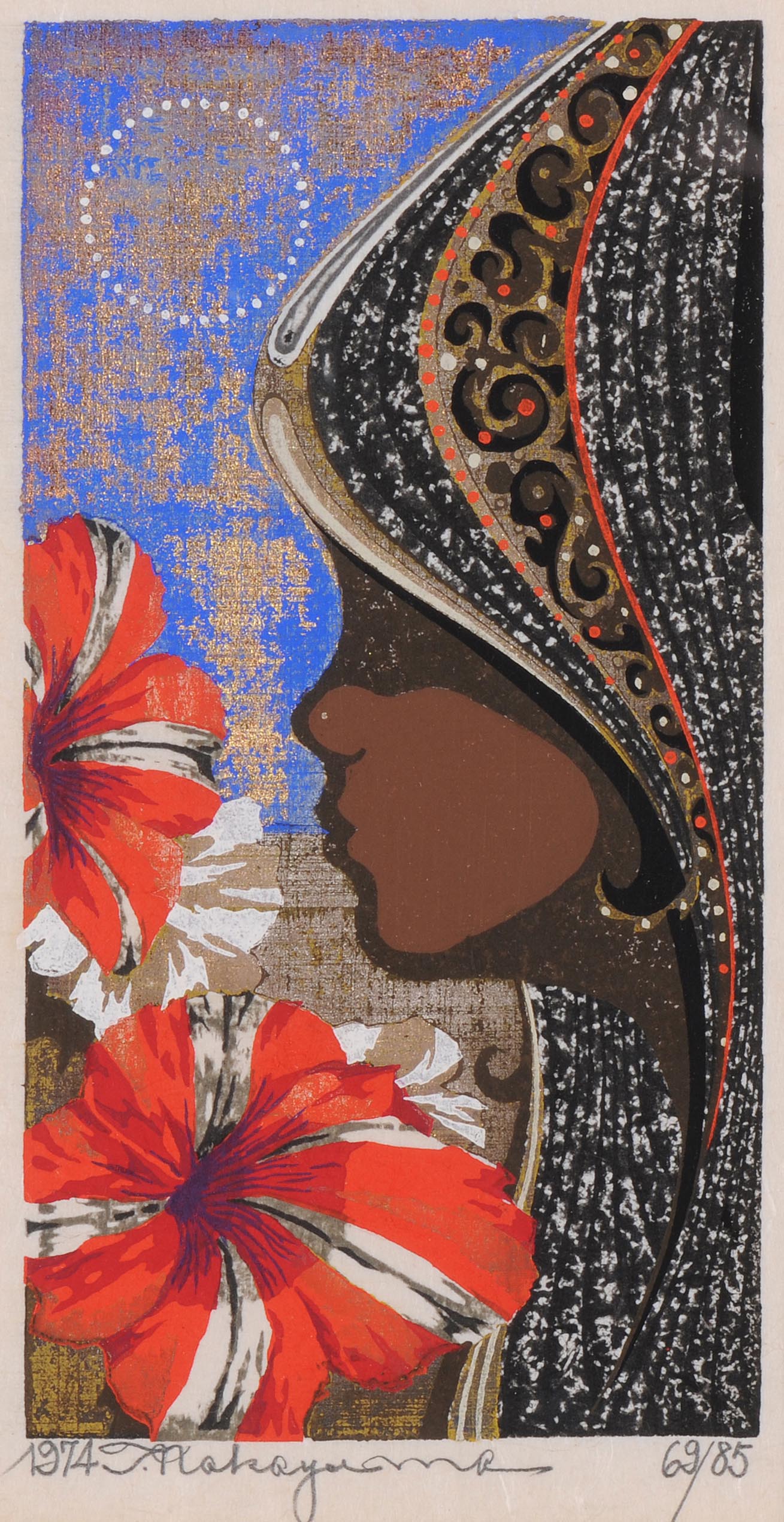 "Girl and Red Flowers (Petunias)". 1974. Farbholzschnitt, Sosaku-Hanga. 69/85. Unten mit Bleistift datiert, signiert und nummeriert. Verso Nakayama auf Japanisch mit rotem Siegel. Rand mit Verfärbung. Leimband spuren. Blattgrösse 35x25 cm. Gerahmt.